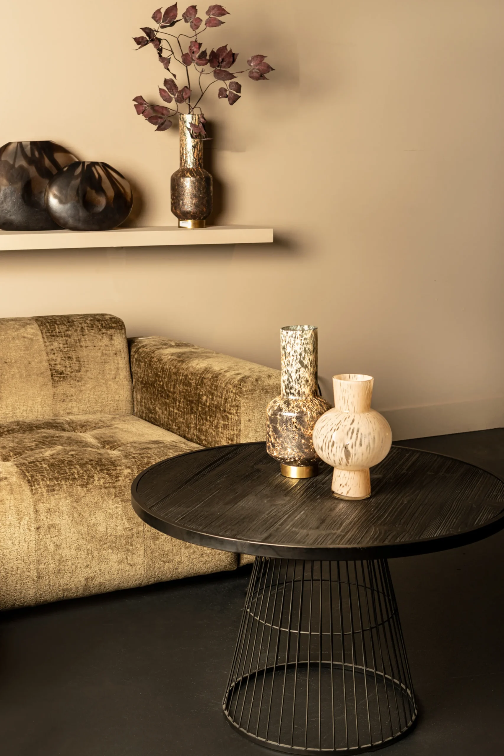 Dieser Beistelltisch wirkt schon fast dezent, aber durch seinem Kegelfuß aus schwarzen feinen Metallstäben und vor allem mit seiner strukturierten schwarzen Holzplatte, zieht er die Blicke auf sich. Der Tisch hat auf jeden Fall ein Wow-Effekt und verleiht dem Raum sofort einen Hauch von Glamour. Er bietet mit einem Durchmesser von 80 cm ausreichend Ablagefläche für Bildbände, Bücher und Dekoration und natürlich auch für Kaffetasse oder Aperitiv.