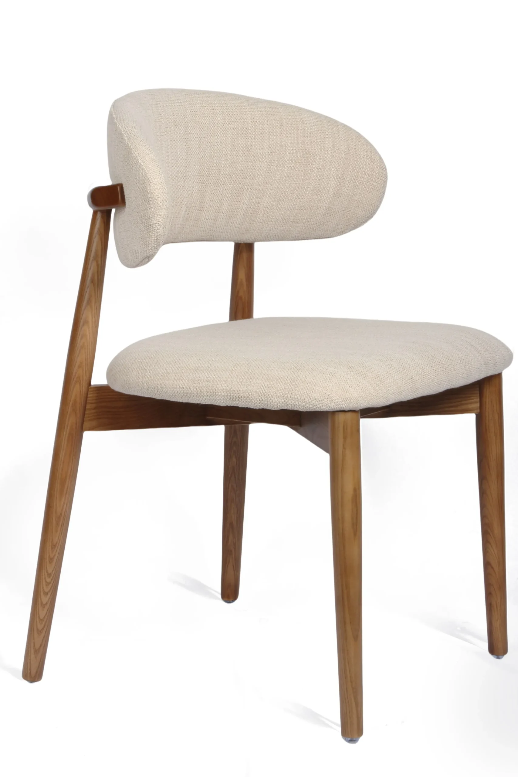Passend dazu präsentieren sich die Stühle als stilvolle Begleiter. Ihr Gestell aus Eschenholz setzt den natürlichen Charakter des Tisches fort, während die sanft geschwungenen Lehnen subtil an skandinavisches Design erinnern. Der Bezug aus einem hochwertigen Baumwoll-Leinen-Gemisch bietet nicht nur angenehmen Sitzkomfort, sondern bringt auch eine zurückhaltende, textile Eleganz in den Raum. Die sanfte Farbgebung des Stoffes lässt sich mühelos mit verschiedensten Einrichtungsstilen kombinieren – ob minimalistisch, modern oder klassisch.