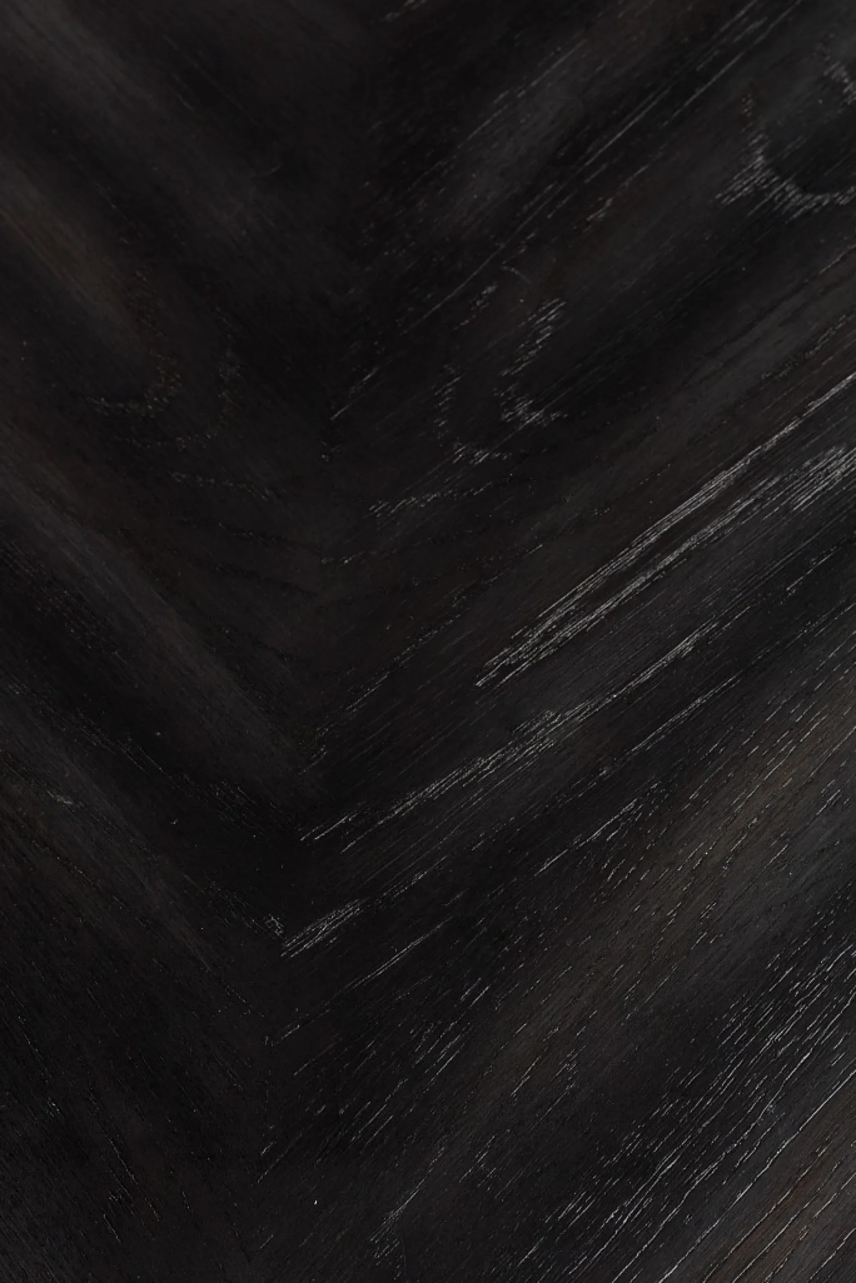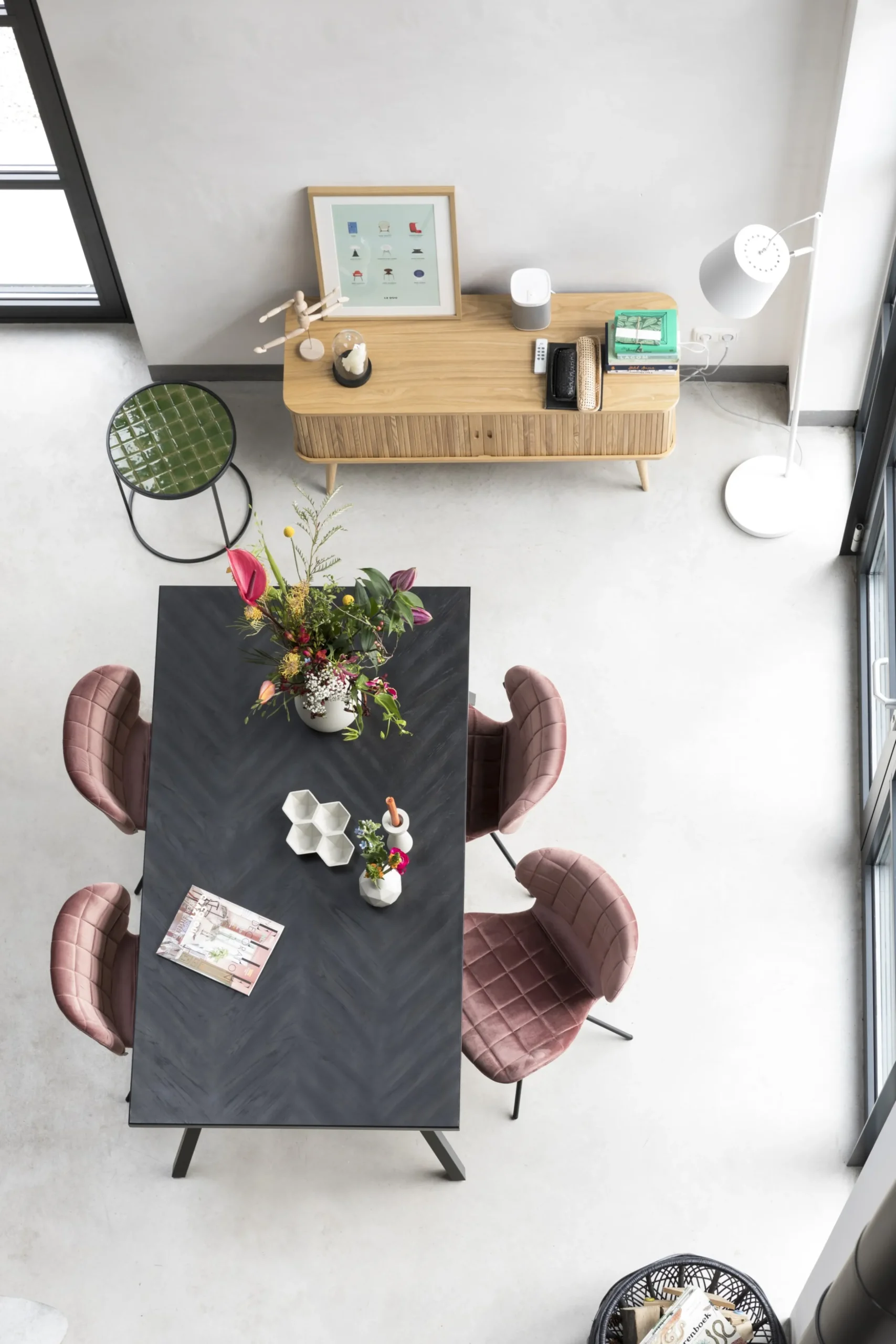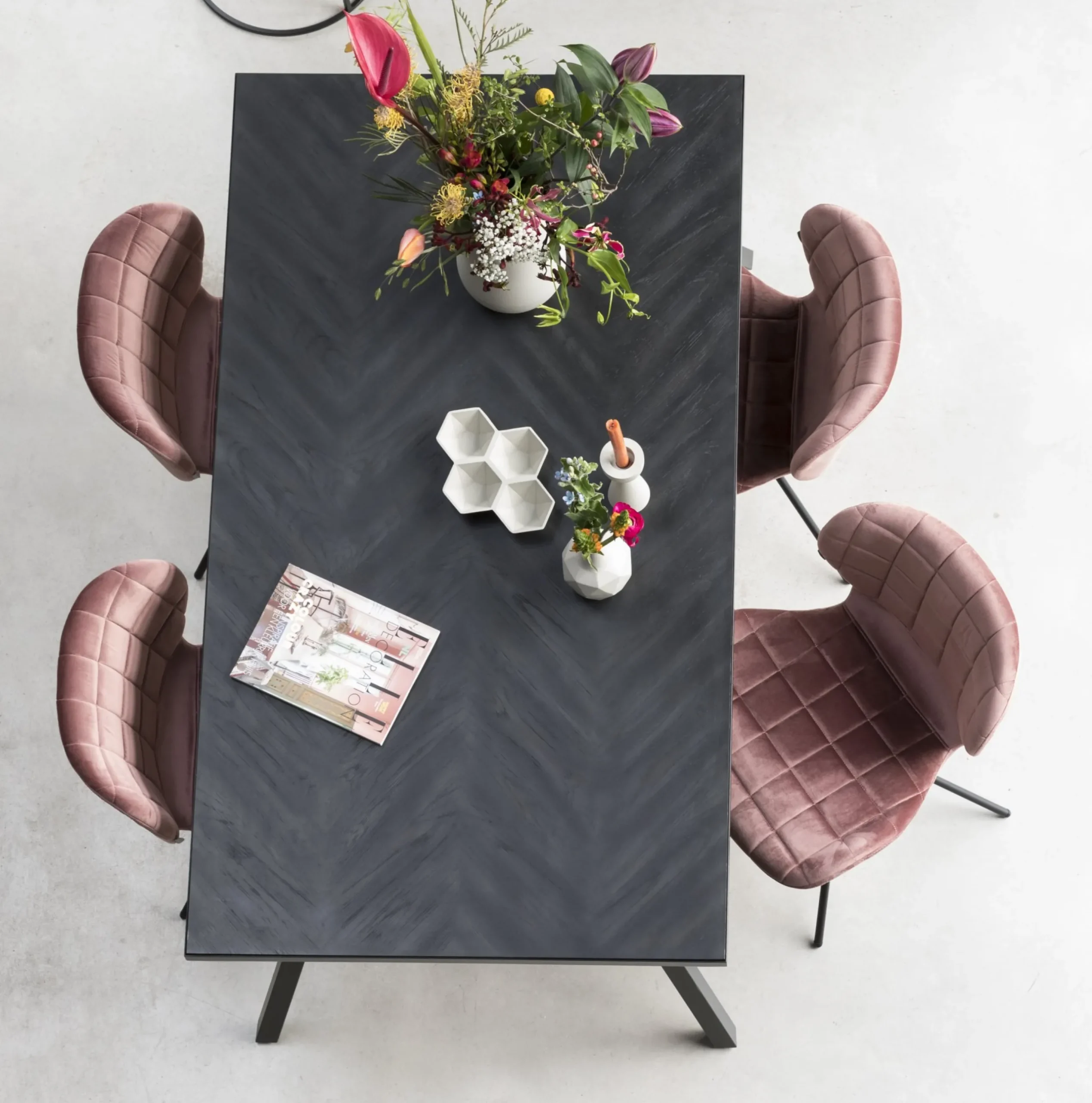 Der Esstisch Seth besticht mit seiner im Parkettstil gearbeiteten Oberfläche. Die Parkettstäbe wurden hier im Fischgrätenmuster zu einer Tischplatte gearbeitet. Dies ist ein klassisches Muster, zwei Hölzer werden hier im rechten Winkel gegeneinander versetzt. Er verfügt über vier unverwechselbare Metallbeine auf denen die schwarze Holzplatte mit Parkettmuster liegt. Die Tischplatte ist mit einem schwarz lackierten Metallrahmen umsehen, was eine ausgefallene Idee des Designer ist. Der Esstisch wirkt filigran und liegt mit seiner Kombination aus Metall und Holz ganz im Trend. Das dunkle Holz lässt sich wunderbar mit hellen und bunten Stühlen kombinieren, doch auch kühle Metallstühle wirken bei dem Zuivertisch Seth ungemein gut.