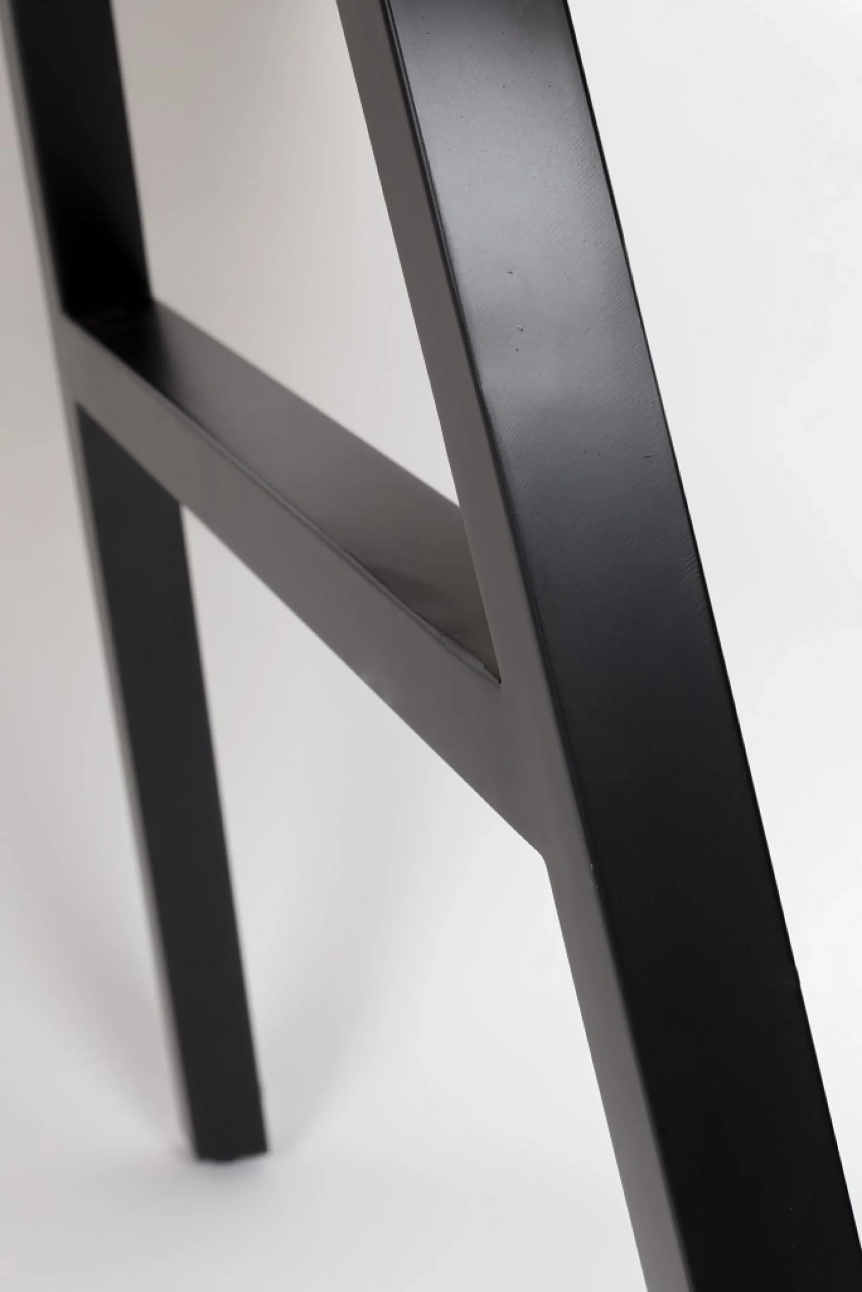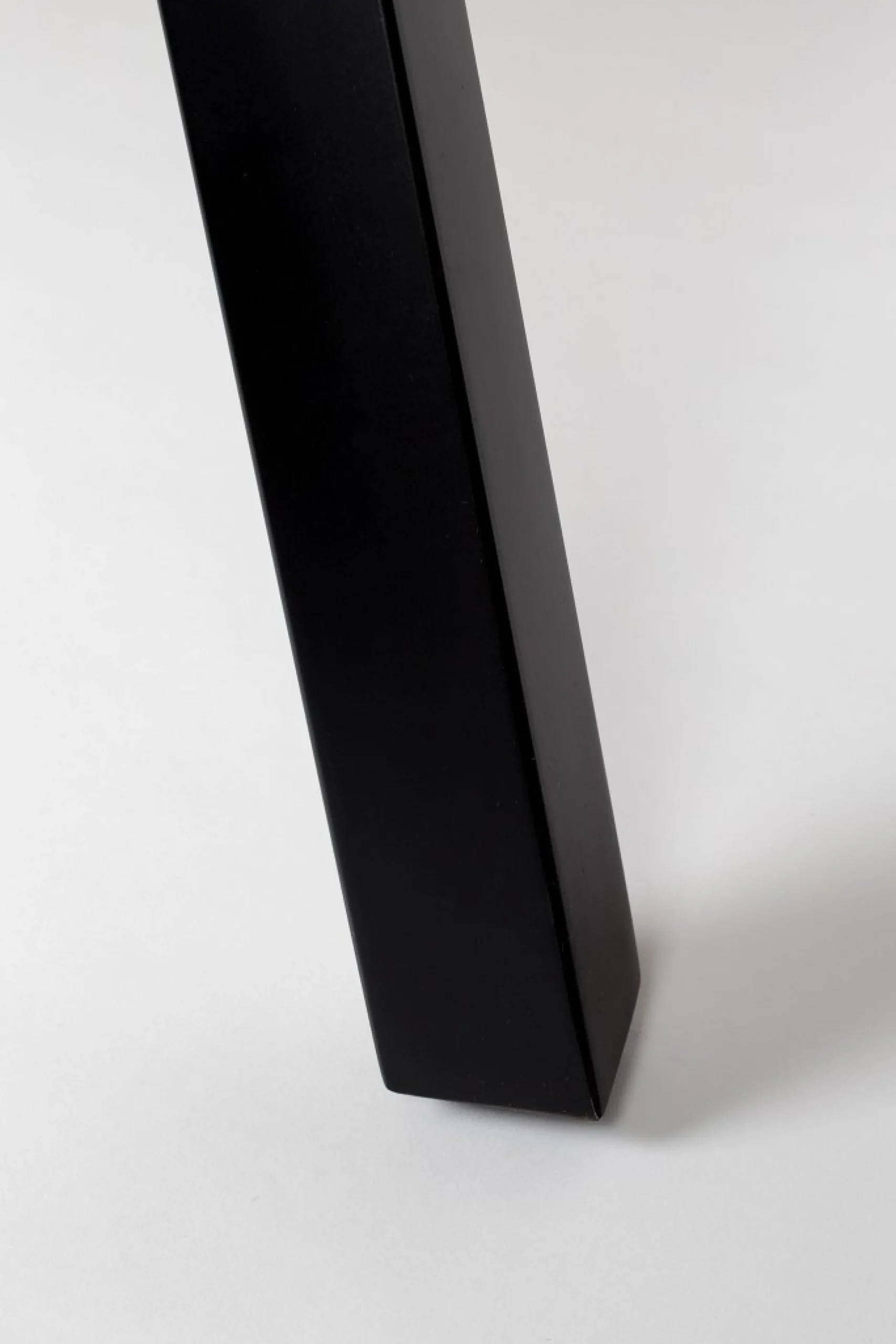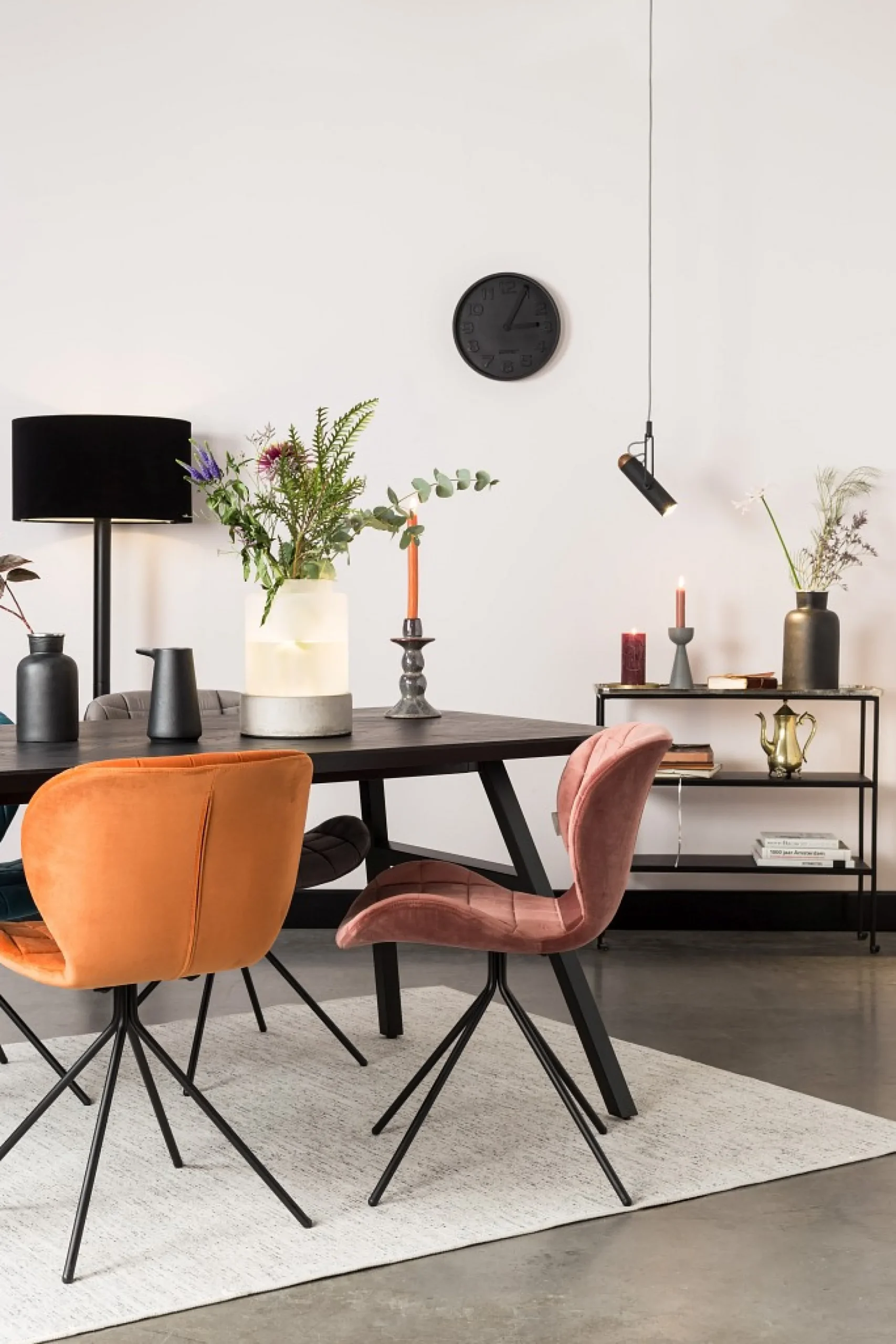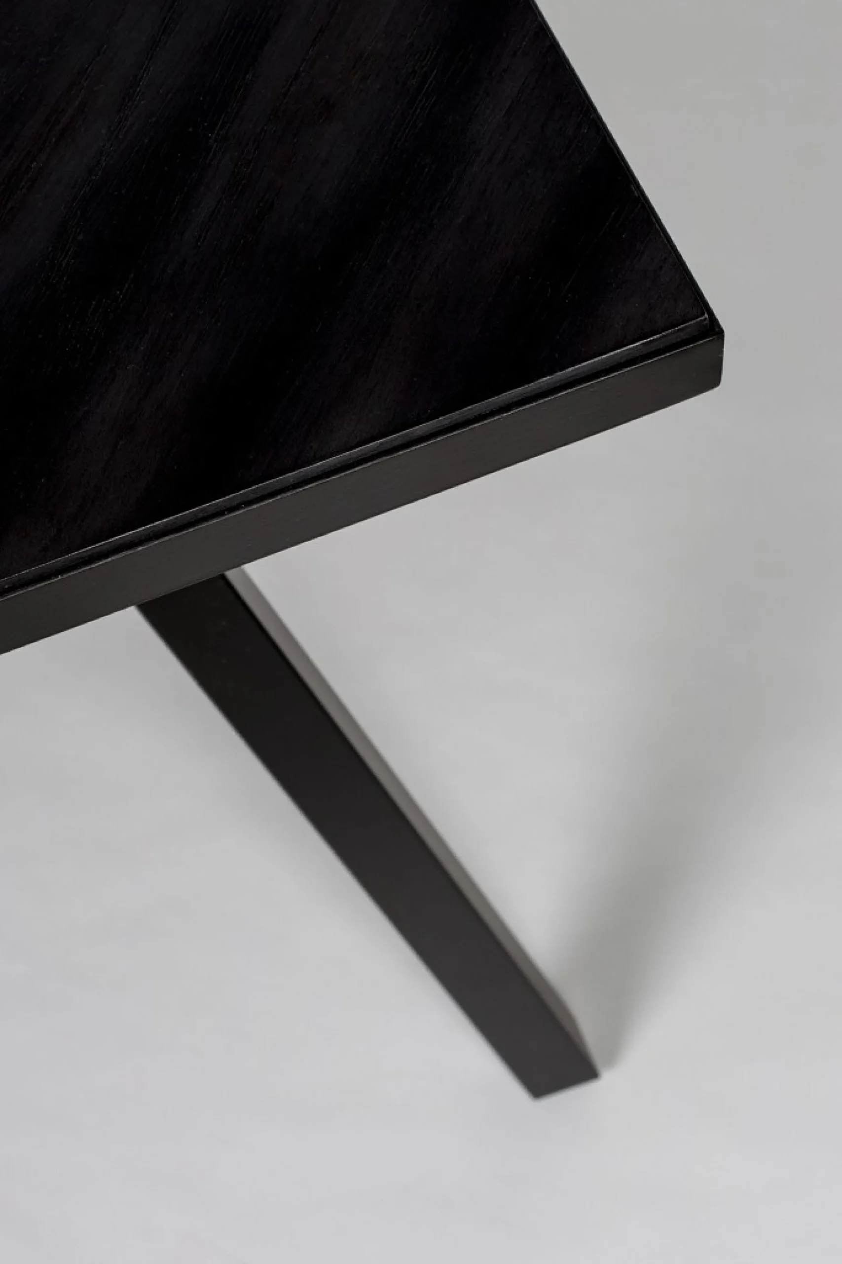 Der Esstisch Seth besticht mit seiner im Parkettstil gearbeiteten Oberfläche. Die Parkettstäbe wurden hier im Fischgrätenmuster zu einer Tischplatte gearbeitet. Dies ist ein klassisches Muster, zwei Hölzer werden hier im rechten Winkel gegeneinander versetzt. Er verfügt über vier unverwechselbare Metallbeine auf denen die schwarze Holzplatte mit Parkettmuster liegt. Die Tischplatte ist mit einem schwarz lackierten Metallrahmen umsehen, was eine ausgefallene Idee des Designer ist. Der Esstisch wirkt filigran und liegt mit seiner Kombination aus Metall und Holz ganz im Trend. Das dunkle Holz lässt sich wunderbar mit hellen und bunten Stühlen kombinieren, doch auch kühle Metallstühle wirken bei dem Zuivertisch Seth ungemein gut.