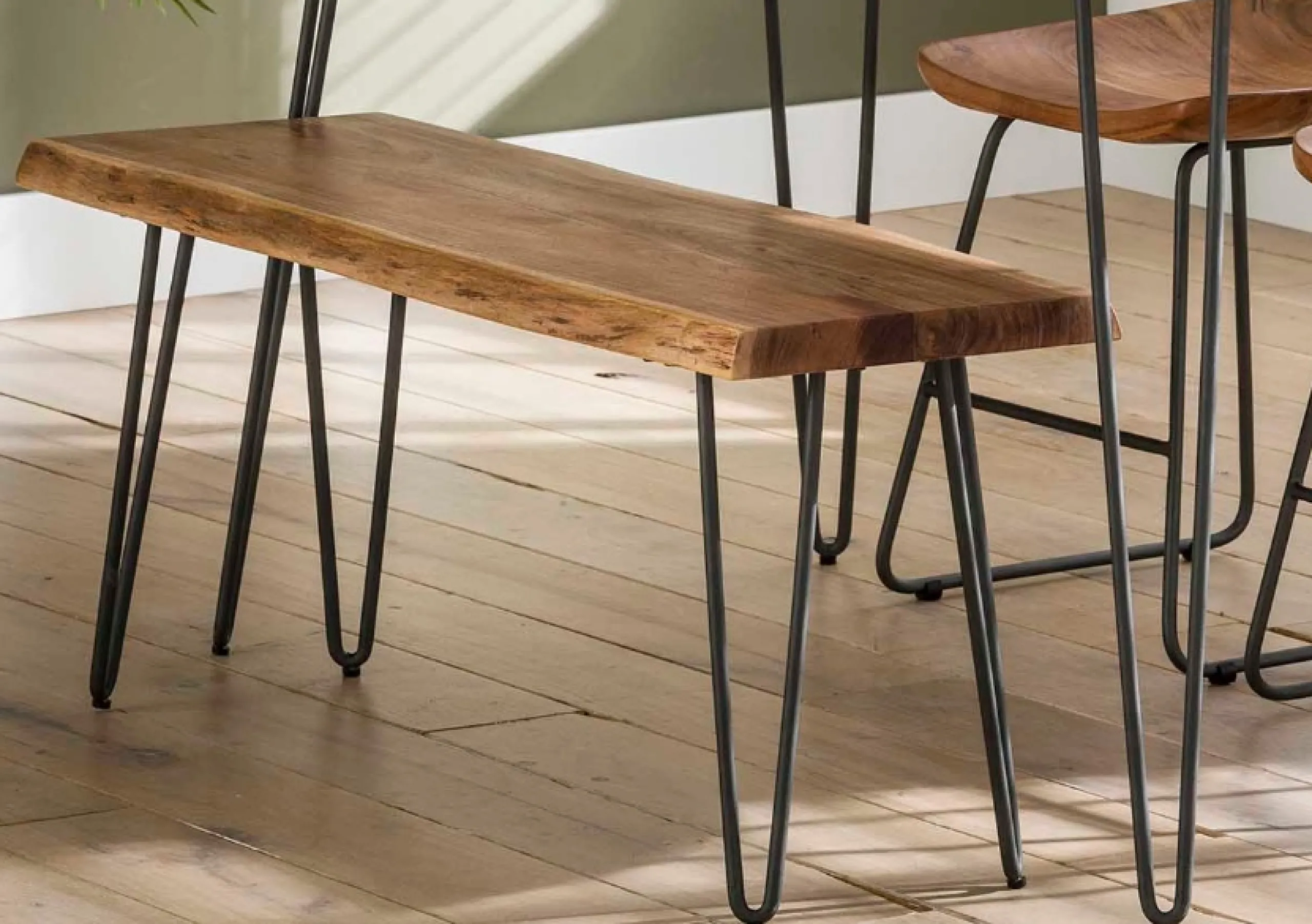 Die Holzbank Palu ist der ideale Begleiter für Ihre Küche oder das Esszimmer. Durch ihre Größe bietet sie Platz für 2 Personen und verbreitet den Flair eines Cafes. Das Material und Design kommt im Industrial Look daher. Die wunderbar typische Akazienholzmaserung, sowie die Baumkantenform, machen diese Bank zu einem individuellen Industrial Stück. Die Sitzfläche ist lackiert, was sie unempfindlich gegen Feuchtigkeit und Schmutz macht. Die schwarzen pulverbeschichteten Haarnadelbeine sorgen durch ihr Design dafür, dass die schwere massive Platte eine gewisse Leichtigkeit erhält.