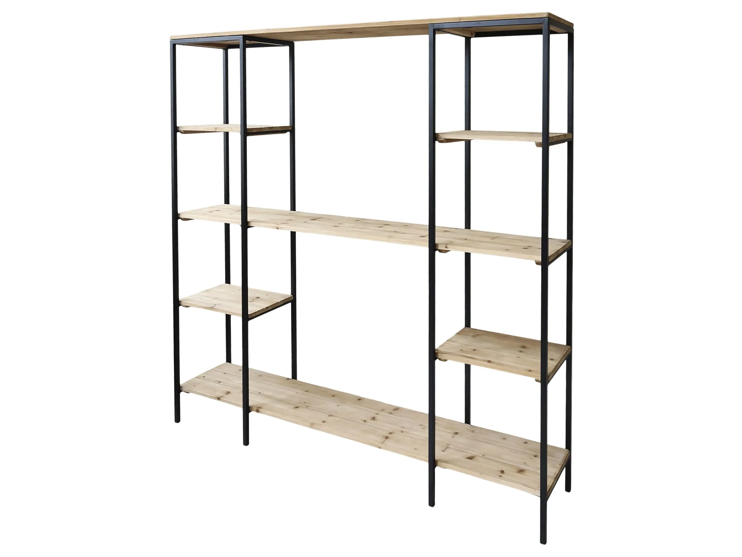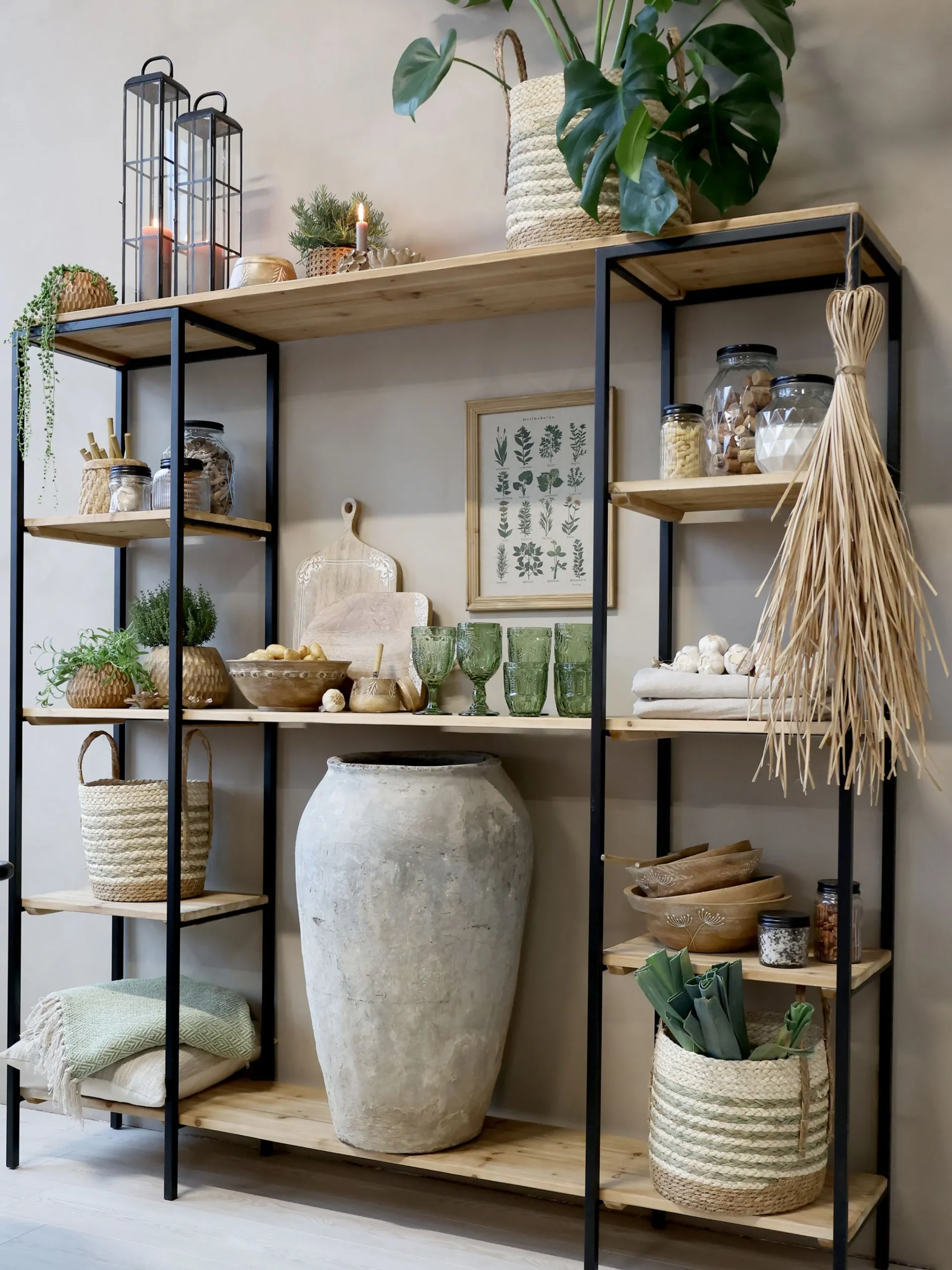 Mit seinen sieben braunen Holzböden und dem schwarzen Rahmen ist das offene Regal Vence in der Küche ein perfektes Möbelstück, um Geschirr, Gläser oder auch Vorratsgläser zu platzieren. Im Wohnraum können Sie sich dekorativ austoben: Bildbände, Pflanzen, Vasen, Körbe und hübsche Dinge, die Ihnen am Herzen liegen, finden ausreichend und luftig ihren Platz. Die warme Farbe des Holzes kontrastiert wunderbar mit dem schwarzen Metallrahmen des Regals. Stabil und robust kann es also perfekt in jeden Raum Ihrer Wahl gestellt werden. Die unkonventionelle Aufteilung der Böden ist sowohl funktional als auch ästhetisch ansprechend.