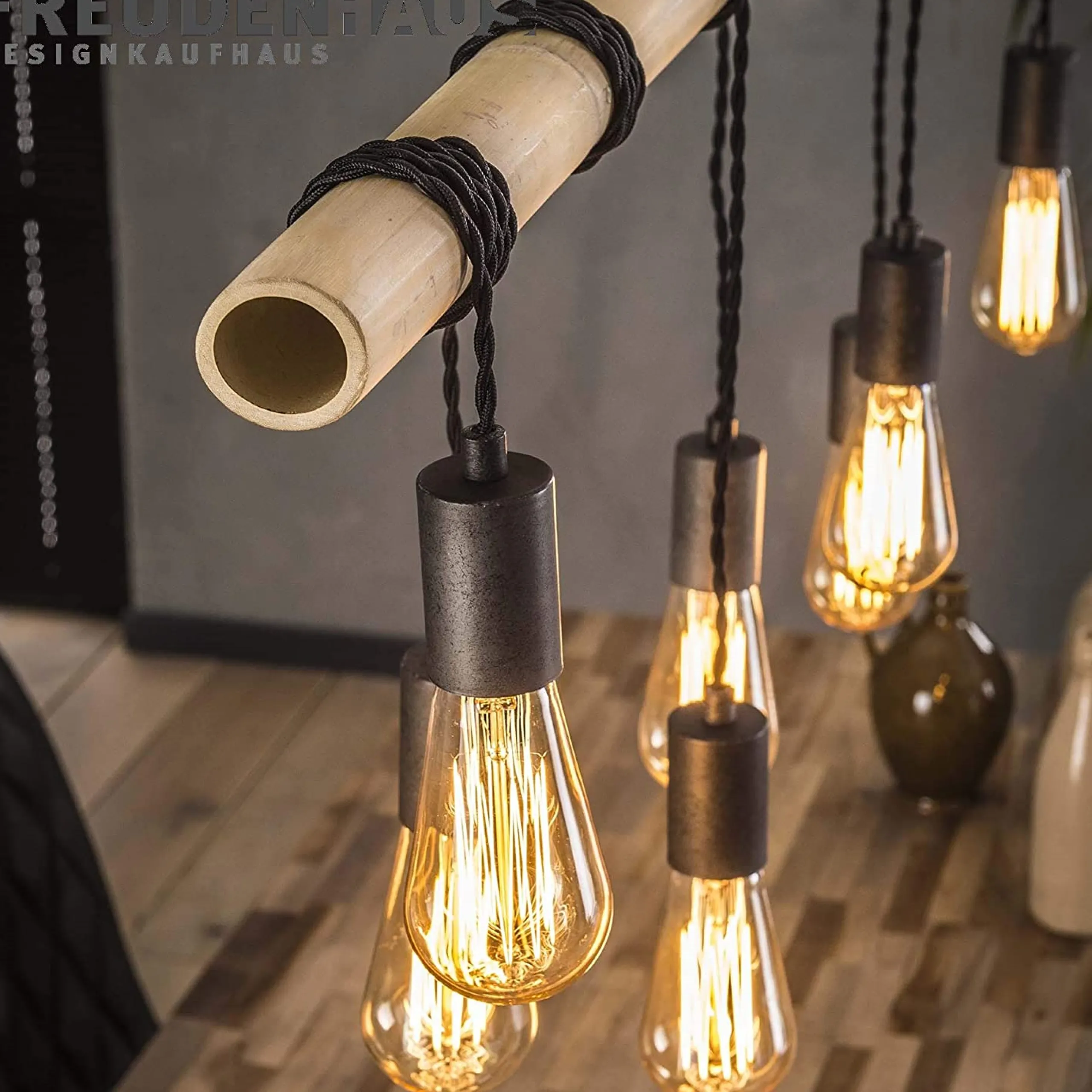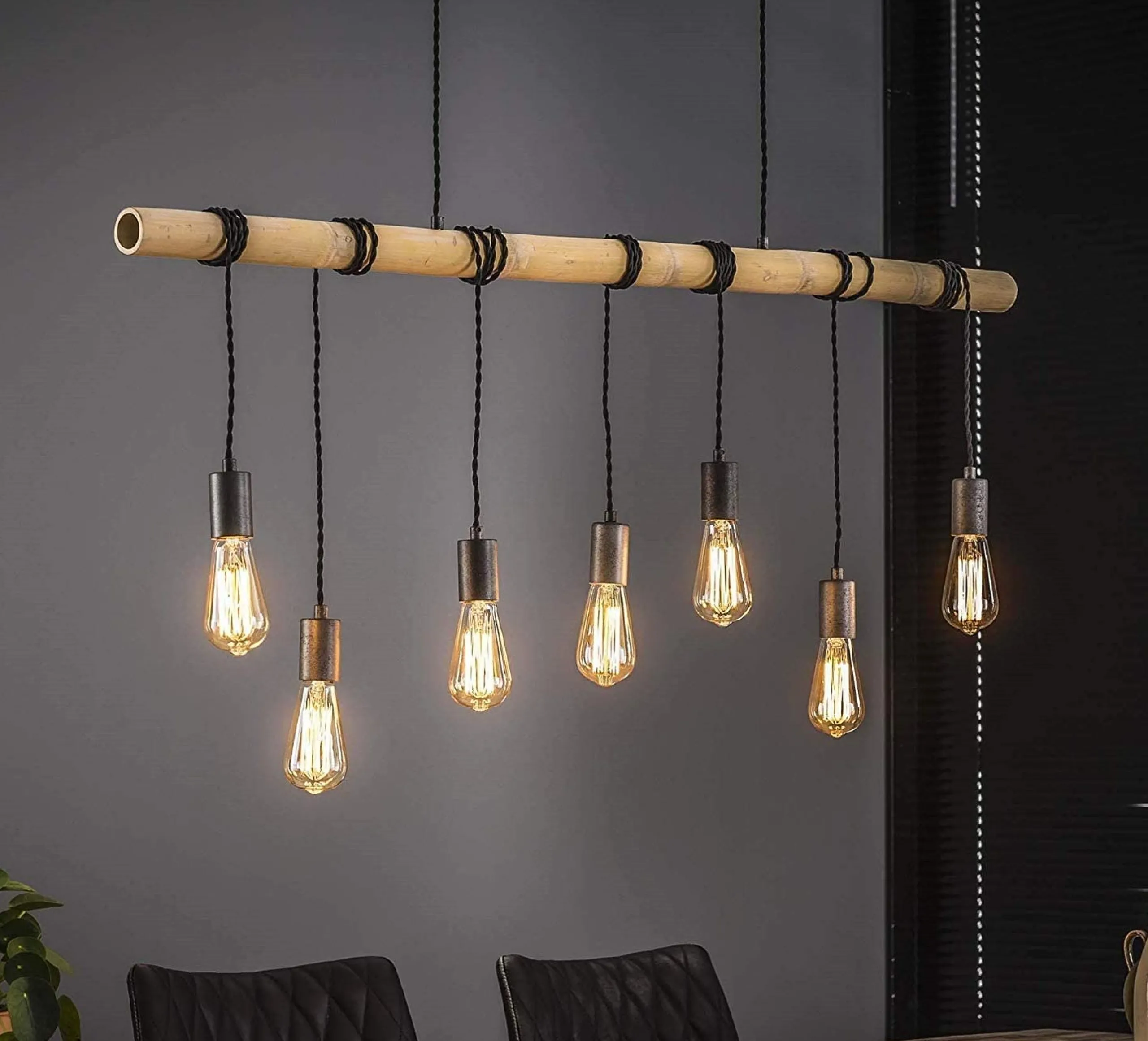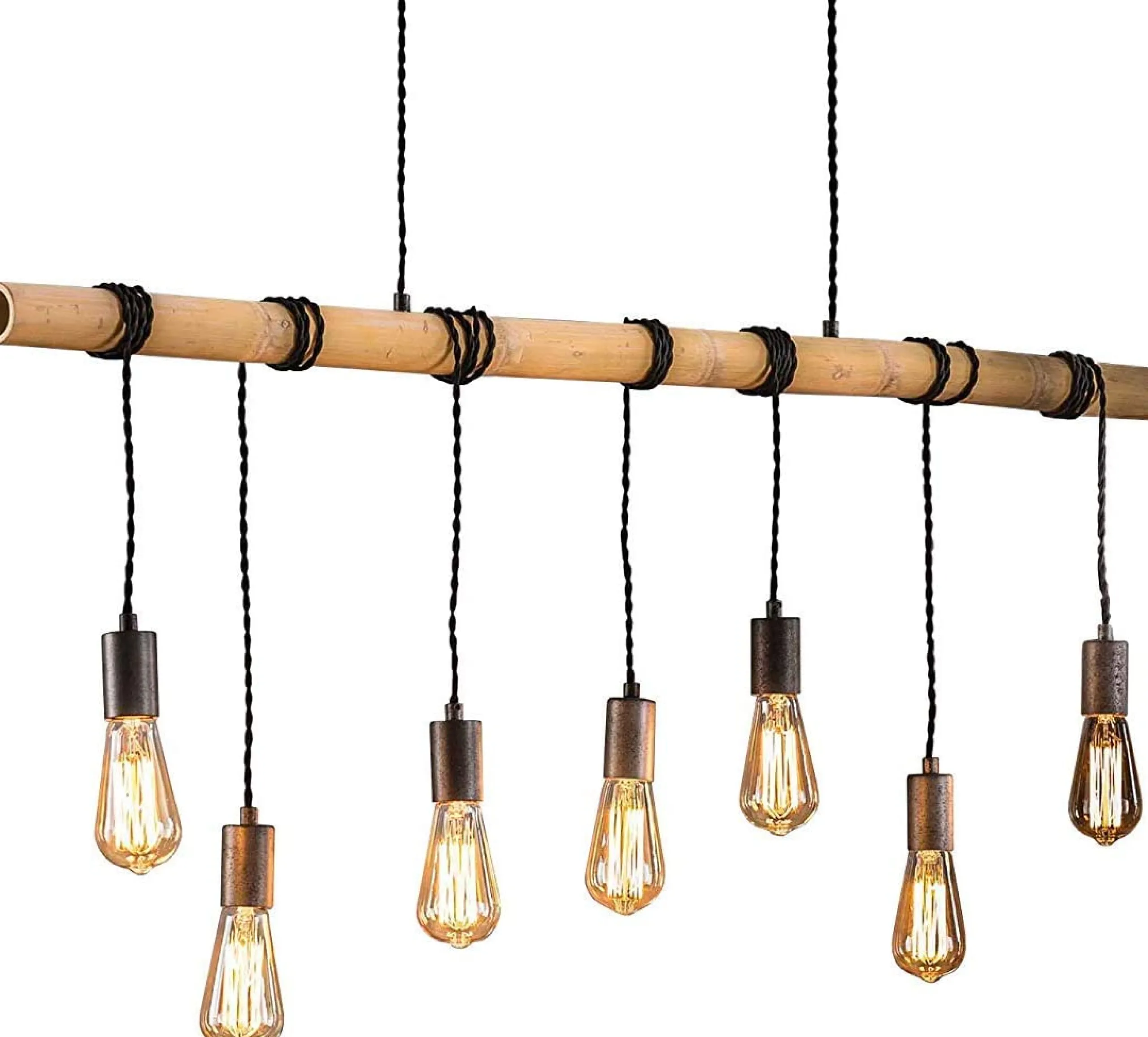 Diese Hängelampe ist ein ganz besonderer Blickfang: Sieben Leuchten, mit extravaganten Edisonglühbirnen bestückt, sind um einen Bambusstab gewickelt. Somit lassen sich die Leuchten flexibel von der Höhe gestalten und anpassen.