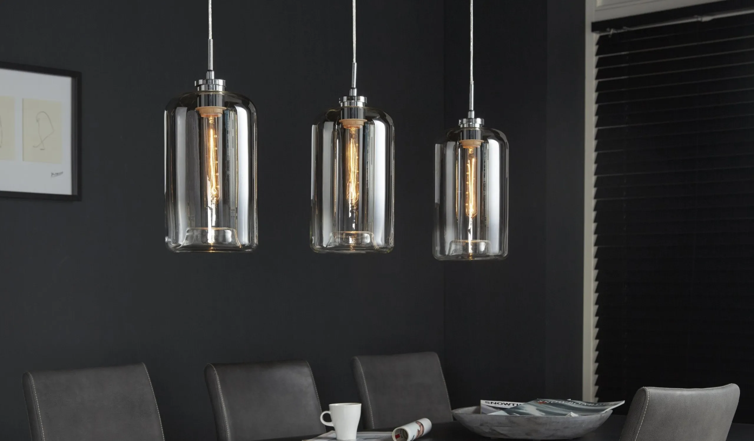 Die drei Glaszylinder beleuchten den Esstisch auf angenehme Weise und verbreitet einen wohnlichen Flair. Die Lampe hat eine chromfarbene Deckenleiste, in der die Kabel zusammenlaufen.