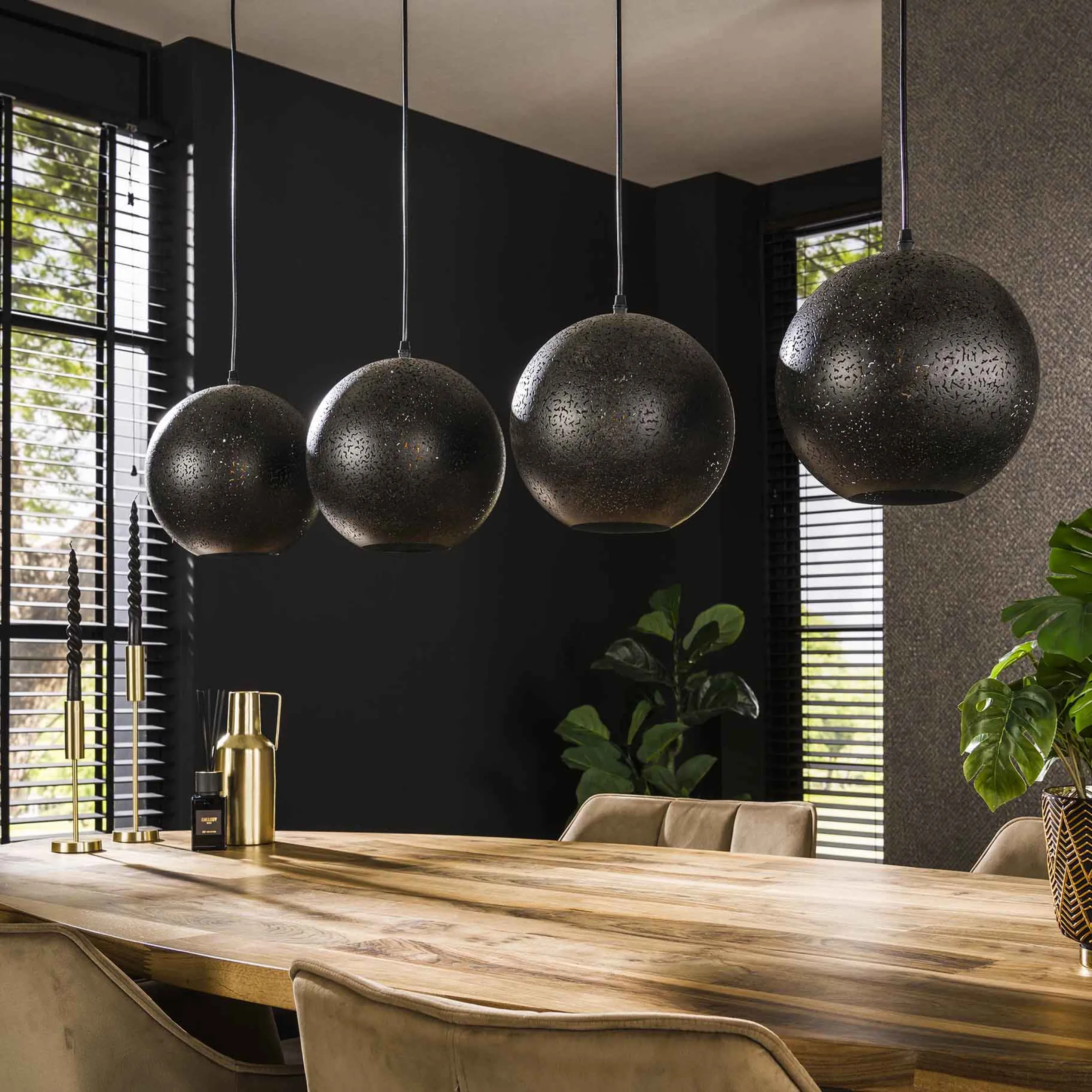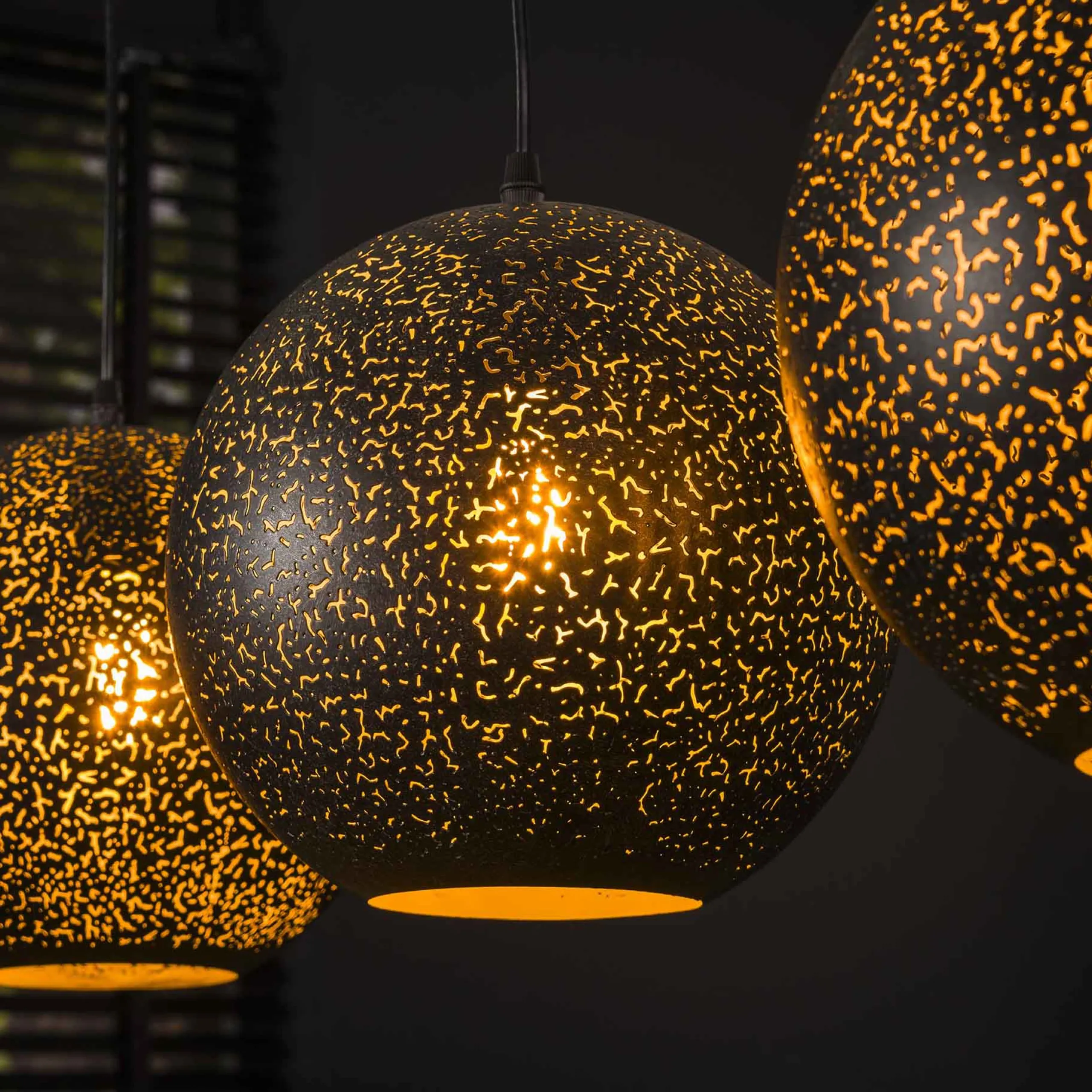 Erleuchten Sie Ihr Zuhause mit unserer einzigartigen Hängelampe, die mit vier runden Metallschirmen in einem eleganten schwarzen Finish ausgestattet ist. Jeder Schirm verfügt über eine handgefertigte individuelle Lochung, die für eine faszinierende Lichtstreuung sorgt und eine angenehme Atmosphäre schafft. Somit ist jeder Lampenschirm einzigartig und gleicht keinem anderen. Diese vielseitige Hängelampe eignet sich perfekt für Wohnzimmer, Essbereiche oder andere Räume, in denen Sie einen Hauch von Stil und Funktionalität suchen. Sie können die Schirme auf gleicher oder unterschiedlicher Höhe anbringen, überschüssiges Kabel lässt sich in der Deckenleiste verstecken.