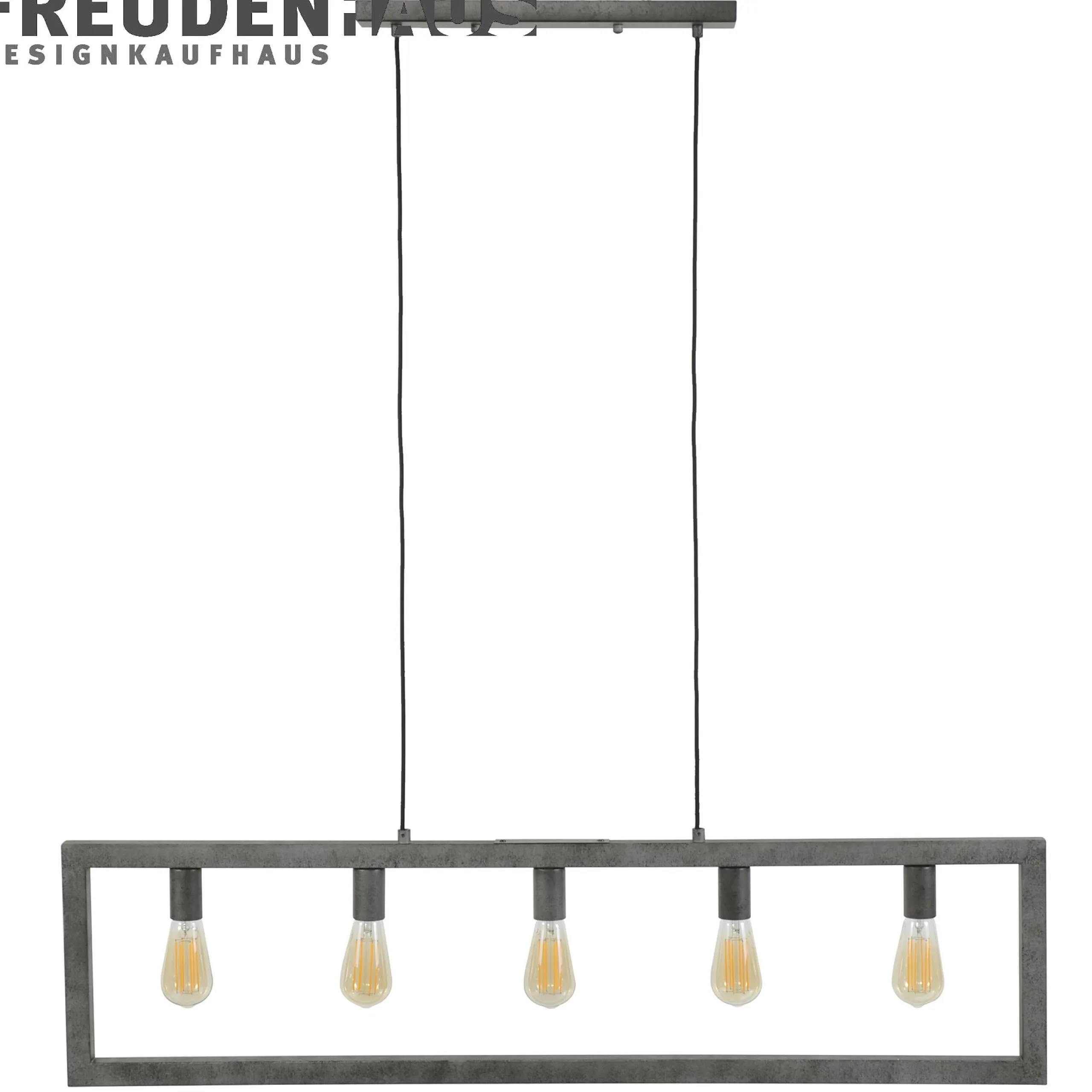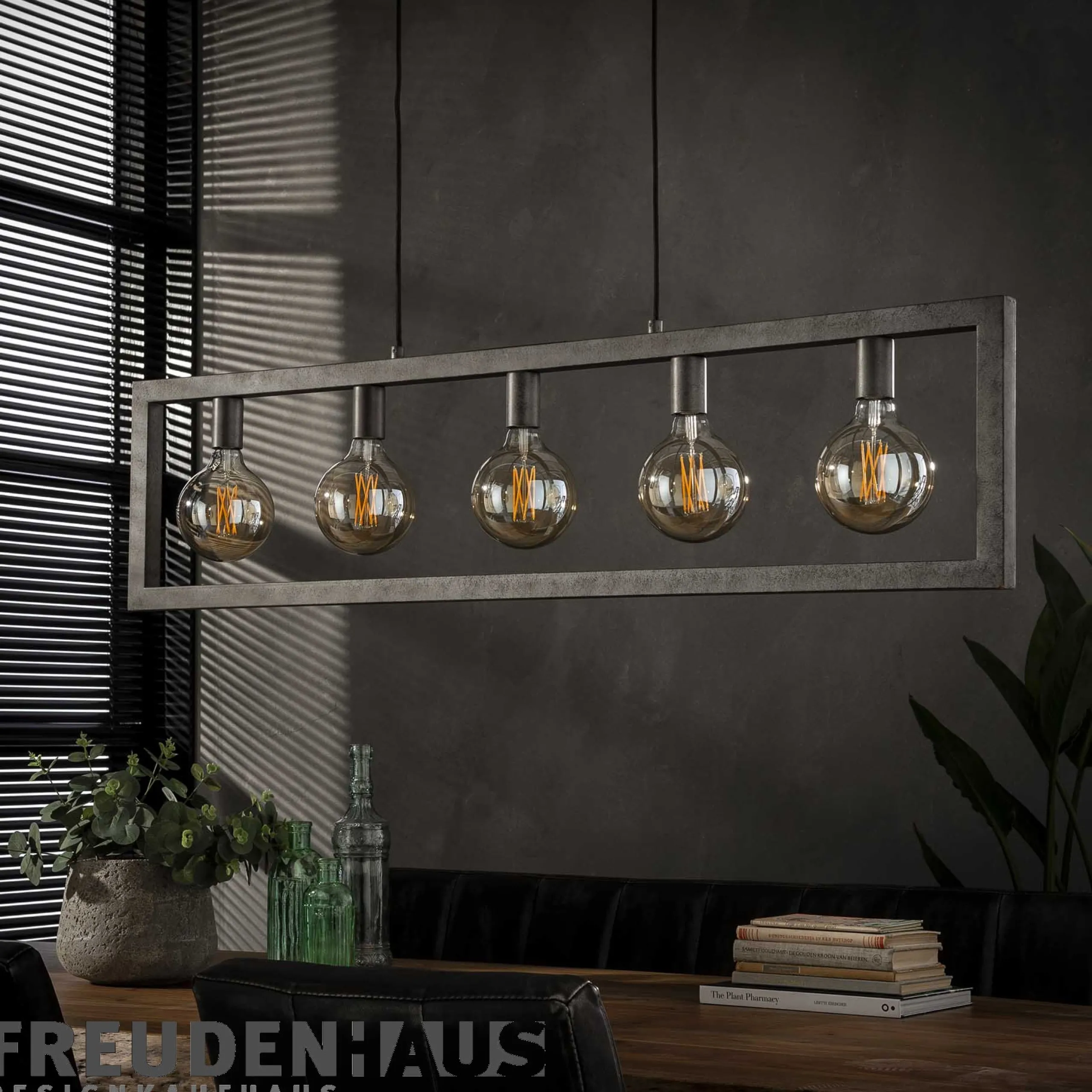 Designstark und effizient überzeugt die Hängeleuchte mit ihrem kühlen Charme. Die fünf Glühbirnen hängen frei im Metallrahmen, so dass genügend Licht über dem Esstisch und im Raum verbreitet wird. Die zwei schwarzen Kabel für die Deckenbefestigung passen perfekt in das Gesamtbild. So wird die Atmosphäre des Zimmer vollendet eingerahmt.