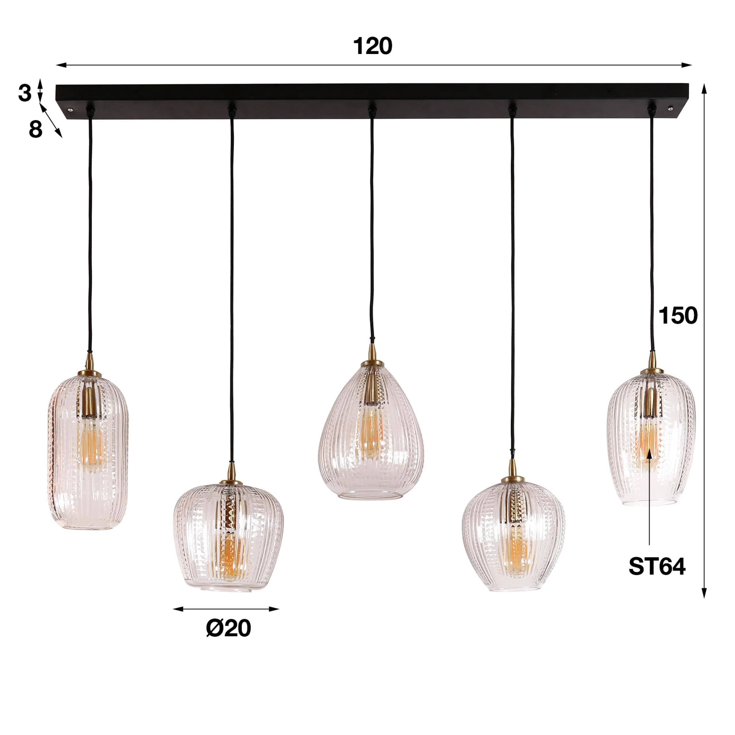 Die Pendelleuchte Diamant ist eine wunderschön gestaltet Lampe die mit ihren fünf Schirmen für ein raumgreifendes Beleuchtungsszenario sorgt. Dank des verschieden geriffelten Glases wird der Raum schön und ansprechend durch die eleganten Lampenschirme beleuchtet. Das Glas ist mundgeblasen, also handgefertigt. Das macht jedes Glas einzigartig und deswegen sind kleine Unebenheiten und Luftblasen unvermeidlich. Es sind die kleinen Unterschiede, die jedem Glas seinen eigenen Look und Charme verleihen.