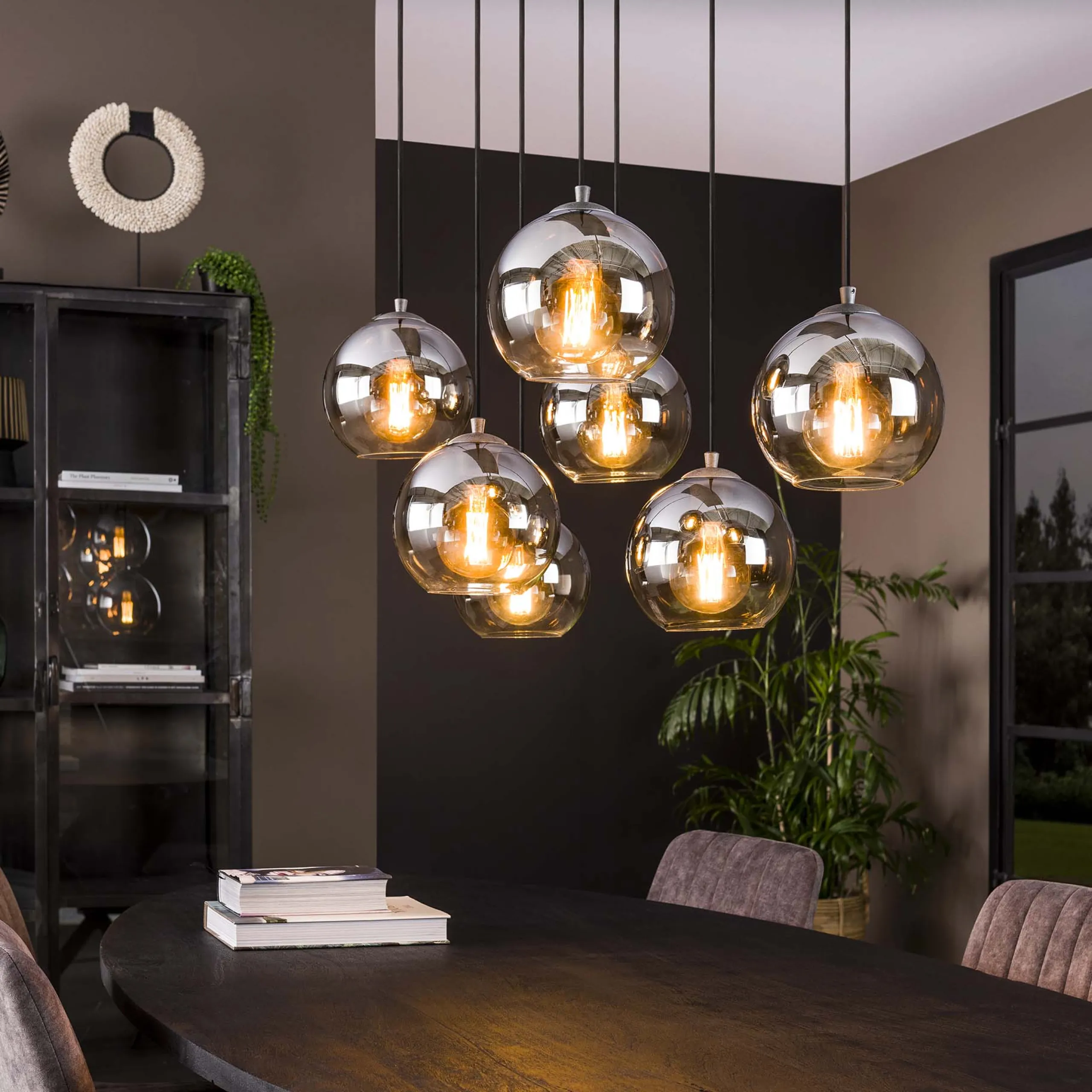Die Hängelampe Shaded Bubble ist aus Rauchglas hergestellt und hat einen sehr schönen Farbton. Die Lampenschirme sind mit Chrom bedampft. Im oberen Teil ist die Chromschicht dichter, sodass sich ein Farbverlauf ergibt, den man auch bei ausgeschalteter Lampe sehen kann. So wird der Raum sehr schön und wohldosiert beleuchtet. Die seitliche Abstrahlung ist so geringer und es gibt keine starke Blendung durch die Lampe.