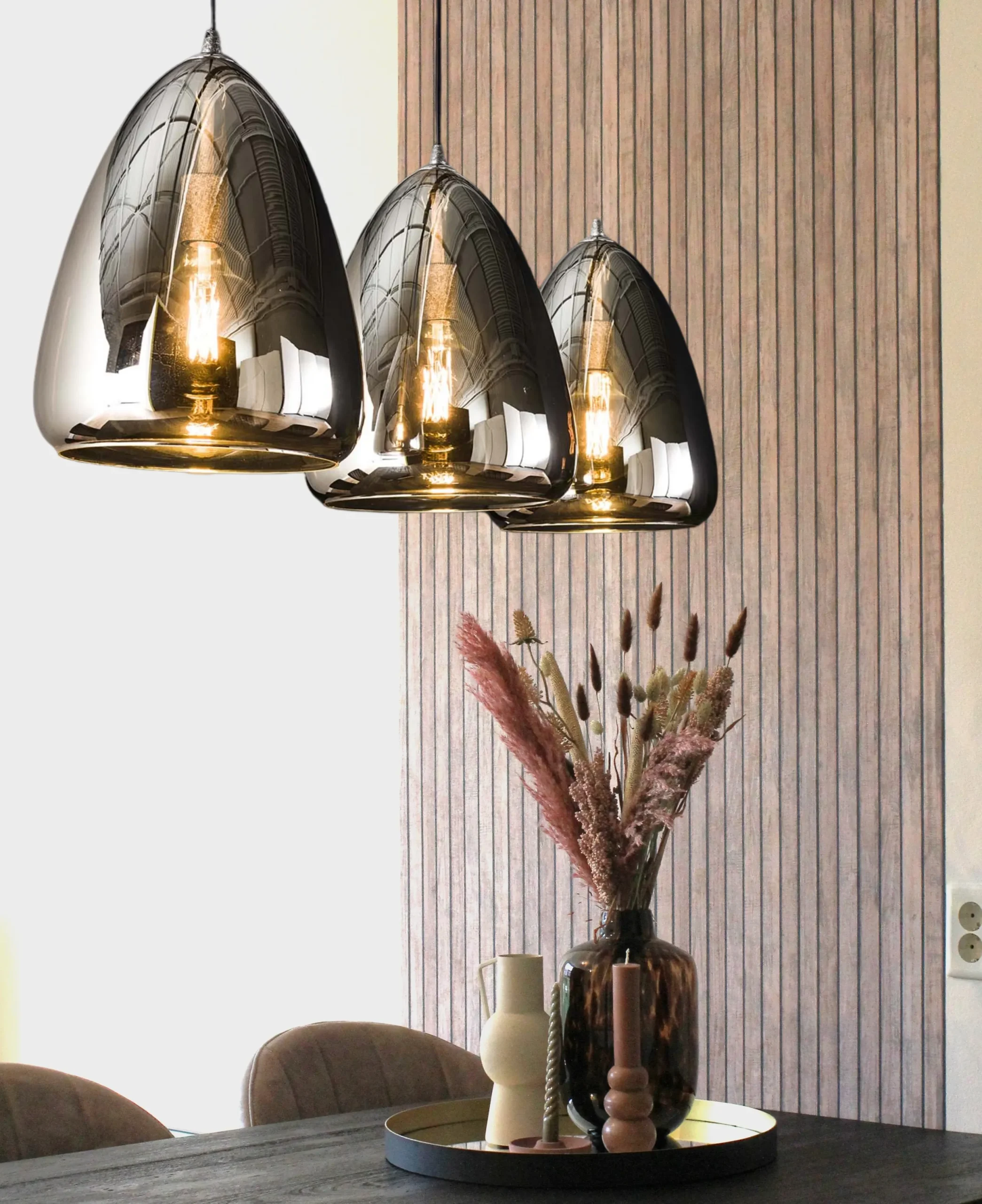 Exklusiv und elegant erstrahlt die Hängeleuchte Silver Pearl in Chromglanz. Mit den passenden Glühfadenbirnen erzeugt man zusätzlich einen goldenen Schimmer im Inneren. Der Glasschirm sorgt für beste Lichtverhältnisse, akzentuiert nach unten, seitlich strahlt es diffus ab. So ergibt sich eine weitgehend blendfreie Lichtabstrahlung in Verbindung mit einer durchaus interessanten Ästhetik. In die E27 Fassung passen Edison Glühlampen, Energiesparlampen oder LED-Leuchtmittel.