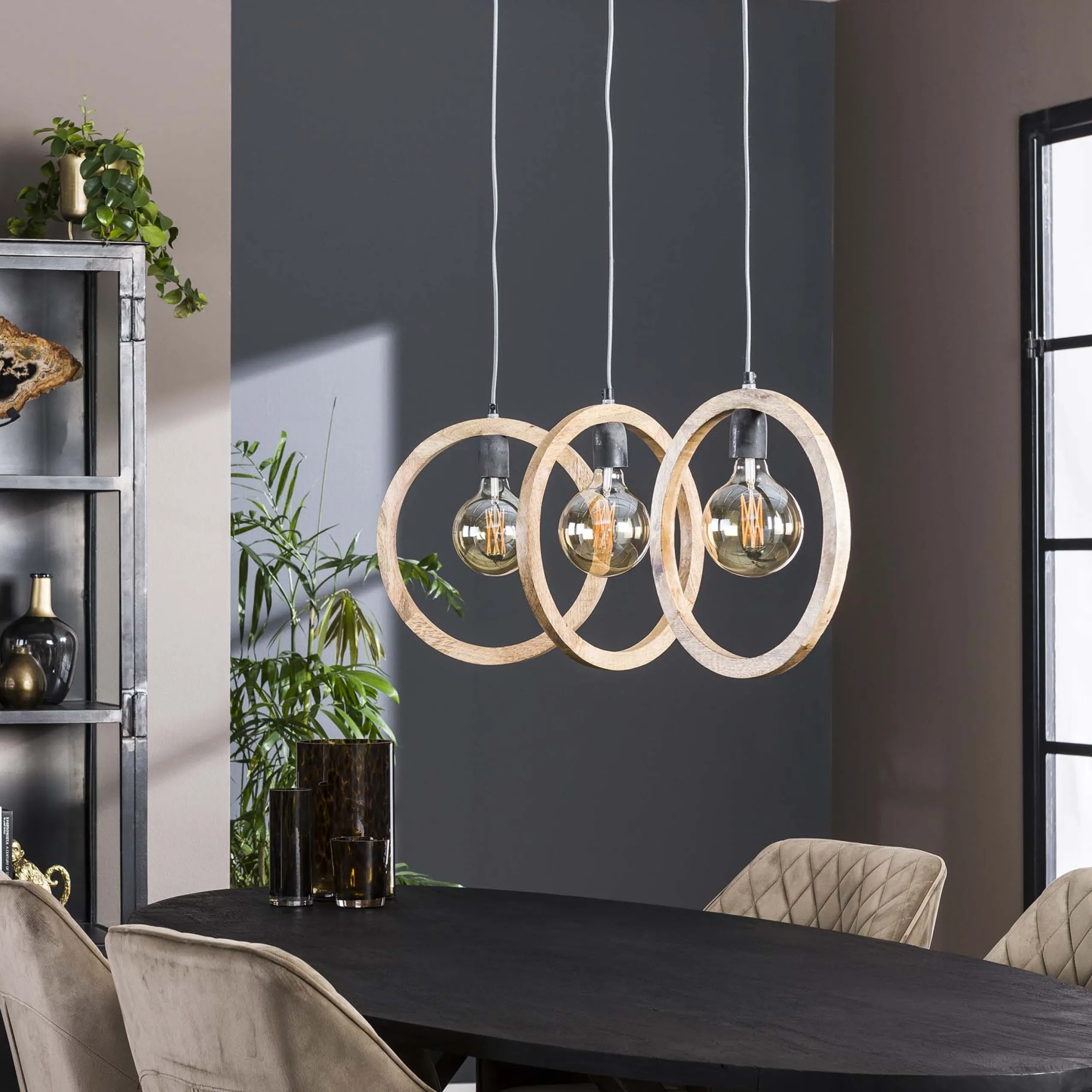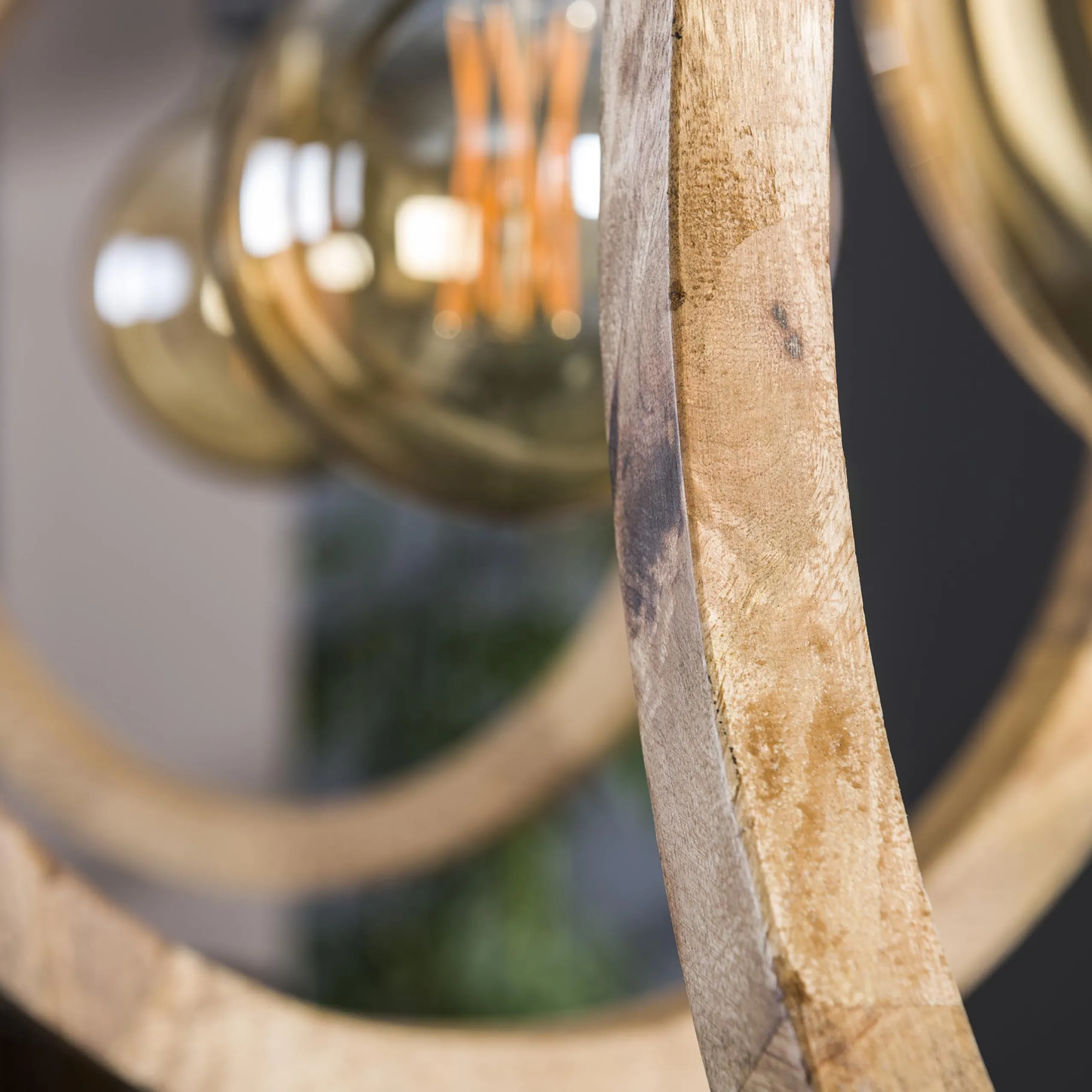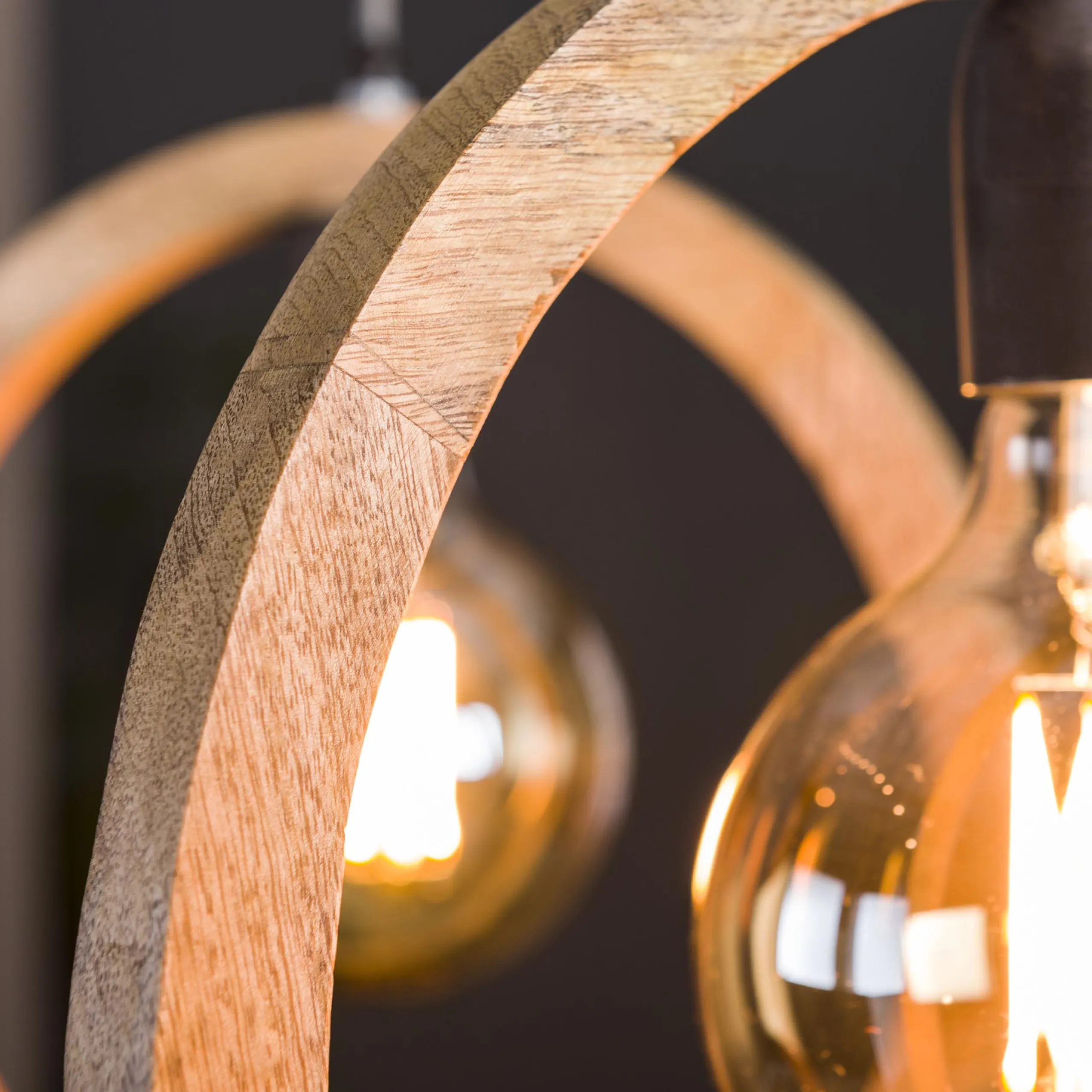 Die drei kunstfertig gearbeiteten, kreisförmigen Lampenschirme aus Holz geben durch das offene Design den Blick auf die Glühlampen frei. So verteilt sich das Licht gleichmäßig im Raum. Auch im ausgeschaltenen Zustand zieht die Lampe durch die schönen Holzringe die Blicke auf sich. Das Mangoholz mit der tollen Maserung in Kombination mit den Glühfadenbirnen lässt die Lampe zum wortwörtlichen Highlight Ihres Zuhauses werden.