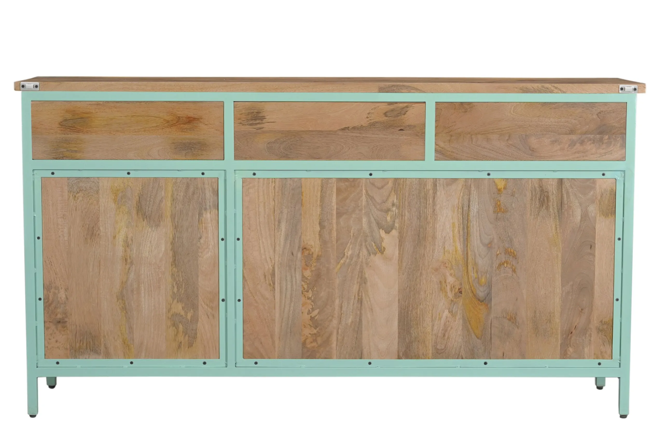 Das Sideboard Provence ist ein wahr gewordener Retro-Traum aus Metall, Holz und Glas! Es entfaltet seine besondere Raumwirkung durch das gekonnte Zusammenspiel von Farben und Materialien. Der Korpus ist komplett aus Metall, das Innenleben aus wunderschön gemasertem Mangoholz. Die zahlreichen Glaselemente verleihen eine außergewöhnliche Transparenz. Neben der großzügigen Ablagefläche begeistert der Vitrinenschrank als Showbühne für Ihre Bücher, Weingläser, Porzellan oder Wohnaccessoires. Zusätzlichen Stauraum bieten die drei Schubladen. Abgerundet wird das Ganze mit goldenen Griffen. Und der ganz große Auftritt ist dank der Farbgebung garantiert sicher!