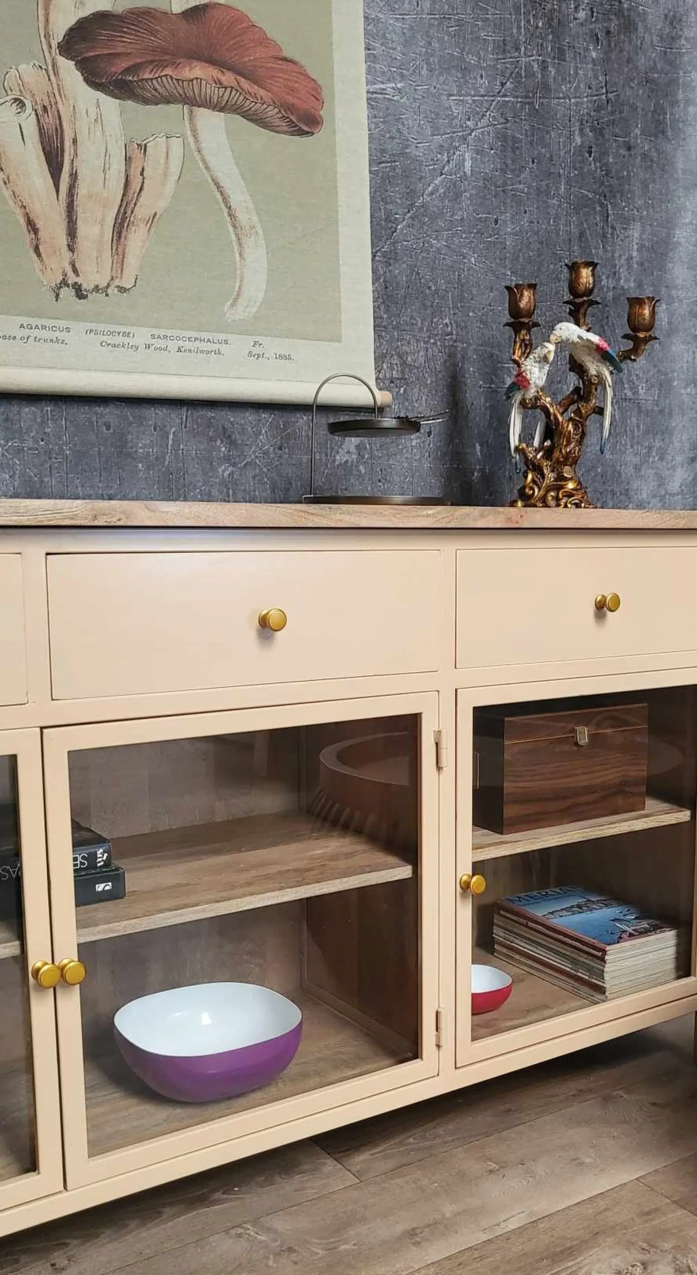Das Sideboard Provence ist ein wahr gewordener Retro-Traum aus Metall, Holz und Glas! Es entfaltet seine besondere Raumwirkung durch das gekonnte Zusammenspiel von Farben und Materialien. Der Korpus ist komplett aus Metall, das Innenleben aus wunderschön gemasertem Mangoholz. Die zahlreichen Glaselemente verleihen eine außergewöhnliche Transparenz. Neben der großzügigen Ablagefläche begeistert der Vitrinenschrank als Showbühne für Ihre Bücher, Weingläser, Porzellan oder Wohnaccessoires. Zusätzlichen Stauraum bieten die drei Schubladen. Abgerundet wird das Ganze mit goldenen Griffen. Und der ganz große Auftritt ist dank der Farbgebung garantiert sicher!