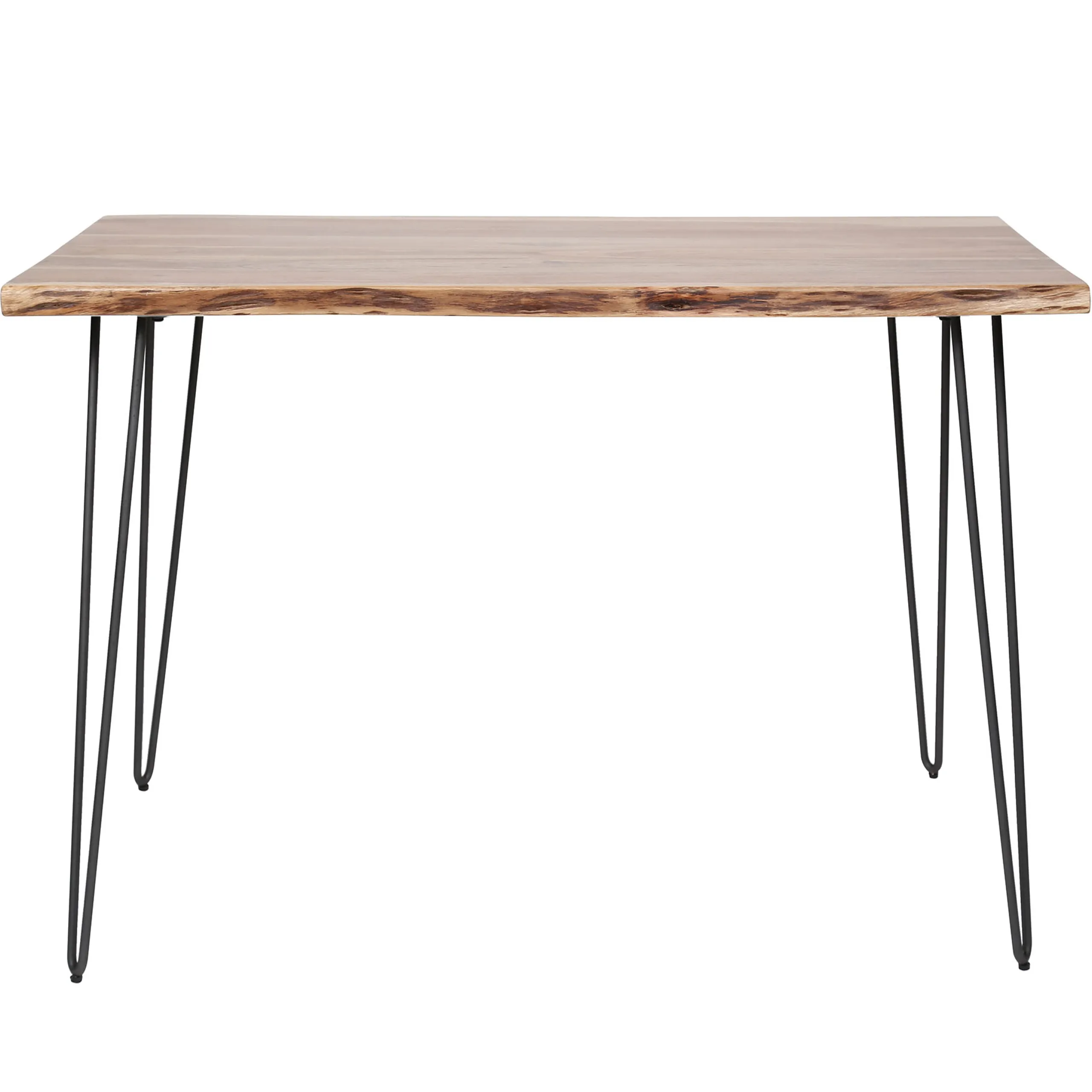 Der Bartisch Palu ist der ideale Begleiter für Ihre Küche oder das Esszimmer. Durch seine kompakte Größe findet er leicht seinen Platz und verbreitet den Flair eines Cafes. Das Material und Design kommt im Industrial Look daher. Die wunderbar typische Akazienholzmaserung, sowie die Baumkantenform, machen diesen Tisch zu einem individuellen Industrial Stück. Die Tischplatte ist offenporig klar lackiert, was sie unempfindlich gegen Feuchtigkeit und Schmutz macht. Die schwarzen pulverbeschichteten Haarnadelbeine sorgen durch ihr Design dafür, dass die schwere massive Platte eine gewisse Leichtigkeit erhält.