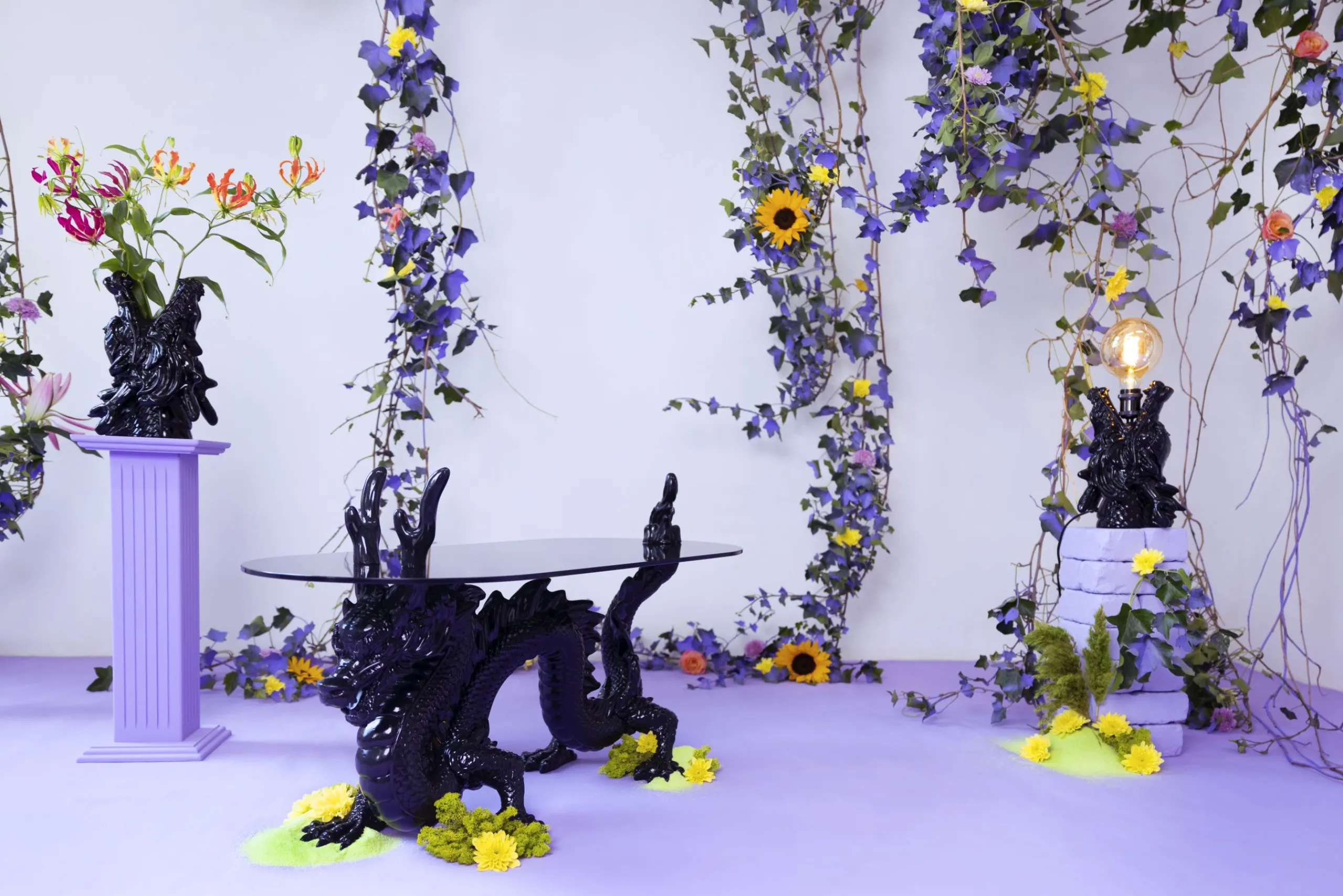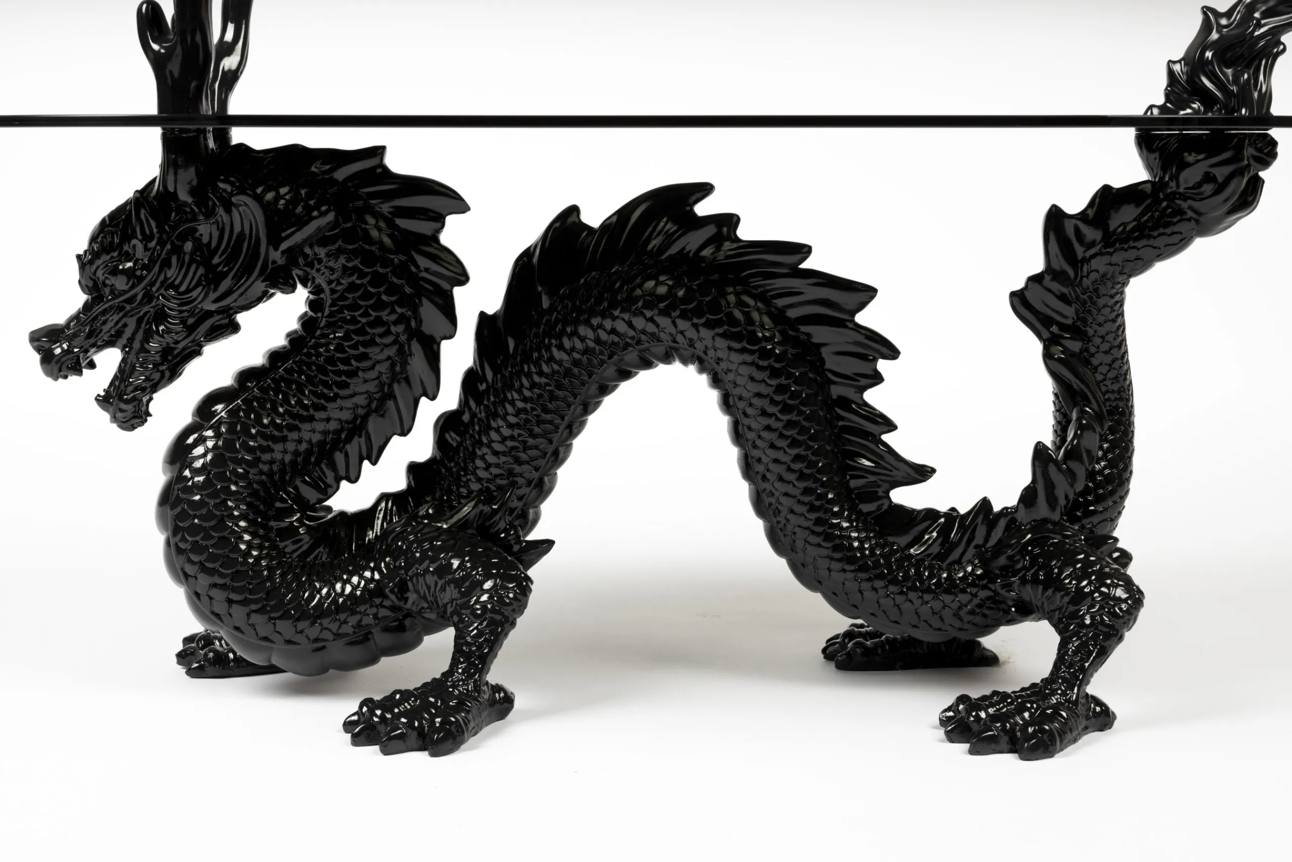 Inspiriert von einem der legendärsten Geschöpfe der chinesischen Mythologie, steht der Drache für Glück, Stärke und Gesundheit. Und jetzt können Sie dies alles in Ihrem Zuhause willkommen heißen, dank des gewagten Tisches von Bold Monkey. Rauchschwarzes Glas trifft auf ausgearbeitete Details, während die Basis des Tisches – unser schwarzer Drache – aus glänzendem Harz besteht. Der Dragonized Couchtisch verleiht einem bereits eklektisch eingerichteten Raum einen Hauch von Spaß oder wird zu einem einzigartigen Blickpunkt in einer ansonsten minimalistisch eingerichteten Wohnung. Dieser glamouröse Beistelltisch ist ein kultiges Sammlerstück für jeden Designliebhaber und der Inbegriff des Bold Monkey Stils: extravagantes Design zu einem erschwinglichen Preis.