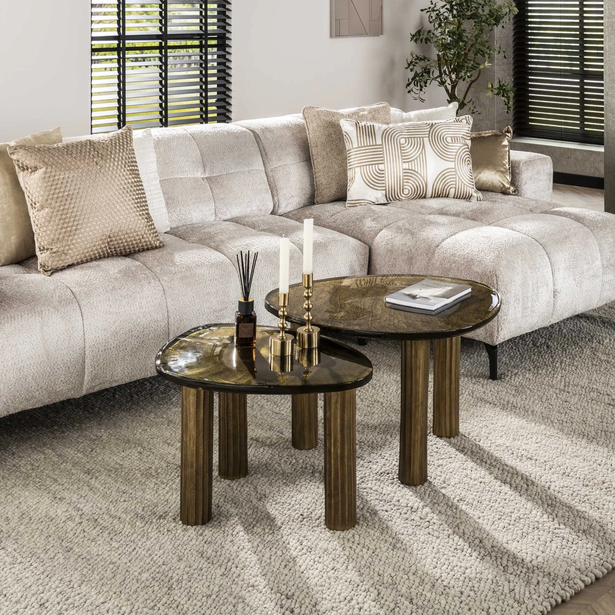 Die unregelmäßigen, organisch geformten Glasplatten ruhen auf soliden Metallfüßen und sind in zwei edlen Farbvarianten erhältlich: Antik-Gold und Antik-Kupfer. Diese warmen, metallischen Töne setzen luxuriöse Akzente und harmonieren perfekt mit verschiedensten Einrichtungsstilen – von modern bis klassisch.