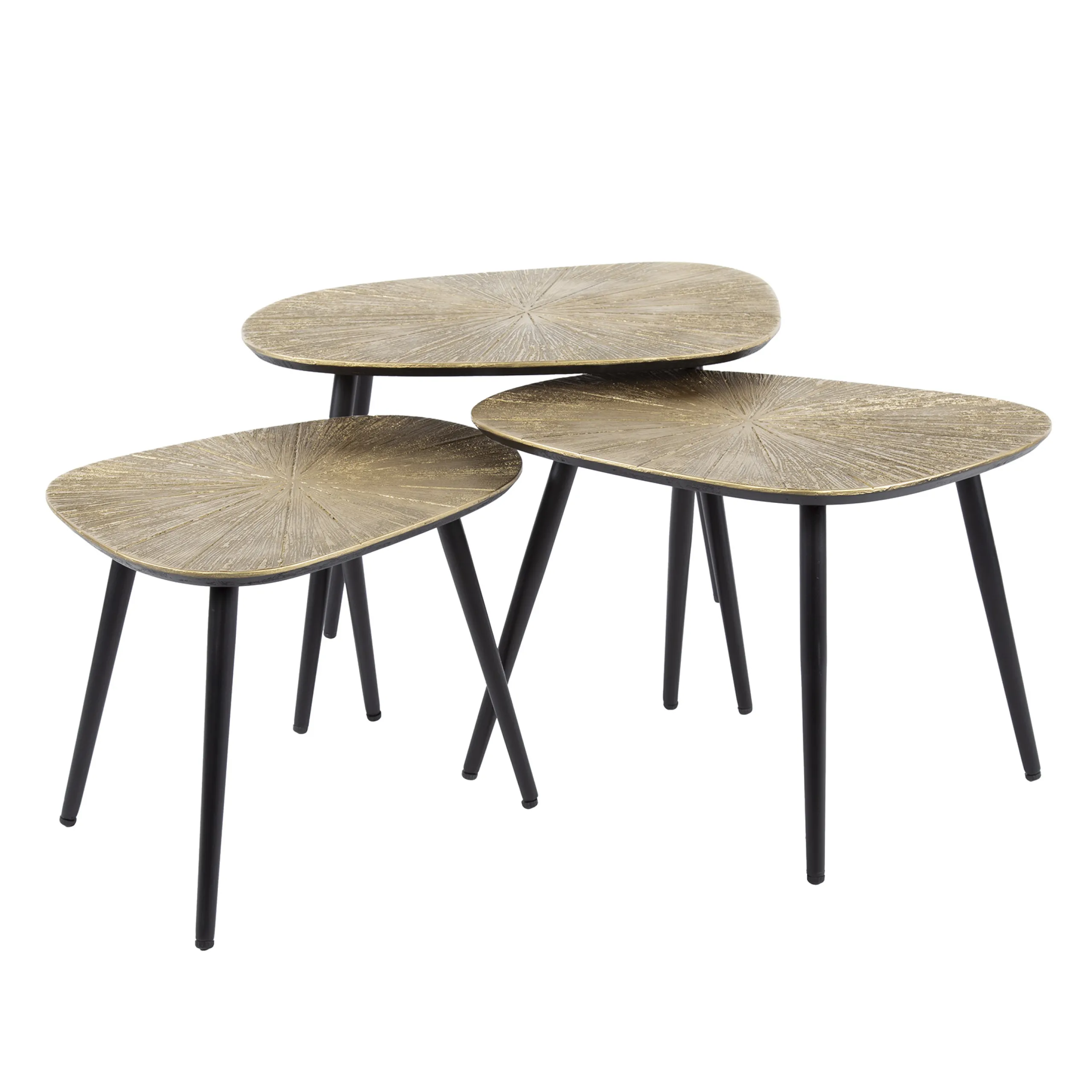 Dank der organischen Formen und der schlanken, schwarzen Metallbeine passen diese Tische perfekt in moderne, industrielle oder klassische Wohnkonzepte. Sie lassen sich flexibel als Set arrangieren – ob ineinandergeschoben für mehr Platz oder separat als stilvolle Hingucker.