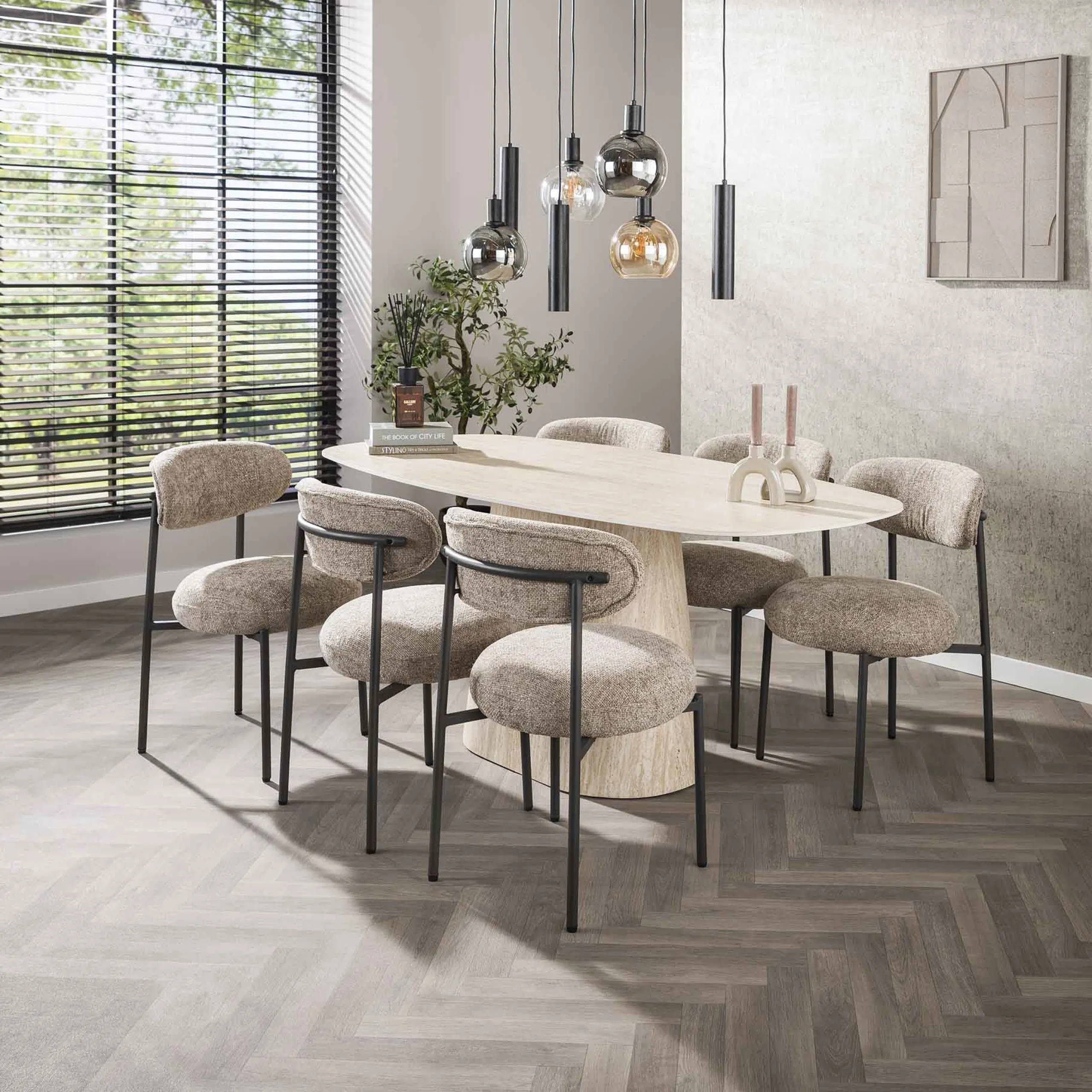 Ein Esstisch, der mehr ist als ein Möbelstück – er ist eine Hommage an die Kunst des Wohnens. Die edle Tischplatte aus einem erlesenen Keramik-Travertin-Gemisch entfaltet ihre natürliche Raffinesse in feinen, sanft schimmernden Nuancen. Ihre glatte, kühle Oberfläche fängt das Licht auf subtile Weise ein und verleiht dem Raum eine Aura von Ruhe und Exklusivität. Das Material ist kratzfest, schmutzabweisend und hitzebeständig und eignet sich daher ideal für intensive Nutzung ohne besondere Pflege.