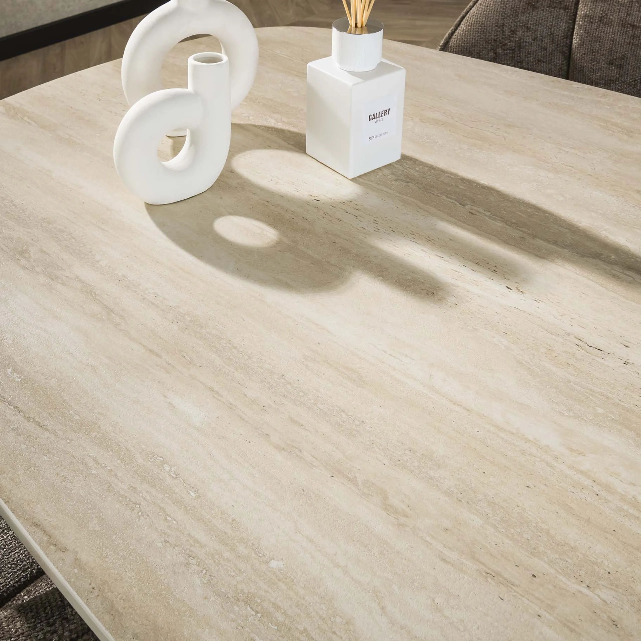 Mit seiner organischen, sanften Form sorgt der Esstisch Arch Organic für Natürlichkeit und setzt mit seinem einzigartigen Design ein Statement. Die weichen und runden Formen erinnern an Steine, die von Wind, Wasser und Sand geformt wurden. Mit diesem großen Tisch erhalten Sie ein ästhetisches Highlight für Ihr Zuhause, das aus hochwertigem Travertin-Keramik und Metall hergestellt ist. Travertin ist ein Kalkstein von heller, meist gelblicher und brauner oder seltener beiger oder roter Farbe, der aus kalten, warmen oder heißen Süßwasserquellen stammt.Die Tischplatte bietet ausreichend Platz für Familie und Gäste. Die Platte wird von einem modernen Spidergestell getragen, das nicht nur stabil und robust ist, sondern auch ein echter Hingucker. Die verästelte Struktur des Gestells sorgt für eine stabile Konstruktion.Egal, ob Sie einen modernen, industriellen oder einen Retro-Look bevorzugen, der Tisch ist vielseitig einsetzbar!