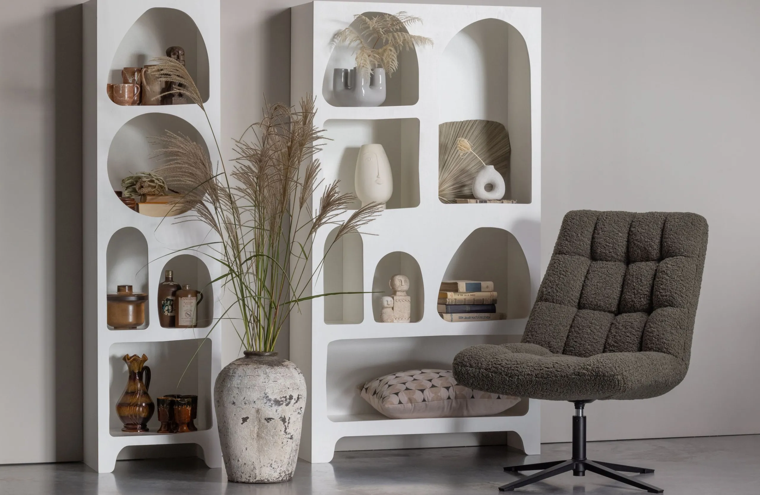 Mit seiner organischen, sanften Form sorgt das Regal Organic Caz für Natürlichkeit und setzt mit seinem einzigartigen Design ein Statement. Die weichen und runden Formen erinnern an eine Steinwand, die von Wind, Wasser und Sand ausgehöhlt wurde. Mit diesem weißen Regal aus der niederländischen WOOOD-Kollektion holen Sie sich ein trendiges und modernes Möbelstück in Ihr Zuhause. Der Schrank Caz ist aus Sperrholz mit weißer Lackierung gefertigt und hat entweder 5 oder 7 Fächer. Durch die großzügigen Abmessungen ist der Schrank ein echter Blickfang, ob einzeln oder im Set. Zum Schutz Ihres Bodens und zum kleinen Höhenausgleich wird empfohlen Filzgleiter unter den Beinen zu befestigen.