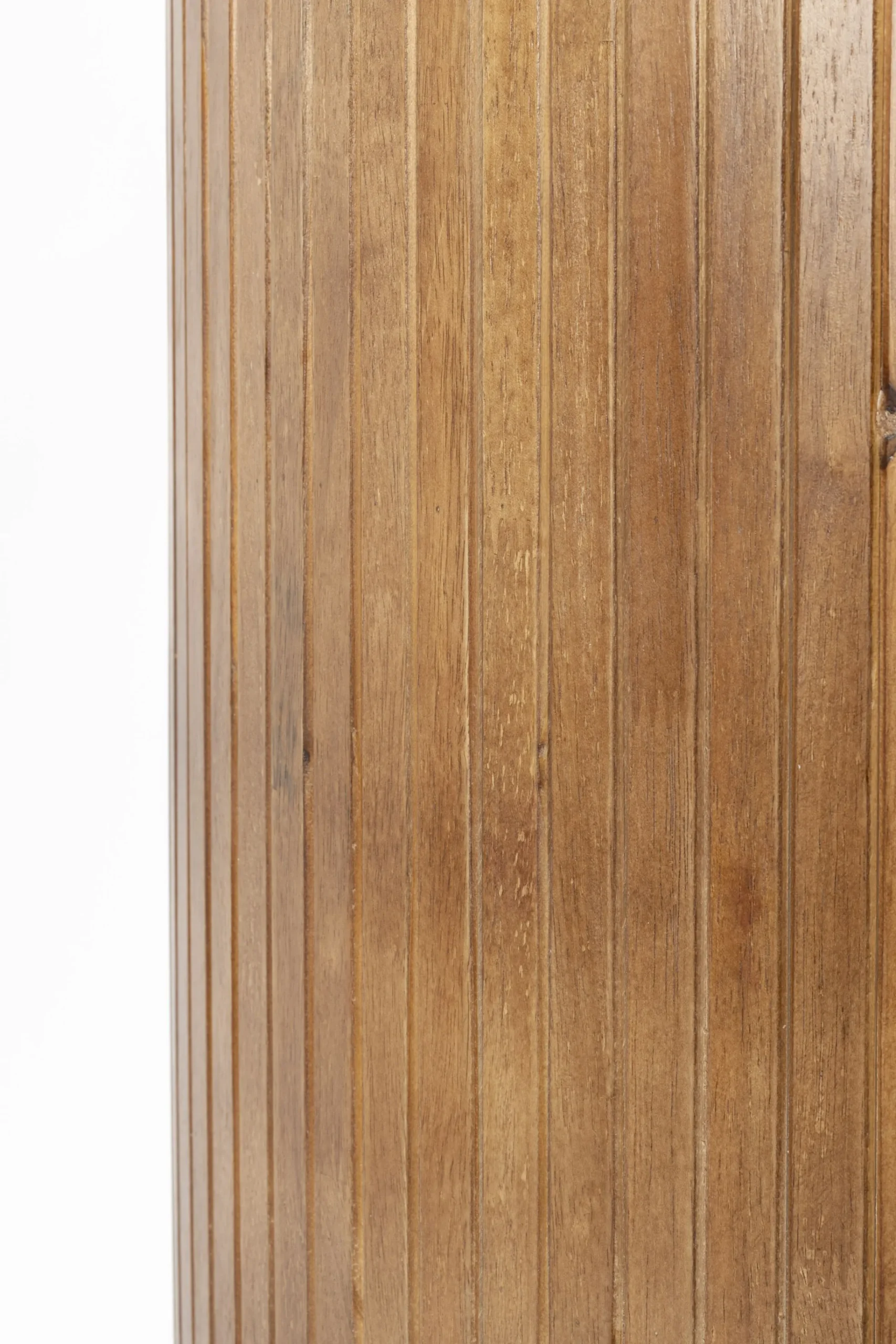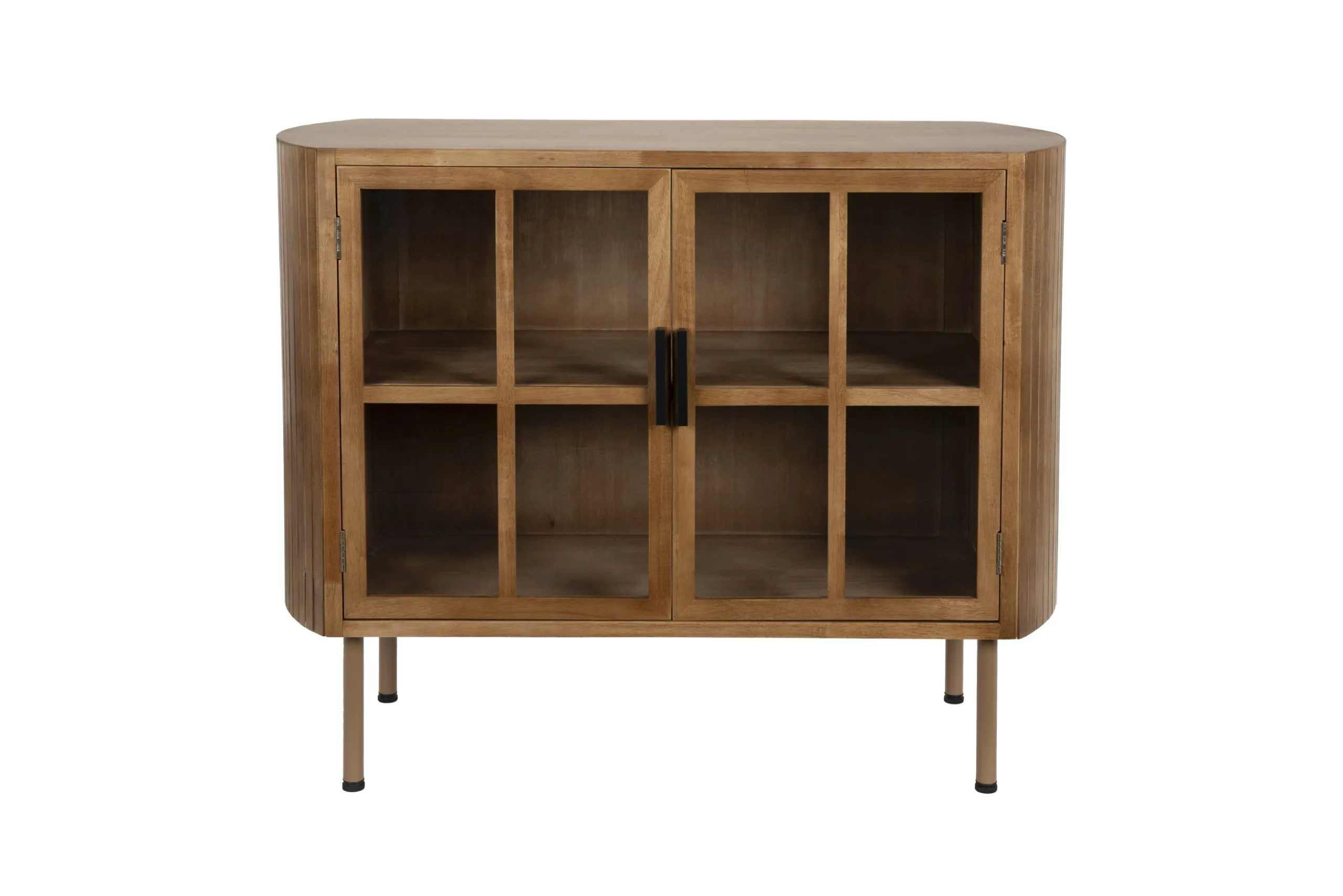 Die abgerundeten Kanten und die feine Maserung des Holzes verleihen dem Schrank eine warme und natürliche Ausstrahlung, die sich mühelos in jeden Wohnstil integriert. Die schlichten, schlanken Metallfüße sorgen für Stabilität und verleihen dem Möbelstück gleichzeitig eine moderne Note.