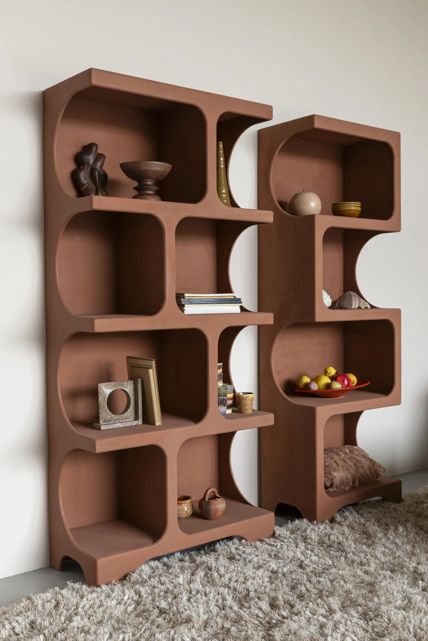 Diese Regale aus hochwertigem MDF sind weit mehr als reine Aufbewahrungsmöbel – sie sind ein Statement. Mit ihrer organisch abgerundeten Formensprache wirken sie fast wie kleine Architekturen im Raum, weich und zugleich kraftvoll. Die warm schokoladig-erdige Oberfläche unterstreicht ihren skulpturalen Charakter und bringt eine natürliche Behaglichkeit in jedes Interieur.