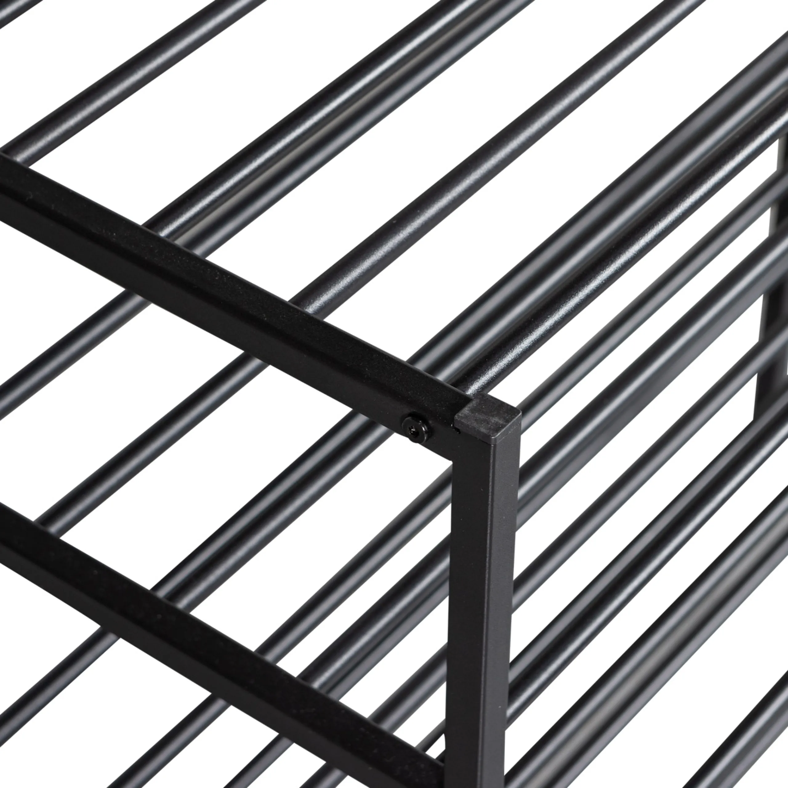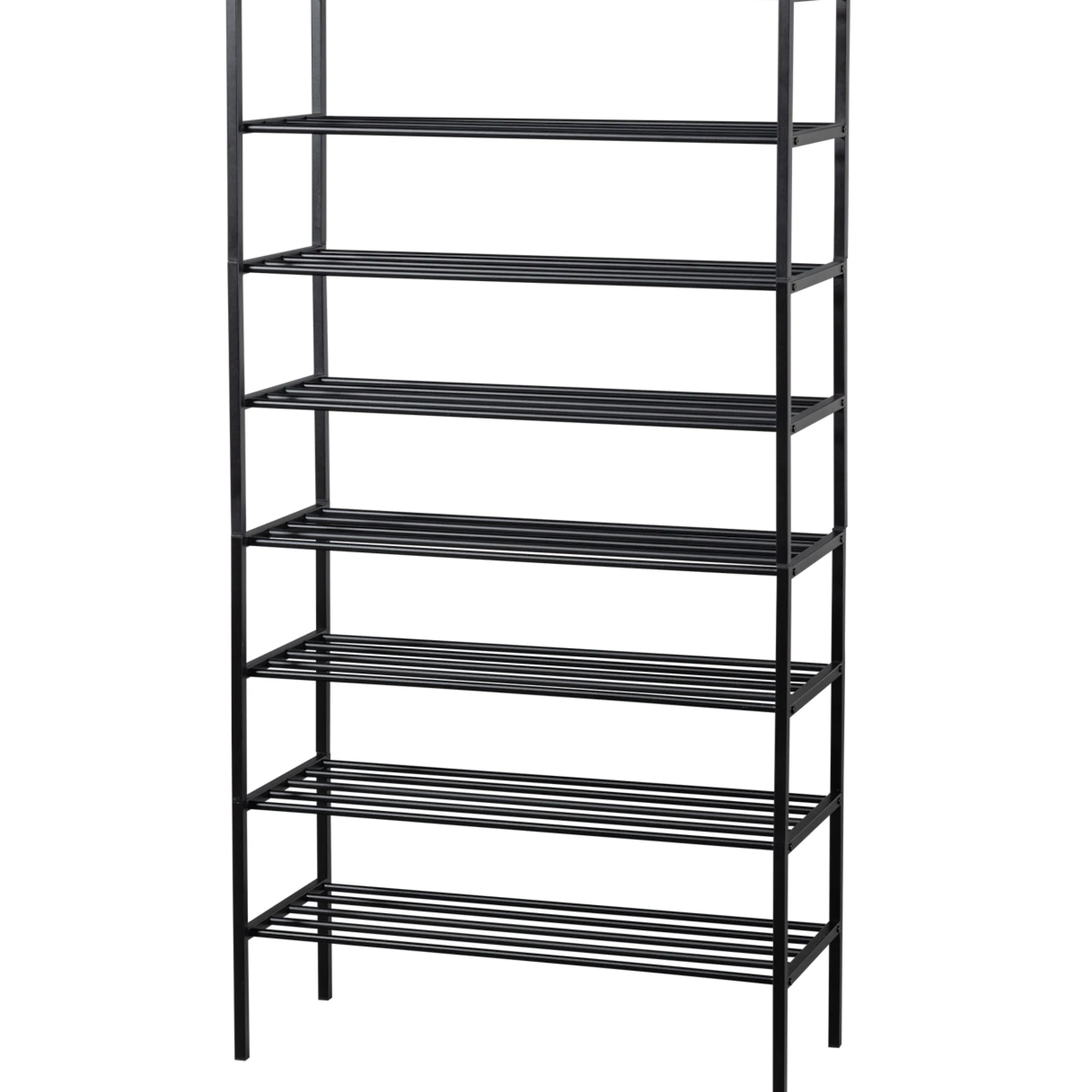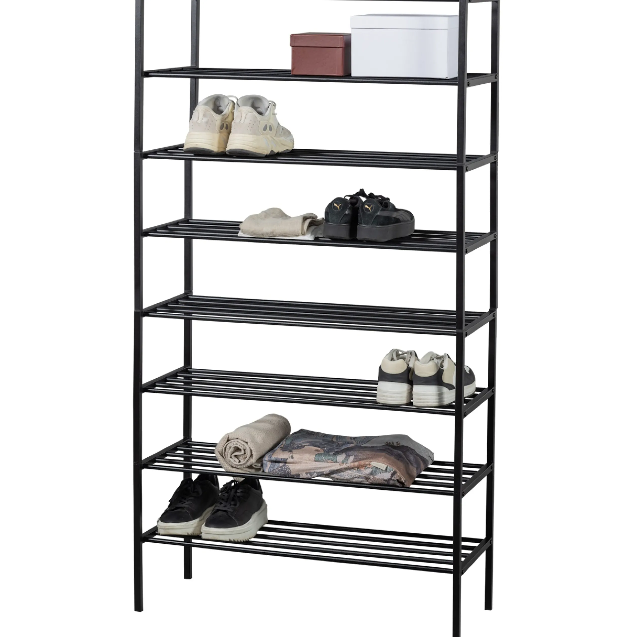 Das Schuhregal Ferro ist ein eigener Entwurf aus der Kollektion der niederländischen Marke WOOOD. Ferro ist aus Metall gefertigt und hat eine pulverbeschichtete, schwarze Oberfläche. Das praktische an diesem Metallregal ist, dass es stapelbar und somit beliebig erweitert werden kann. Durch die verschiedenen Regalhöhen ist dann auch schnell mal eine komplette Garderobenwand mit Platz für Jacken gebaut. Die Höhe der Fächer beträgt 18 cm, die maximale Tragfähigkeit beläuft sich auf 15 kg.
