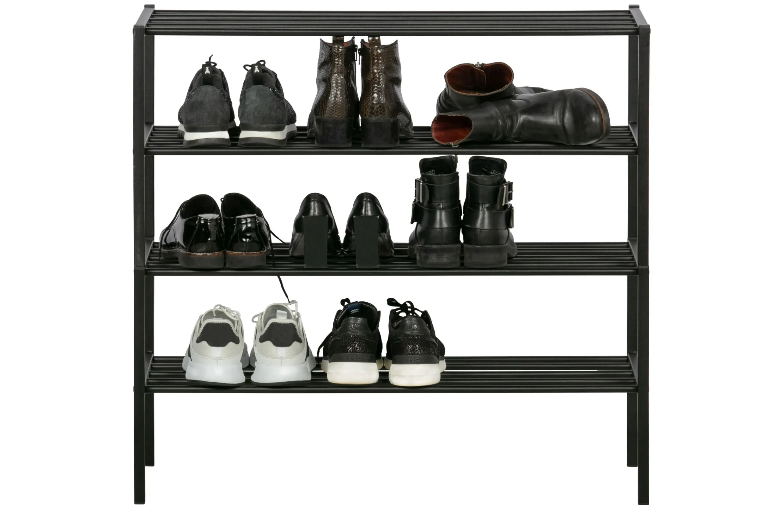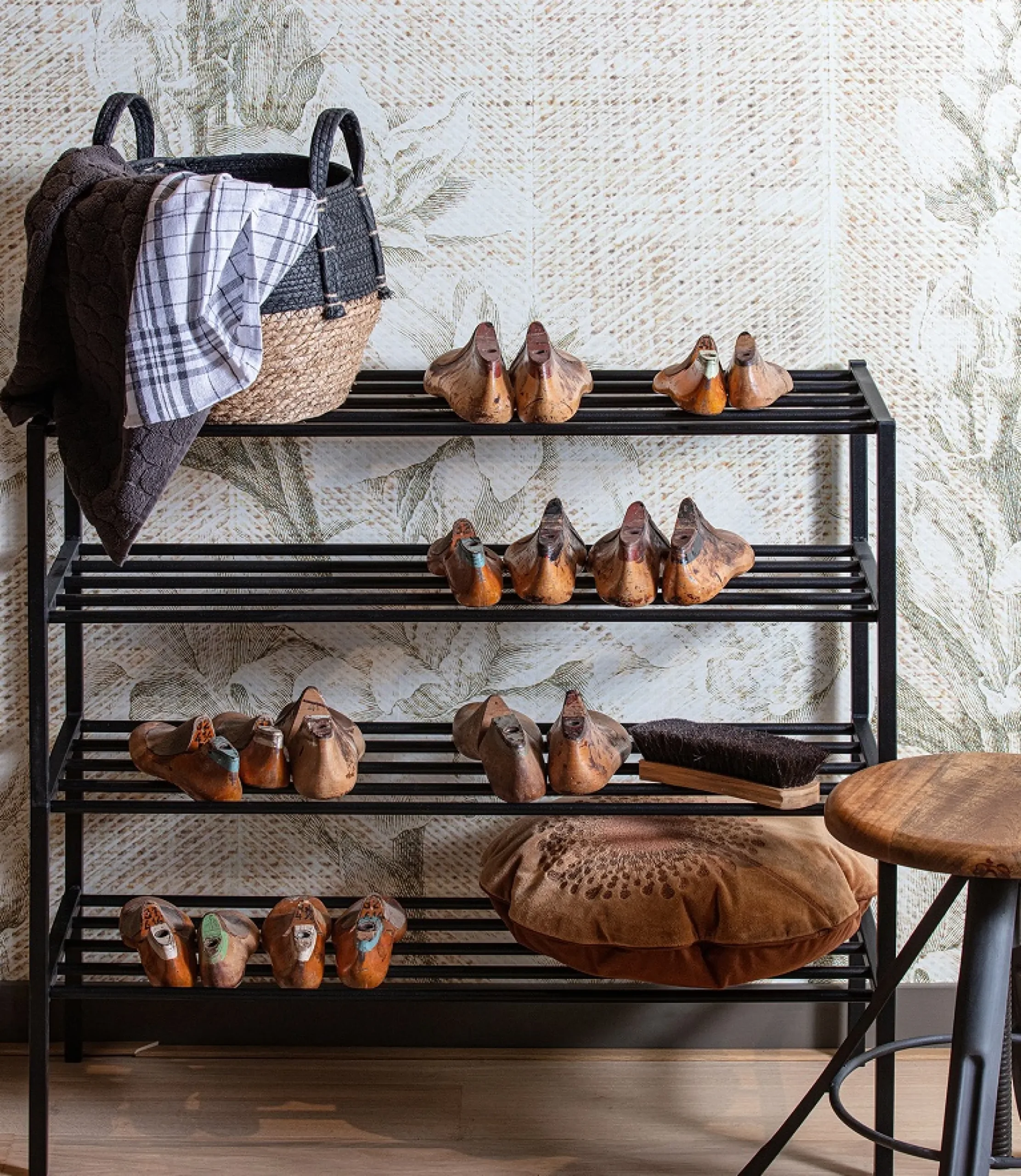 Das Schuhregal Ferro ist ein eigener Entwurf aus der Kollektion der niederländischen Marke WOOOD. Ferro ist aus Metall gefertigt und hat eine pulverbeschichtete, schwarze Oberfläche. Das praktische an diesem Metallregal ist, dass es stapelbar und somit beliebig erweitert werden kann. Durch die verschiedenen Regalhöhen ist dann auch schnell mal eine komplette Garderobenwand mit Platz für Jacken gebaut. Die Höhe der Fächer beträgt 18 cm, die maximale Tragfähigkeit beläuft sich auf 15 kg.