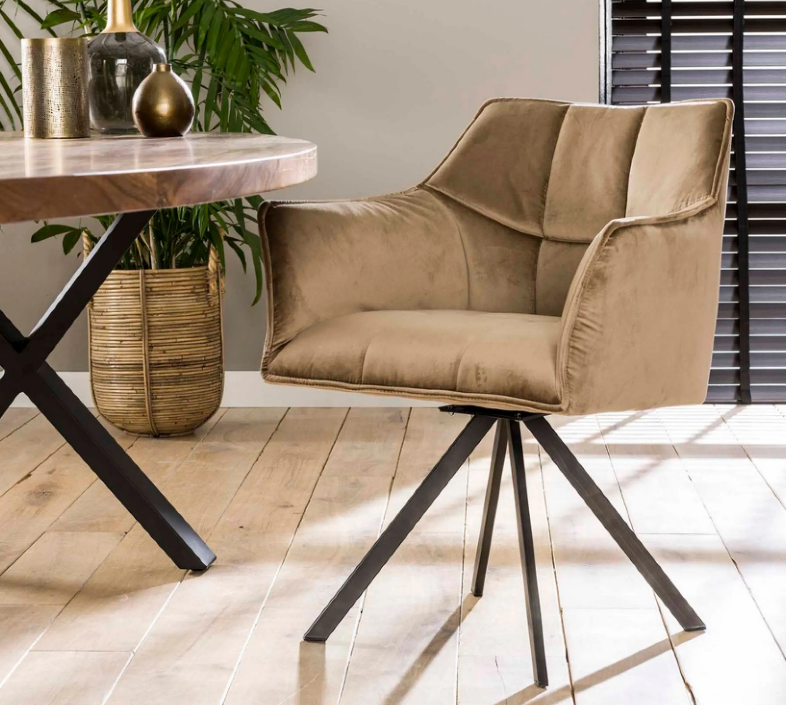 Herrlich elegantes Esstischset Raster Velour aus der Vintagehaus Serie. Sie begeistert durch den modernen beigen Samt-Look in Verbindung mit den schwarzen ausgestellten Metallbeinen. Auf der Bank haben vier Leute gut Platz und möchten diesen, dank der bequemen Polsterung, auch nicht mehr so schnell verlassen. Die passenden Armlehnstühle haben den gleichen Samtbezug und die charakteristische Absteppung. Die Stühle sind um 360 Grad drehbar.