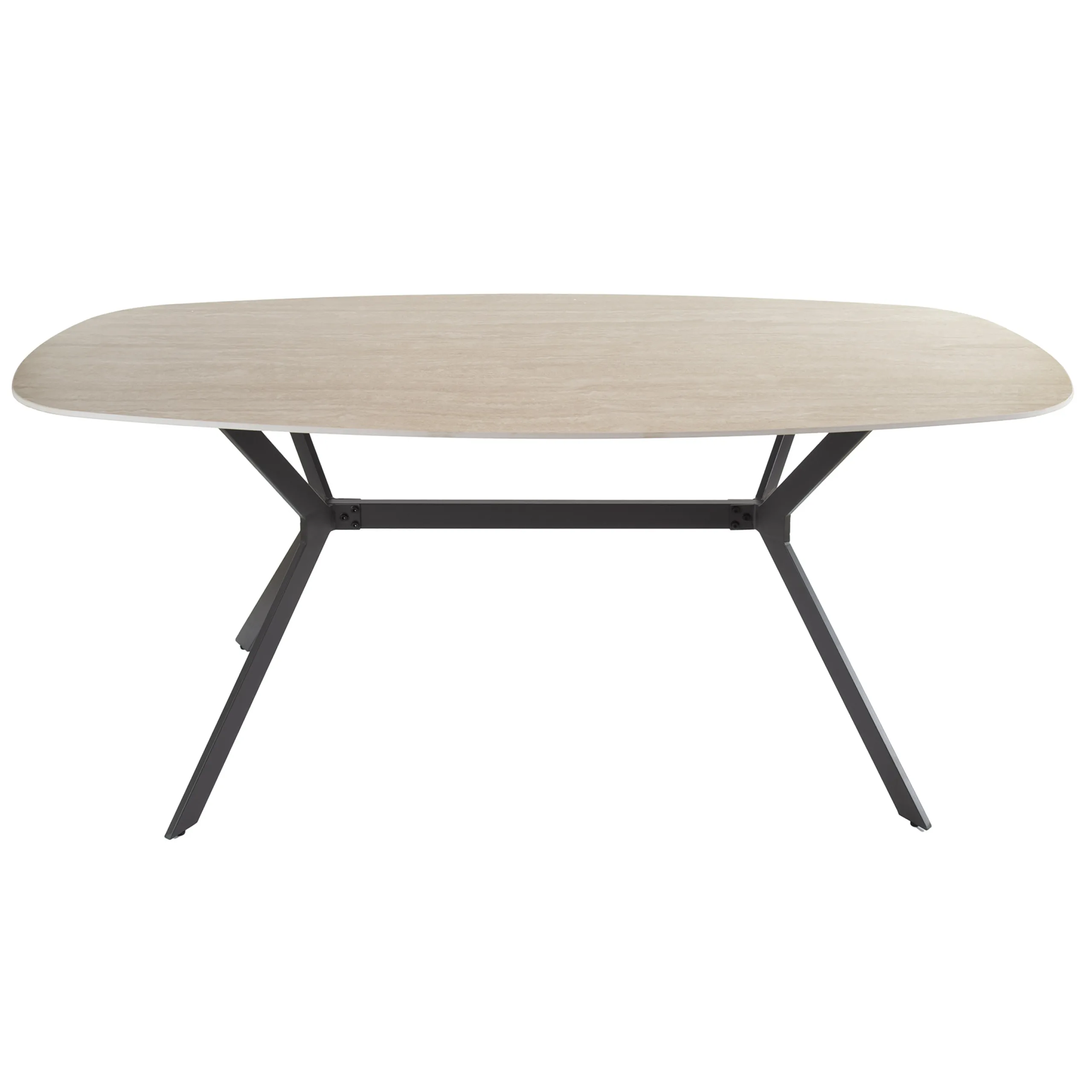 Mit seiner organischen, sanften Form sorgt der Esstisch Arch Organic für Natürlichkeit und setzt mit seinem einzigartigen Design ein Statement. Die weichen und runden Formen erinnern an Steine, die von Wind, Wasser und Sand geformt wurden. Mit diesem großen Tisch erhalten Sie ein ästhetisches Highlight für Ihr Zuhause, das aus hochwertigem Travertin-Keramik und Metall hergestellt ist. Travertin ist ein Kalkstein von heller, meist gelblicher und brauner oder seltener beiger oder roter Farbe, der aus kalten, warmen oder heißen Süßwasserquellen stammt.Die Tischplatte bietet ausreichend Platz für Familie und Gäste. Das Design des Gestells ist minimalistisch und funktional, mit schräg gestellten Beinen, die eine robuste Basis und gleichzeitig ein elegantes Erscheinungsbild bieten. Durch die clevere Anordnung der Verstrebungen wird die Stabilität erhöht, ohne das Gesamtbild zu überladen.