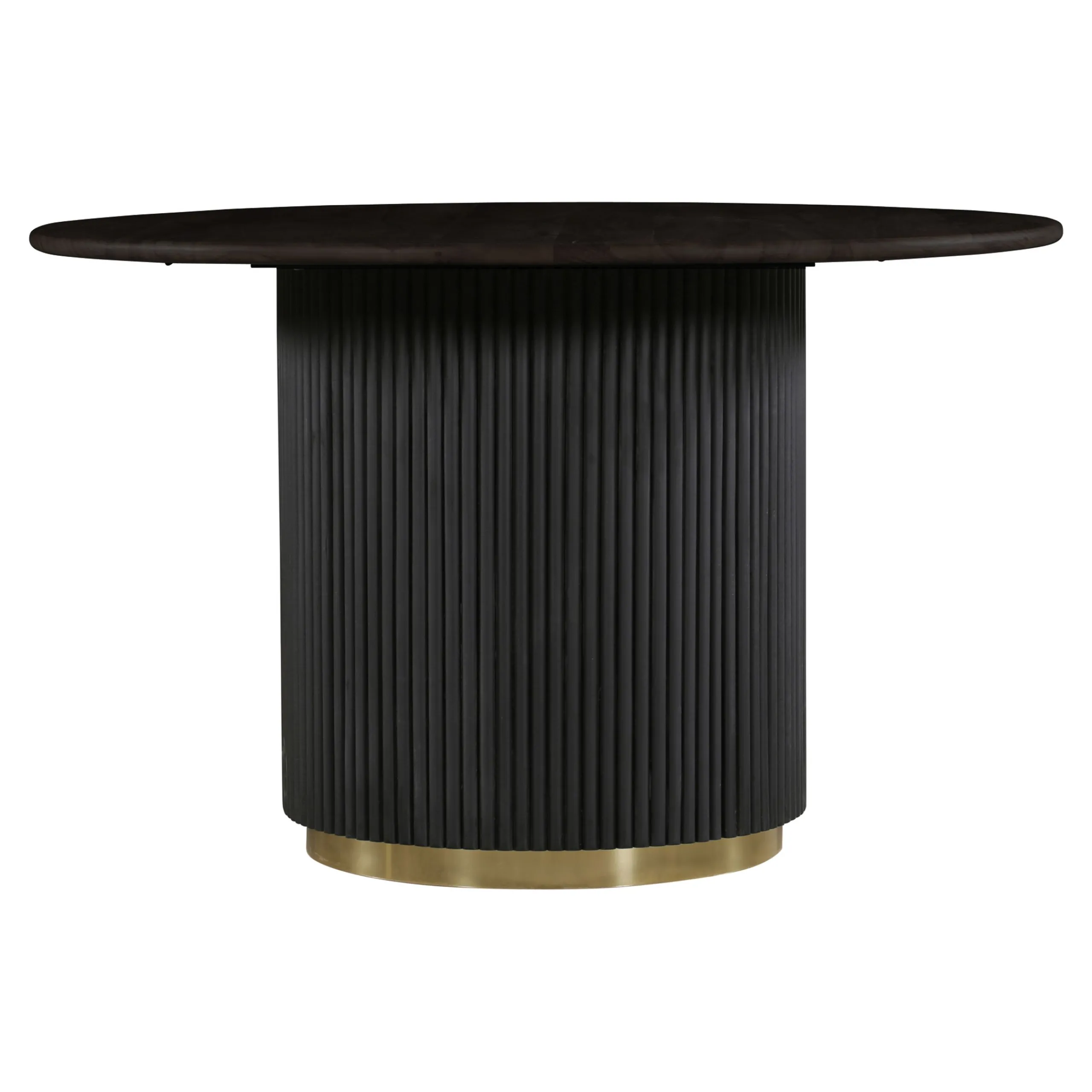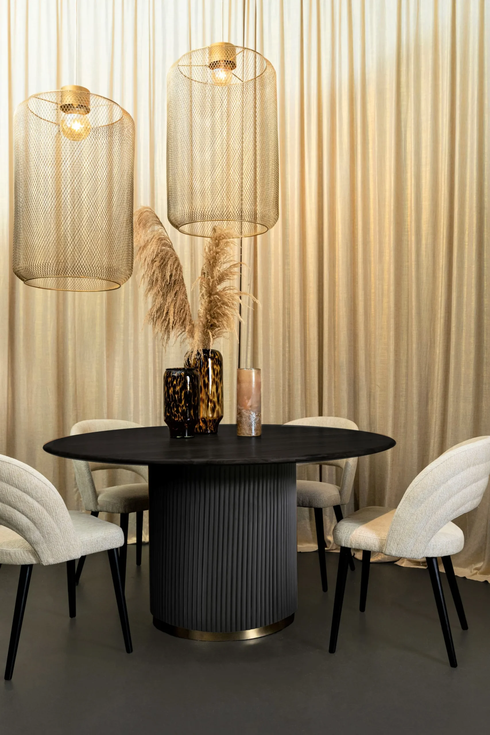 Tische bilden meistens den zentralen Mittelpunkt eines Zimmers, sie werden mehrere Male am Tag genutzt und hier kommt man mit Familien und Freunden zusammen. Zu diesem Zweck führen wir den wunderschön gestalteten Esstisch Xelle. Das Akazienholz hat eine natürliche Maserung und eine schöne Farbgebung. Das Highlight ist das zylinderförmige Tischbein mit goldenem Metallfuß, das raffiniertes Design und Stabilität verbindet. Die Platte ist aus massiver Eiche. Die gebürstete Sandstrahltechnik macht die Holzmaserung deutlich sichtbar und verleiht dem Tisch ein lebendiges Aussehen. Der Holztisch ist das perfekte Gleichgewicht zwischen runden und geraden Linien; eine minimalistische und trotzdem ausgefallene Esstischlösung, die in jedem Esszimmer ein echter Hingucker sein wird. Der Tisch bietet bequem Platz für vier bis sechs Personen, ist pflegeleicht, langlebig und wird jahrelang stilvoll bleiben.