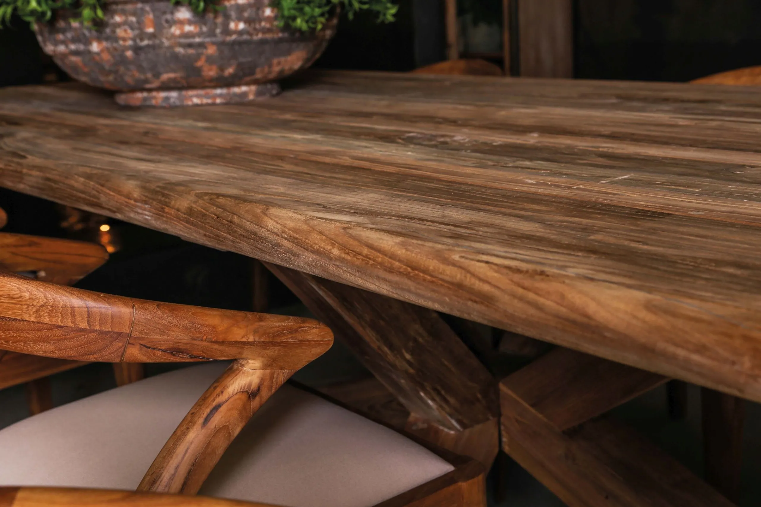 Das Design, die ausgeprägte natürliche Maserung und die abgerundeten Ecken – so vielfältig setzt der Esstisch Bali Akzente! Kombiniert mit den verästelten Massivholzbeinen ergibt das Ganze einen Esstisch in aufwändiger Möbelbaukunst. Die einzeln eingesetzten recycelten Teakholzstreben erzeugen eine urige Platte, somit ist jeder Tisch ein Einzelstück. Der Tisch wirkt sowohl Drinnen wie Draußen, aufgrund des robusten Teakholzes kann er im Freien verwendet werden. Das Holz kann dadurch mit der Zeit ein verwittertes Aussehen bekommen. Mit Teaköl ist hier schnell Abhilfe geschafft. Regelmäßiges Ölen ist die einzige Pflege die dieser Tisch benötigt.