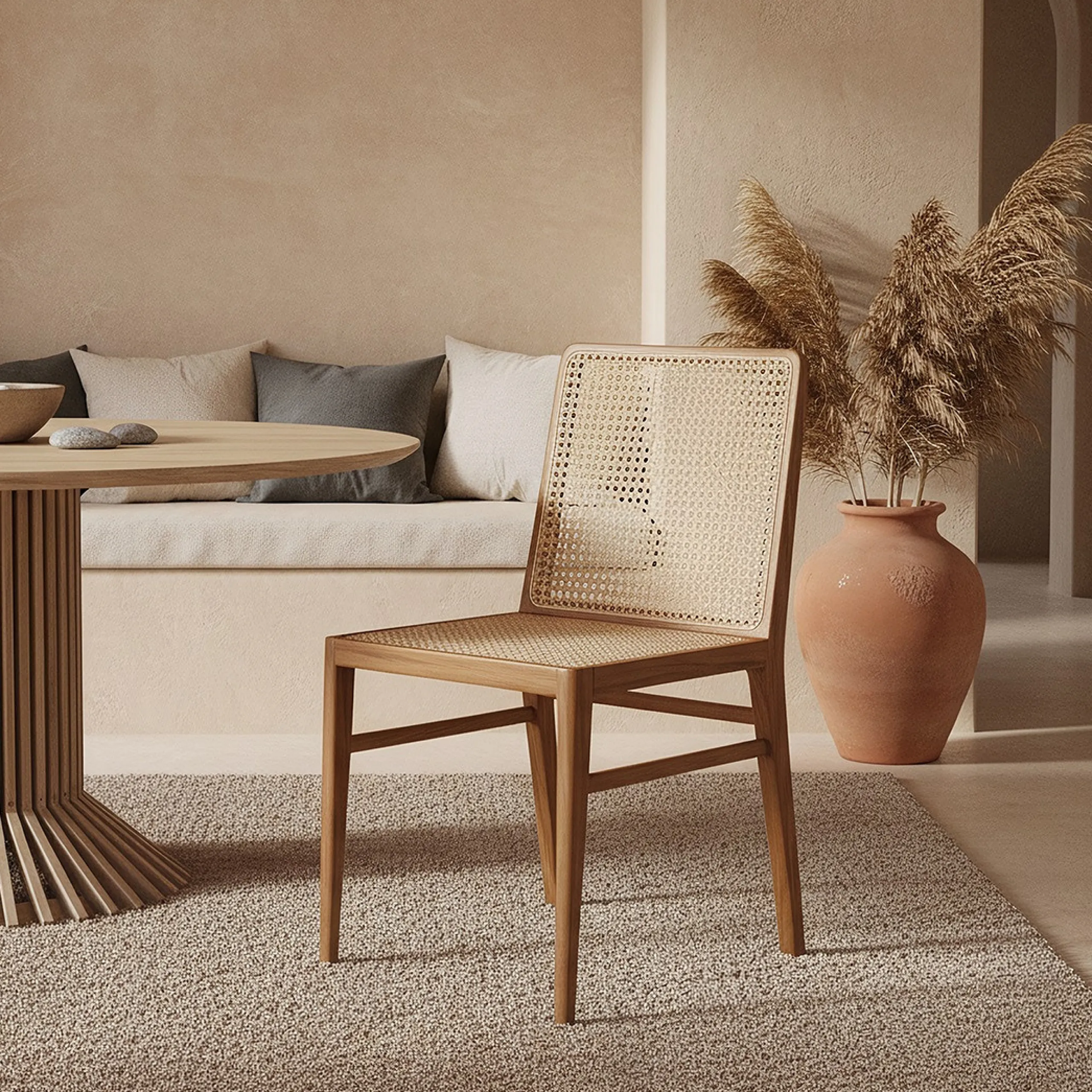 Dieser bequeme Esszimmerstuhl besteht aus Teak-Holz und ist ein wunderbarer Stuhl, um Ihren Tisch mit der richtigen Sitzgelegenheit zu komplimentieren. Seine Sitzfläche und die Rückenlehne sind aus Rattan im angesagten Wiener Geflecht. Er verleiht jedem Innenraum eine besondere Note. In braun oder schwarz, ist für jeden Stil etwas dabei.