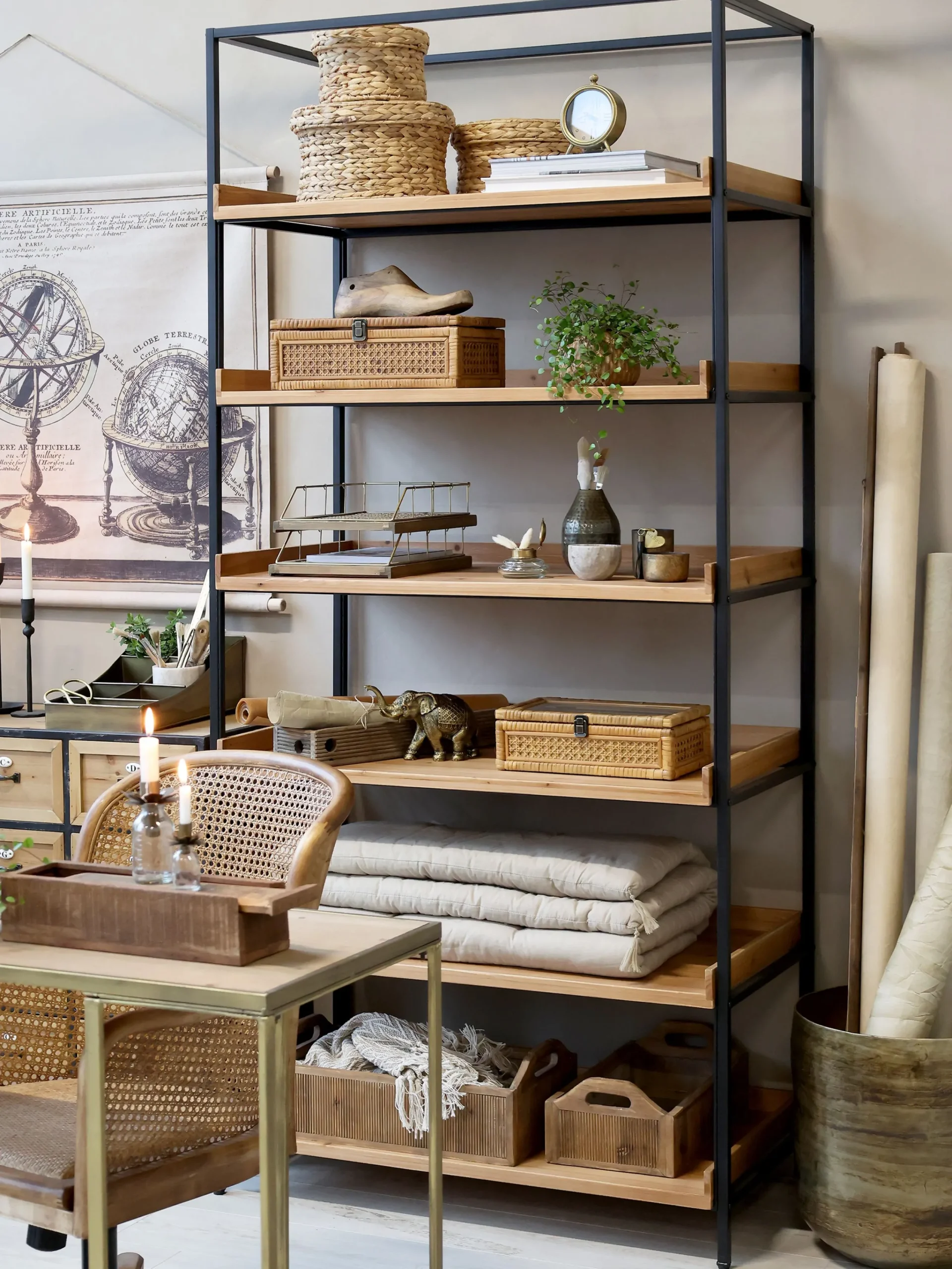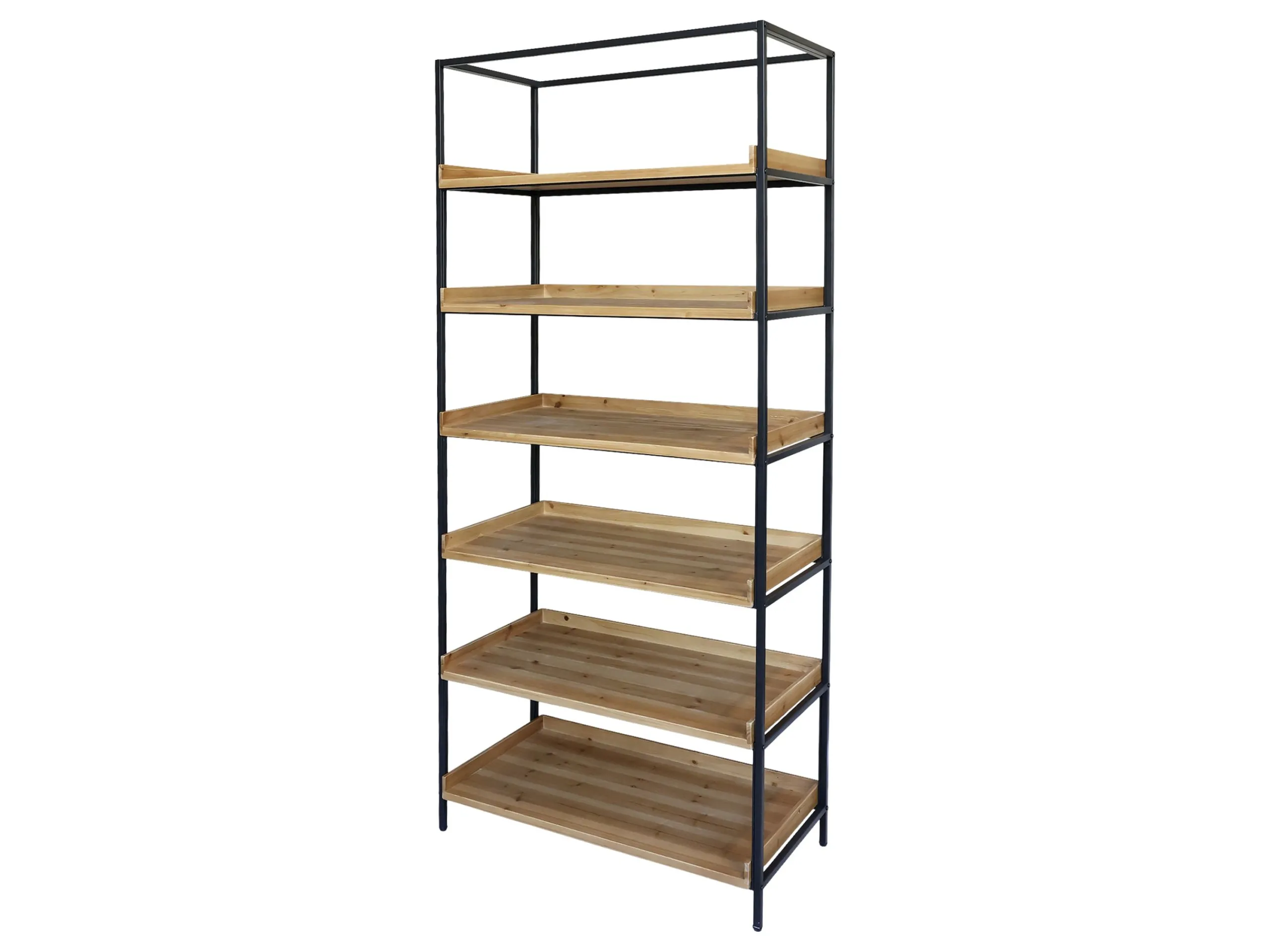 Mit seinen 6 Holzböden ist das offene Regal Raphaël in der Küche ein perfektes Möbelstück, um Geschirr, Gläser oder auch Vorratsgläser zu platzieren. Im Wohnraum können Sie sich dekorativ austoben: Bildbände, Pflanzen, Vasen, Körbe und hübsche Dinge die Ihnen am Herzen liegen, finden ausreichend und luftig ihren Platz. Die warme Farbe des Holzes kontrastiert wunderbar mit dem schwarzen Used-Look Metallrahmen des Regals. Stabil und robust kann es also perfekt in jeden Raum Ihrer Wahl gestellt werden.