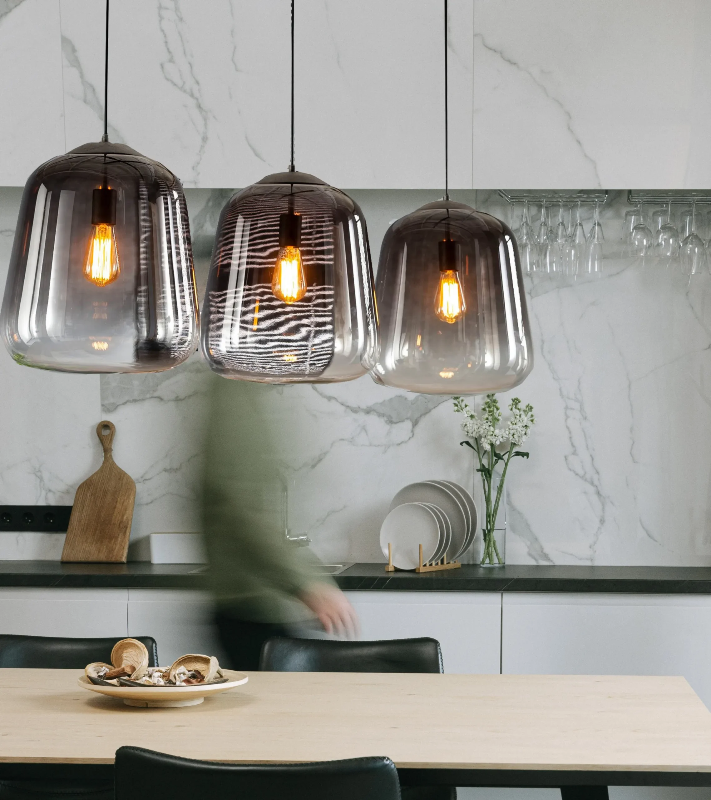 An der altsilbernen Metalleiste sind drei Glasschirme in getönter Färbung befestigt. Der Farbverlauf und Form der Schirme begünstigt eine besondere und gleichmäßige Lichtverteilung. Durch Beschaffenheit und Färbung des Glases erhält das Licht eine warme und wohnliche Note. Die Hängelampe Bulb Shaded XL bringt edles Wohndesign in Ihr Zuhause. Kleine Lufteinschlüsse im Glas können vorkommen und sind bei der Produktion nicht zu vermeiden, sie sind wie Schönheitsflecken anzusehen. Der Tisch sollte mindestens 2 Meter Länge haben, die Lampe ist 150 cm breit. Wird sonst eng an den Kopfseiten.