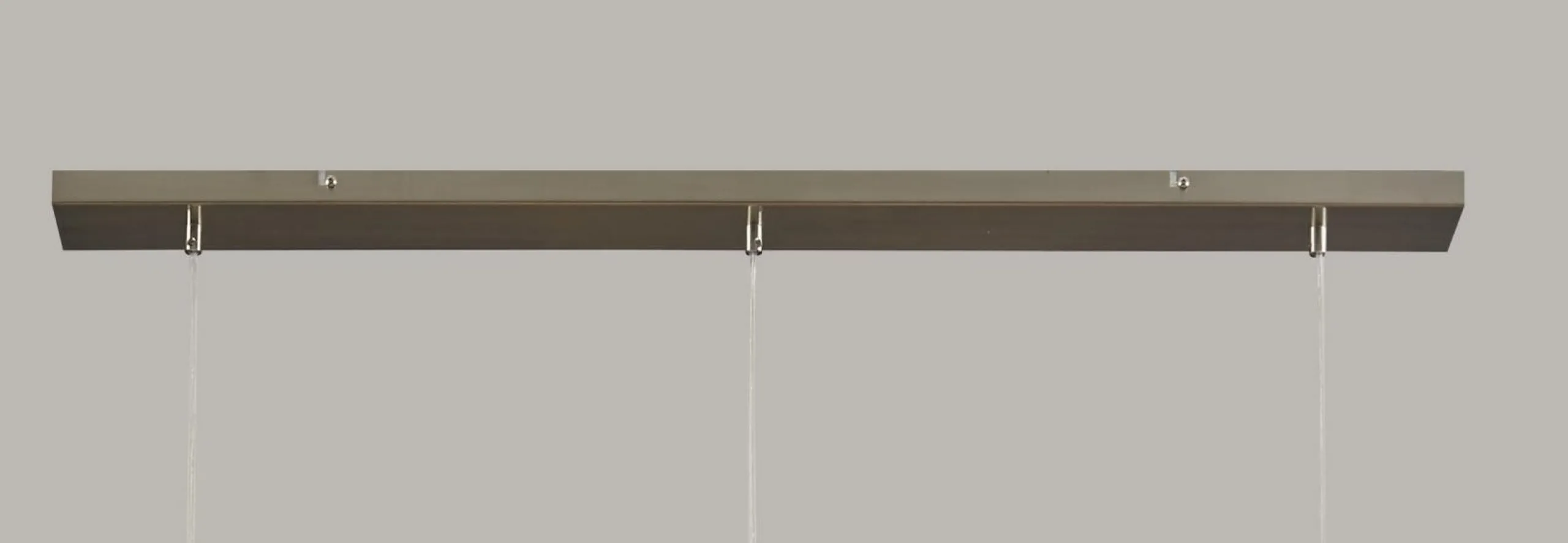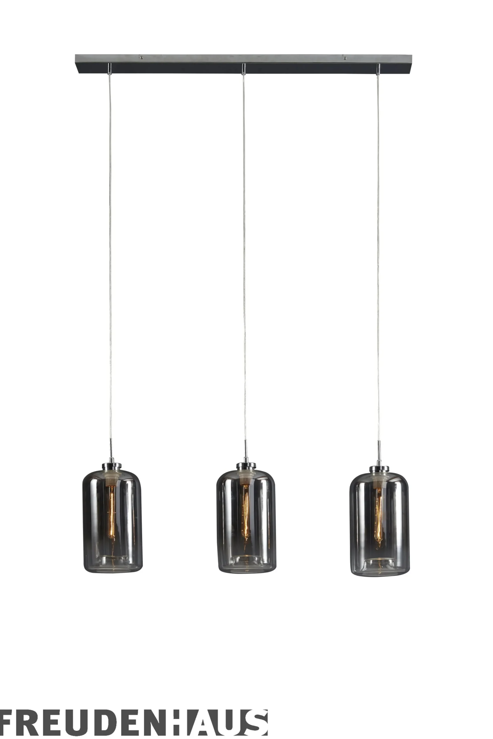 Die drei Glaszylinder beleuchten den Esstisch auf angenehme Weise und verbreitet einen wohnlichen Flair. Die Lampe hat eine chromfarbene Deckenleiste, in der die Kabel zusammenlaufen.