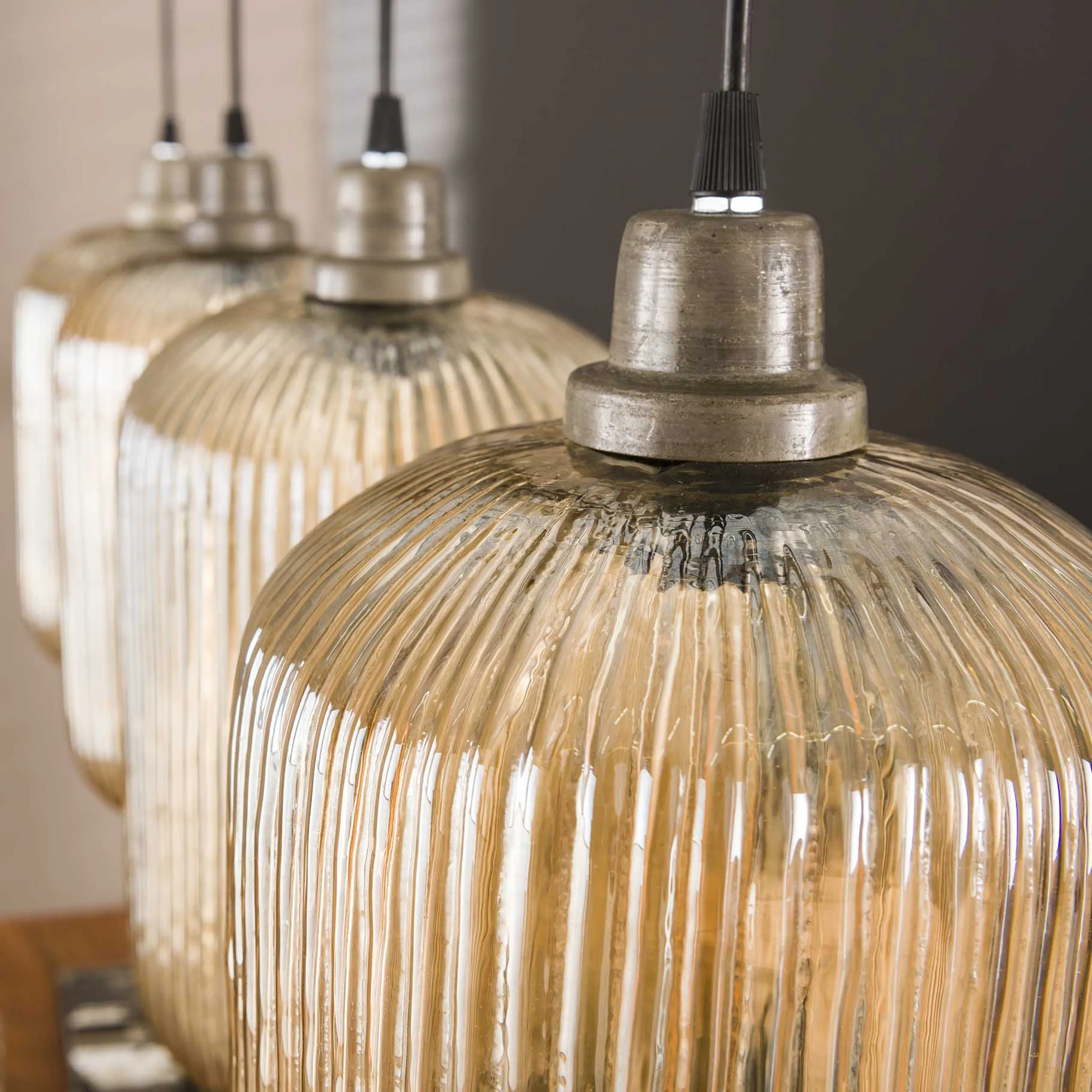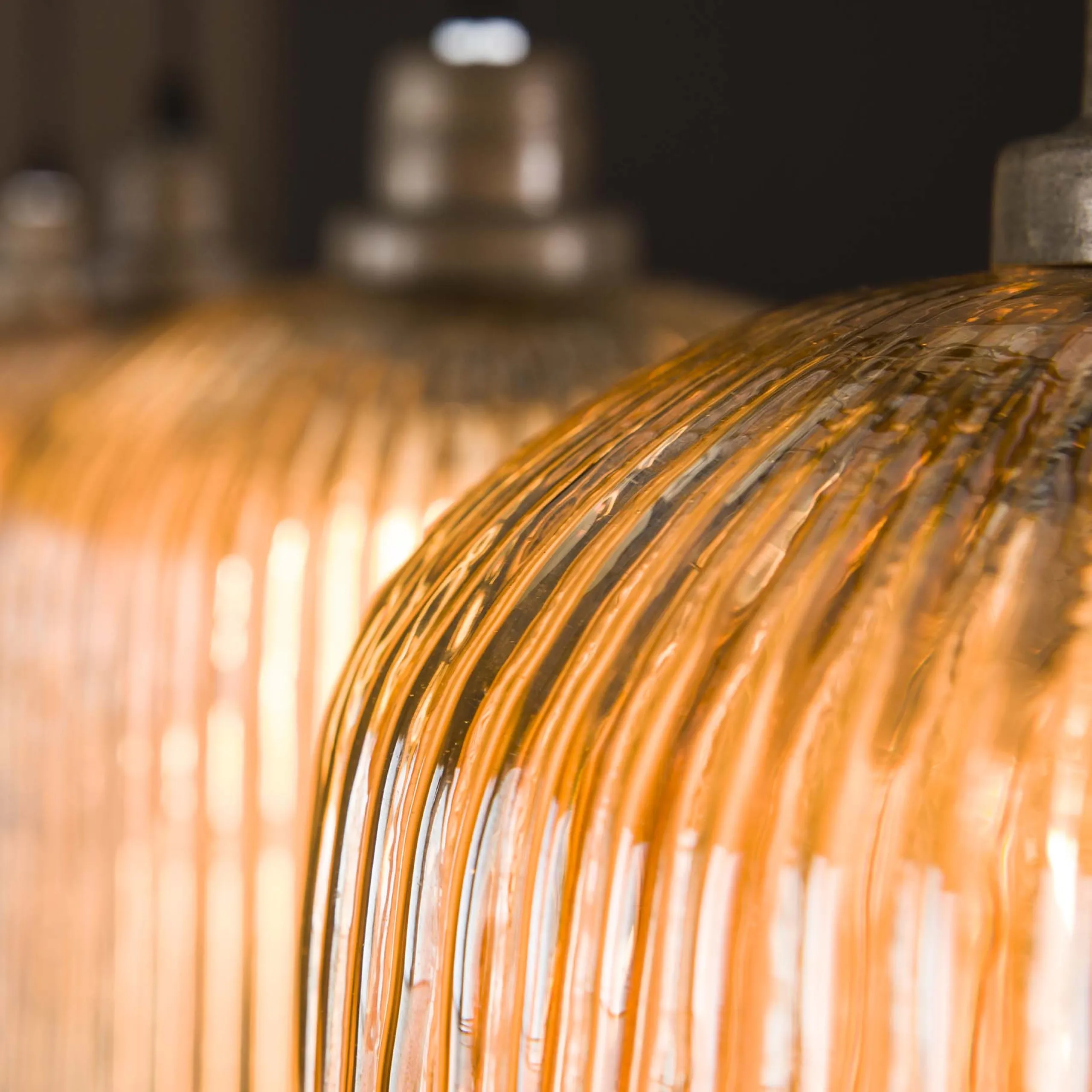 Die Pendelleuchte Retro Stripes ist eine wunderschön gestaltet Lampe die mit ihren vier Schirmen für ein raumgreifendes Beleuchtungsszenario sorgt. Dank des bernsteinfarbenen Glases wird der Raum schön und ansprechend durch die eleganten Lampenschirme beleuchtet. Die Schirme sind individuell bis zu 150 cm höhenverstellbar. So lässt sich die Lampe spielerisch nach eigenem Ermessen arrangieren. Das Glas ist mundgeblasen, also handgefertigt. Das macht jedes Glas einzigartig und deswegen sind kleine Unebenheiten und Luftblasen unvermeidlich. Es sind die kleinen Unterschiede, die jedem Glas seinen eigenen Look und Charme verleihen.