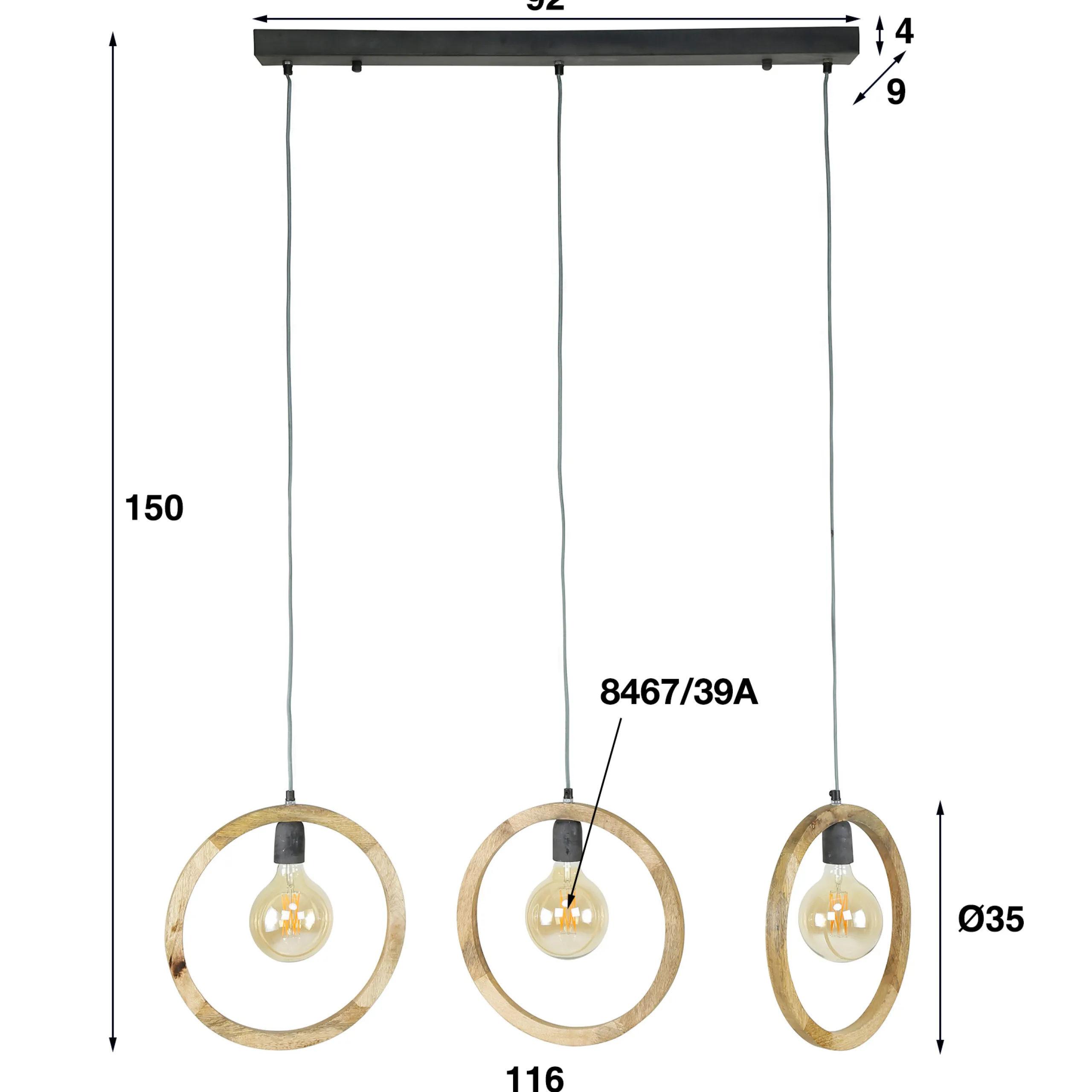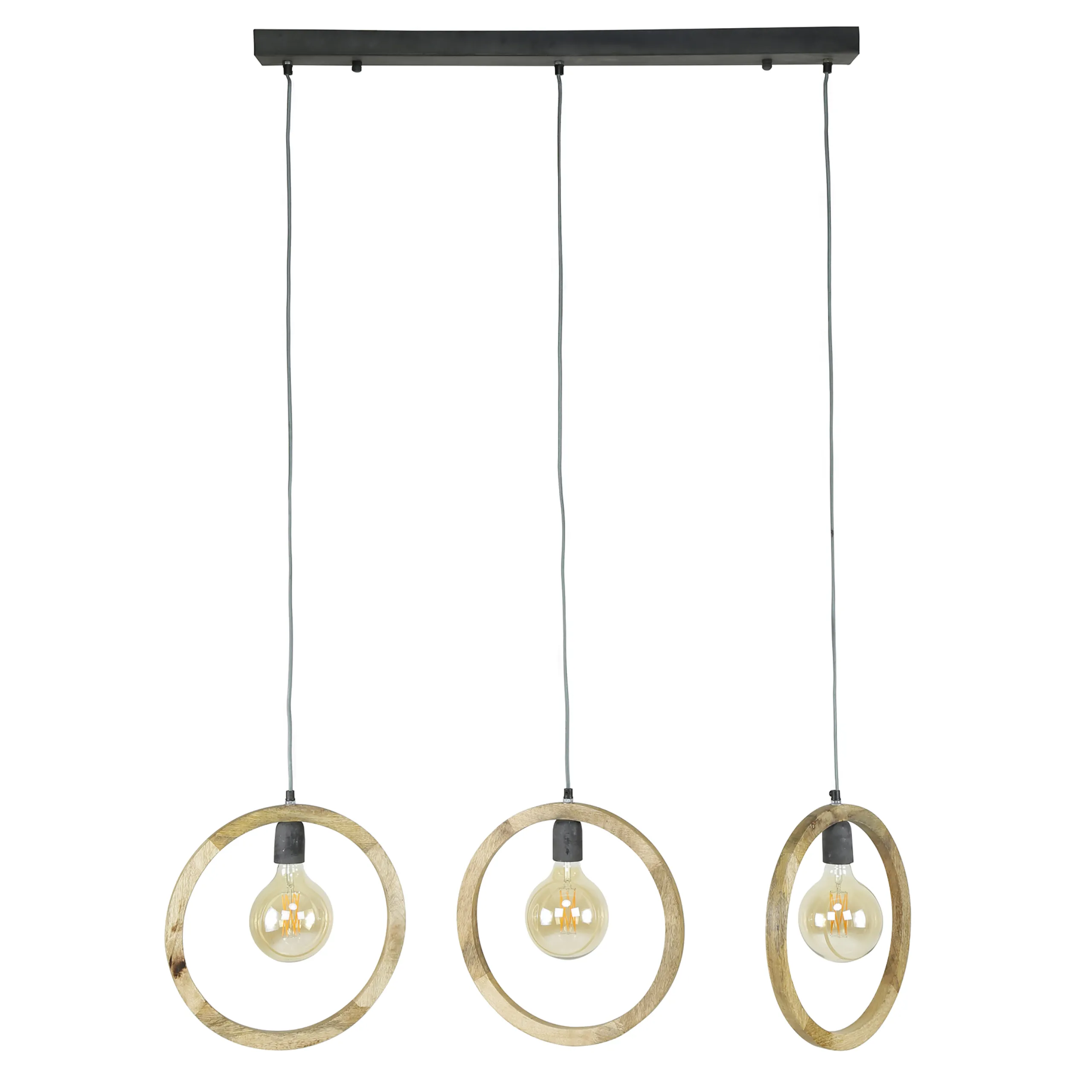 Die drei kunstfertig gearbeiteten, kreisförmigen Lampenschirme aus Holz geben durch das offene Design den Blick auf die Glühlampen frei. So verteilt sich das Licht gleichmäßig im Raum. Auch im ausgeschaltenen Zustand zieht die Lampe durch die schönen Holzringe die Blicke auf sich. Das Mangoholz mit der tollen Maserung in Kombination mit den Glühfadenbirnen lässt die Lampe zum wortwörtlichen Highlight Ihres Zuhauses werden.