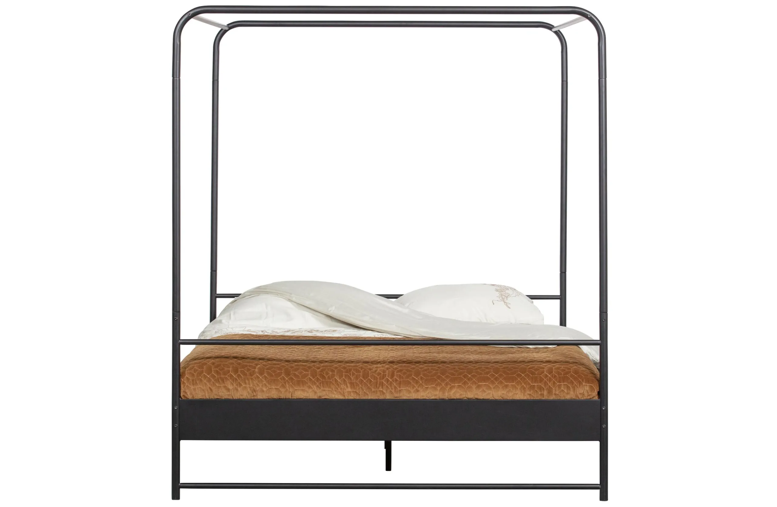 Das Metallbett Koje stellt die moderne Variante eines Himmelbettes dar, ganz schlicht und puristisch. Mit der passenden Dekoidee können Sie Ihrem Schlafzimmer aber ganz schnell einen persönlichen Touch verleihen und das Bett individuell gestalten. Das Bett ist aus pulverbeschichtetem Metall und hat einen Stahllattenrost. Das Gestell ist abgerundet, was dem Look etwas verspieltes gibt. Die Schlichtheit des Designs des Bettes sorgt für einen vielseitig kombinierbaren Stil.