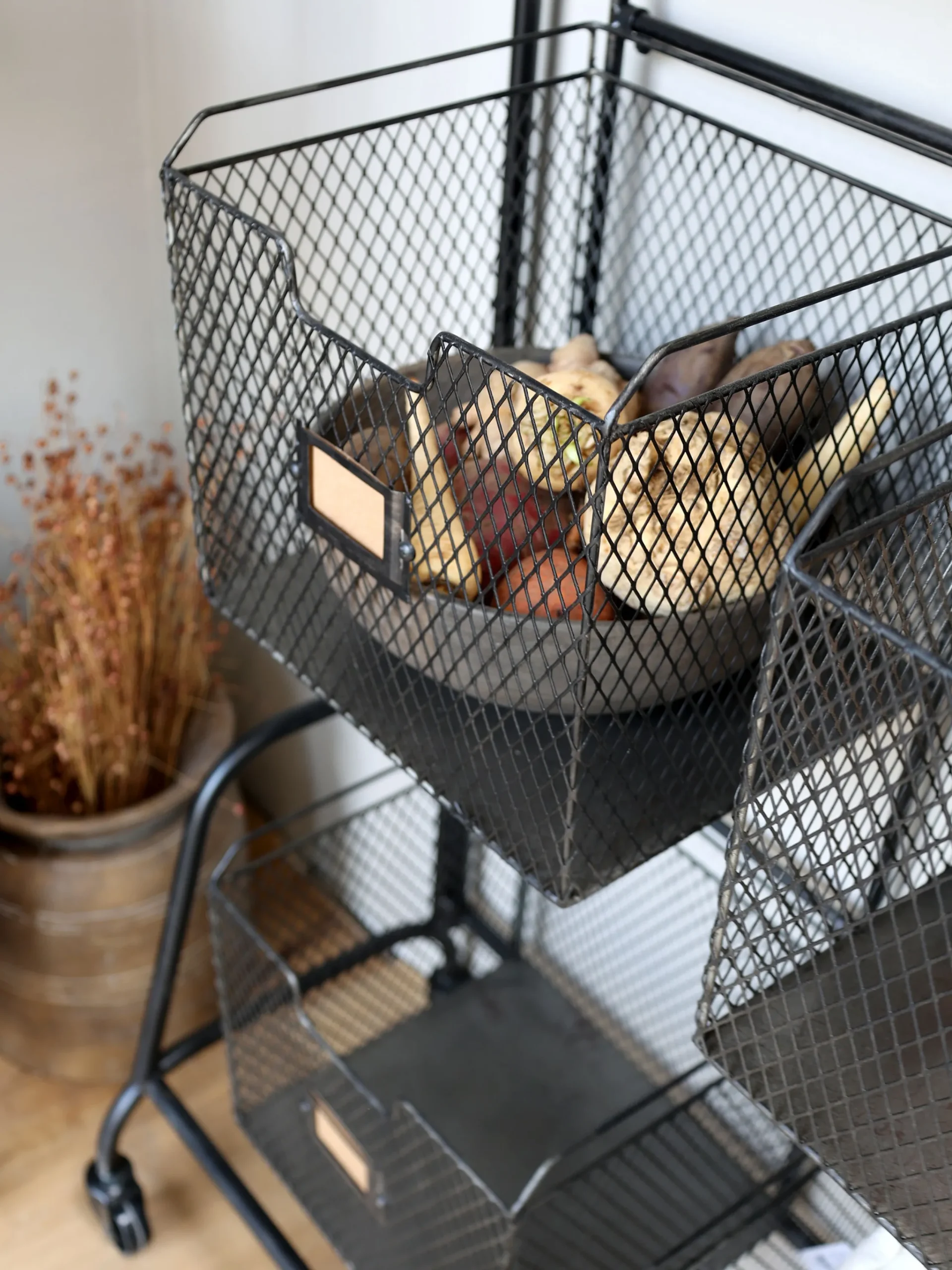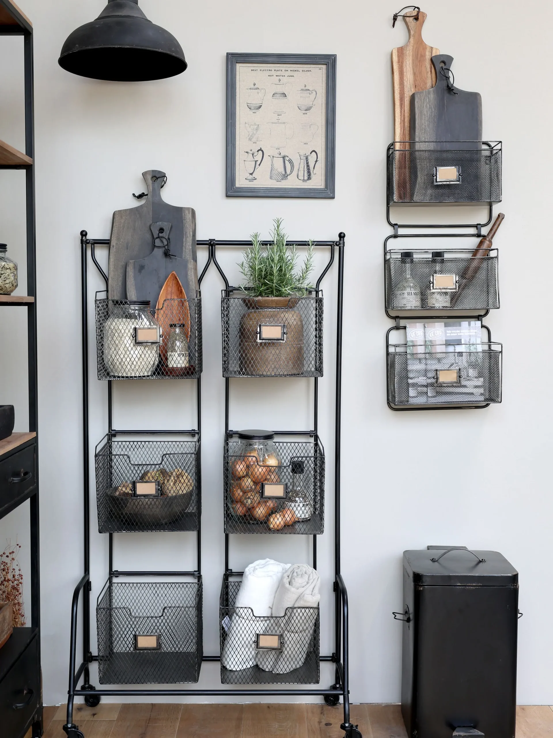 Das Regal ist für so viele Möglichkeiten offen: In den 6 Körben hat der Hobbykoch in der Küche die Möglichkeit seine Utensilien und Vorräte sortiert aufzubewahren. Auch für den Kleinkram zum Basteln, in der Werkstatt oder Gartenutensilien können Sie in den Gitterboxen verstaut werden. In die Etikettenhalter können Sie Beschriftungsschilder schieben. Durch die feststellbaren Rollen ist das Regal schnell mal an einen anderen Standort geschoben.