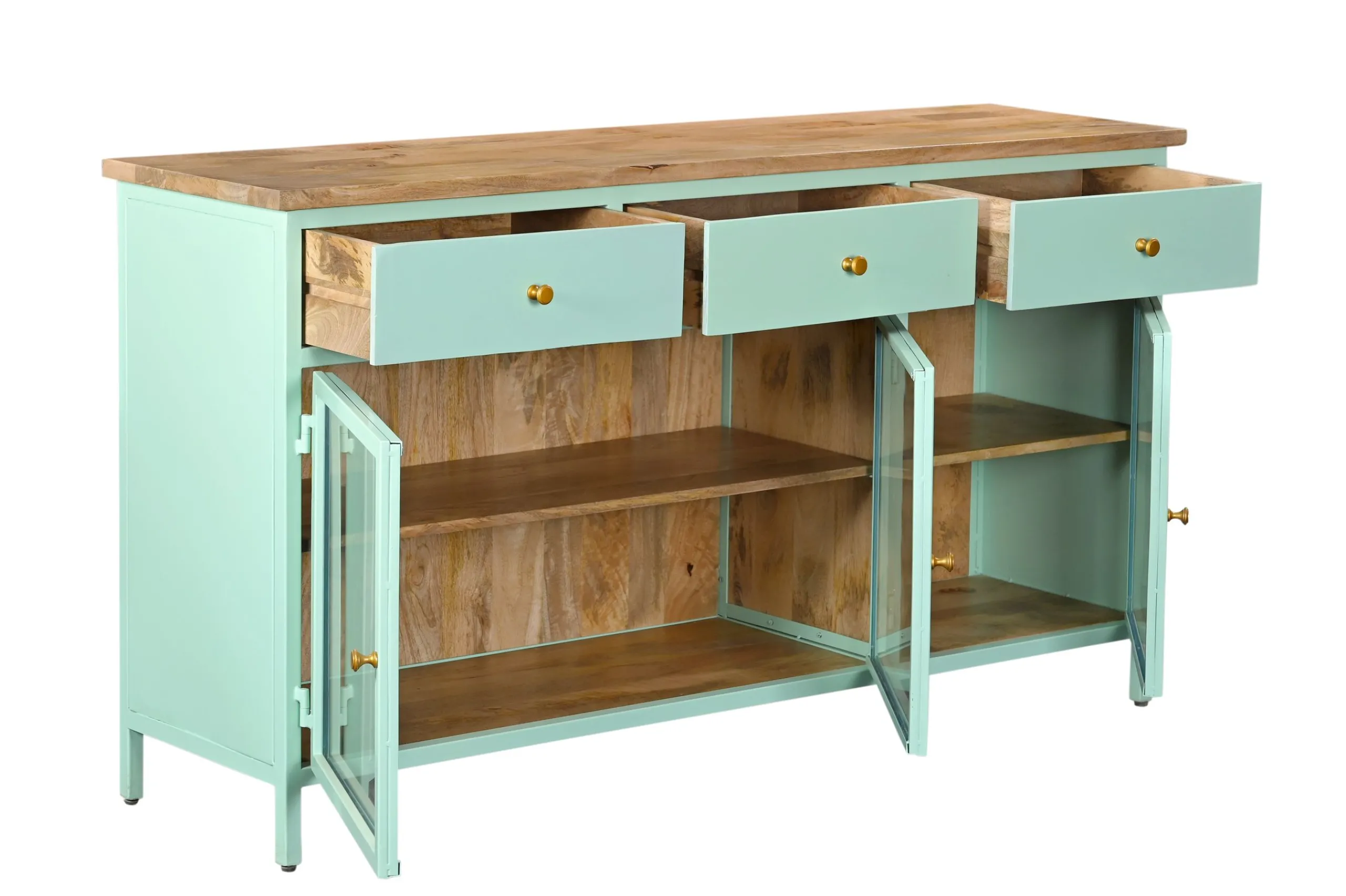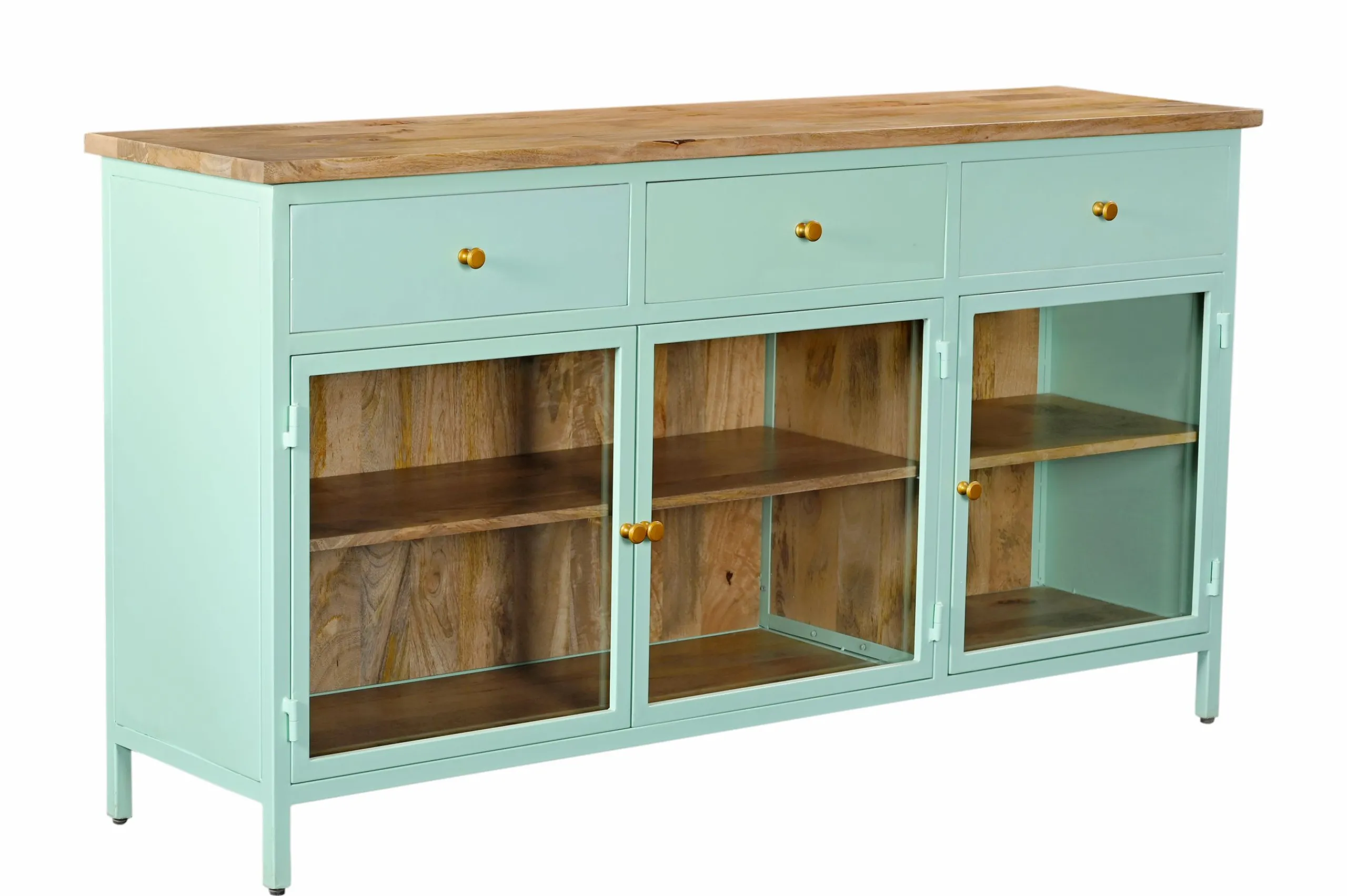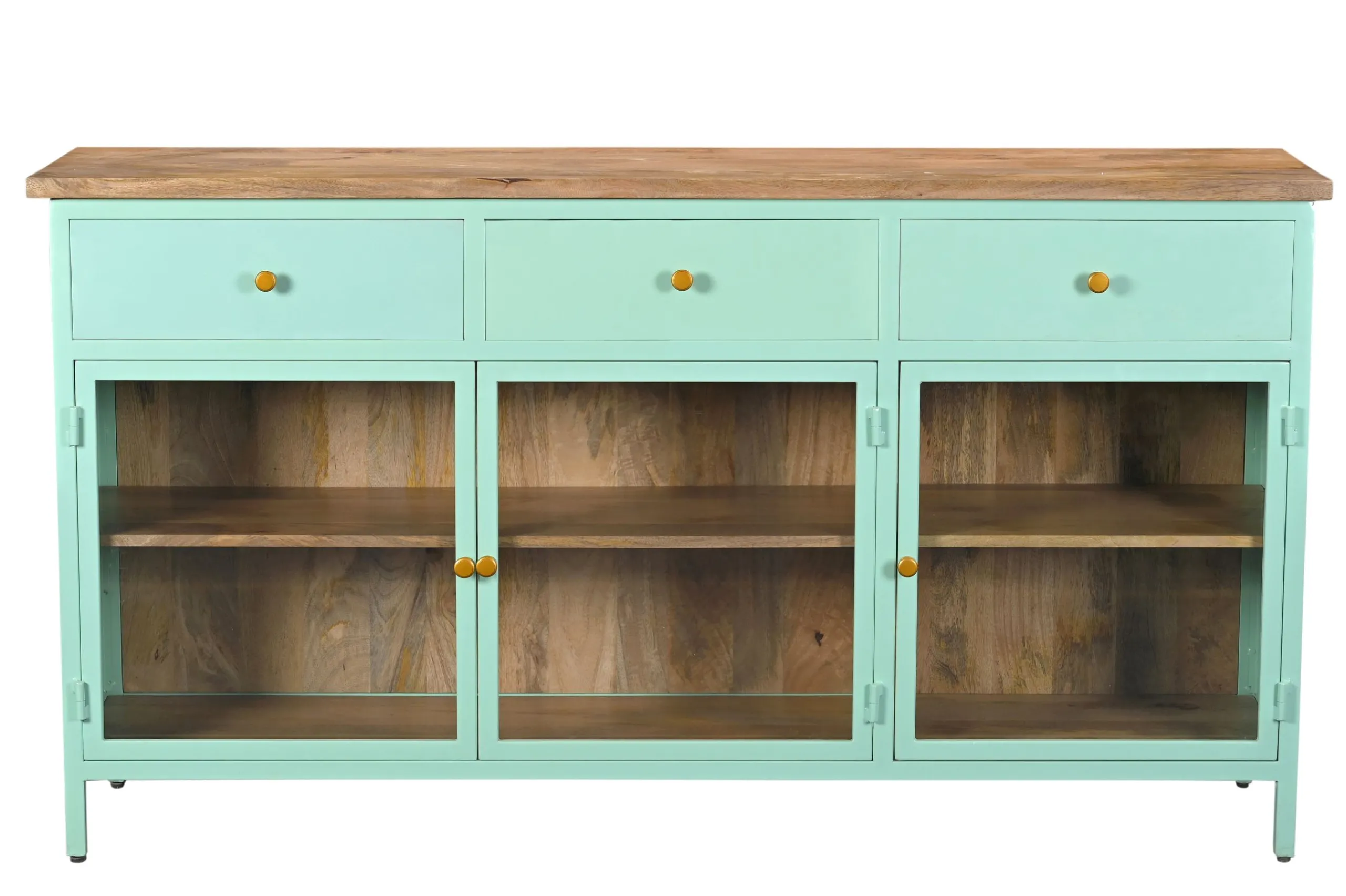 Das Sideboard Provence ist ein wahr gewordener Retro-Traum aus Metall, Holz und Glas! Es entfaltet seine besondere Raumwirkung durch das gekonnte Zusammenspiel von Farben und Materialien. Der Korpus ist komplett aus Metall, das Innenleben aus wunderschön gemasertem Mangoholz. Die zahlreichen Glaselemente verleihen eine außergewöhnliche Transparenz. Neben der großzügigen Ablagefläche begeistert der Vitrinenschrank als Showbühne für Ihre Bücher, Weingläser, Porzellan oder Wohnaccessoires. Zusätzlichen Stauraum bieten die drei Schubladen. Abgerundet wird das Ganze mit goldenen Griffen. Und der ganz große Auftritt ist dank der Farbgebung garantiert sicher!