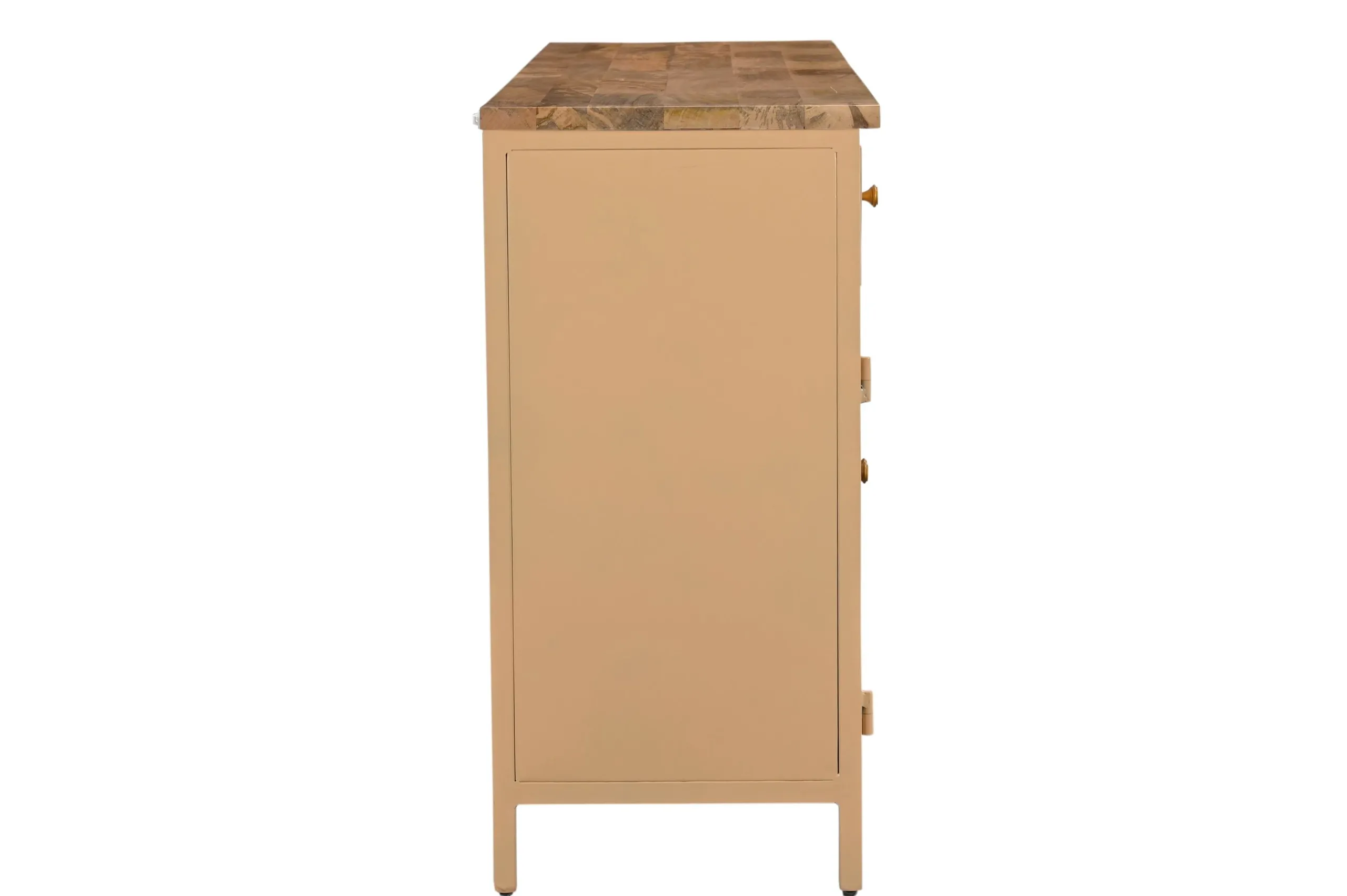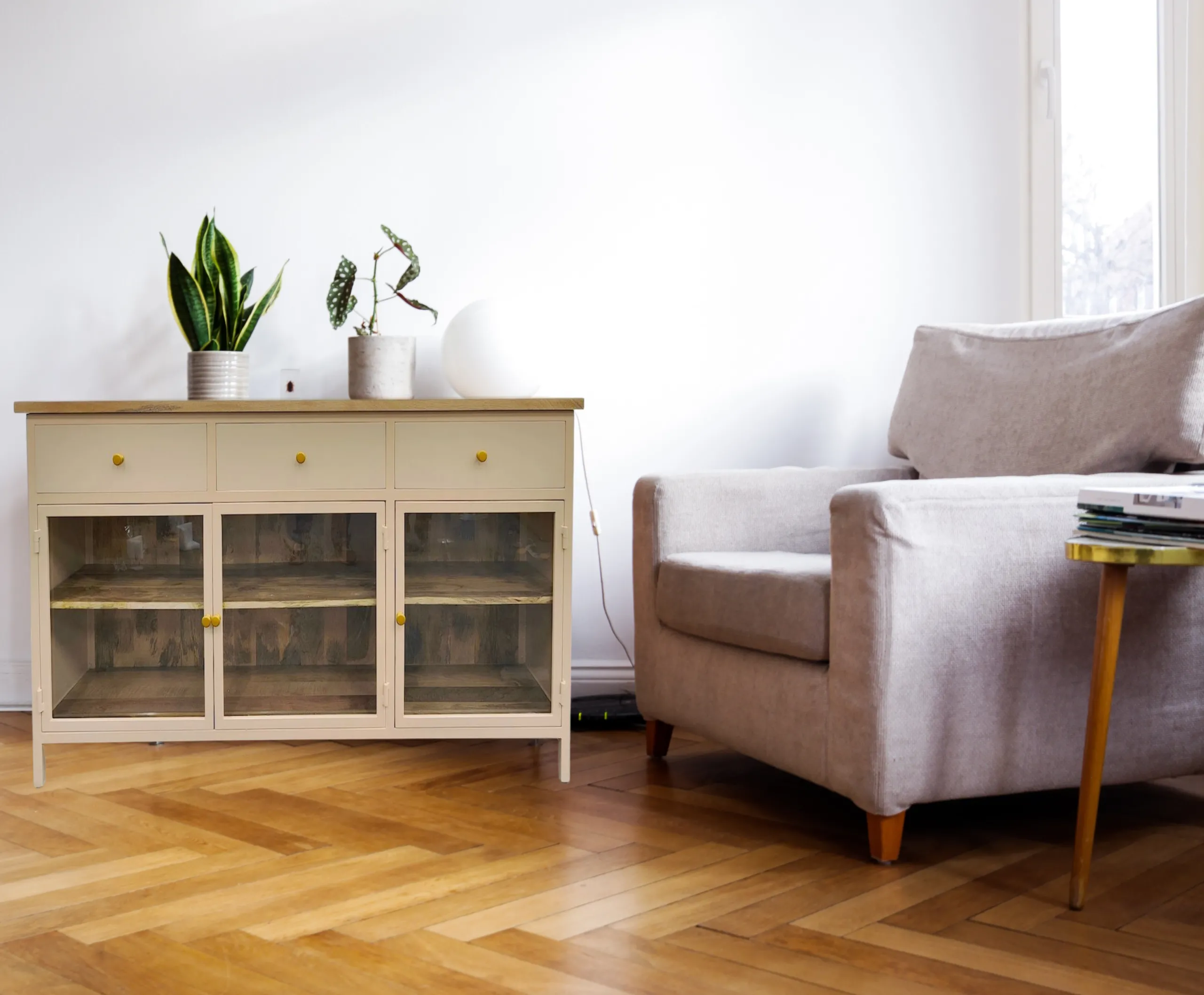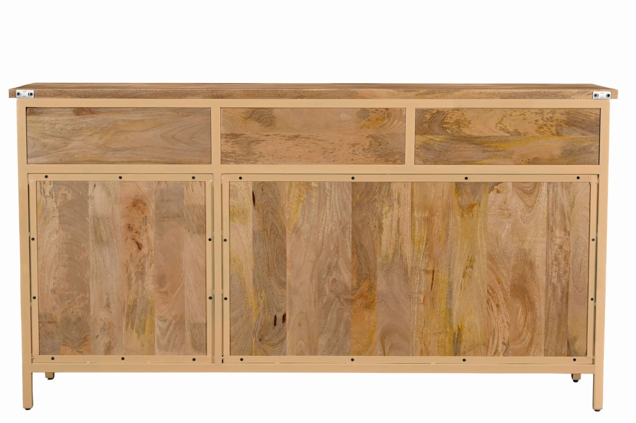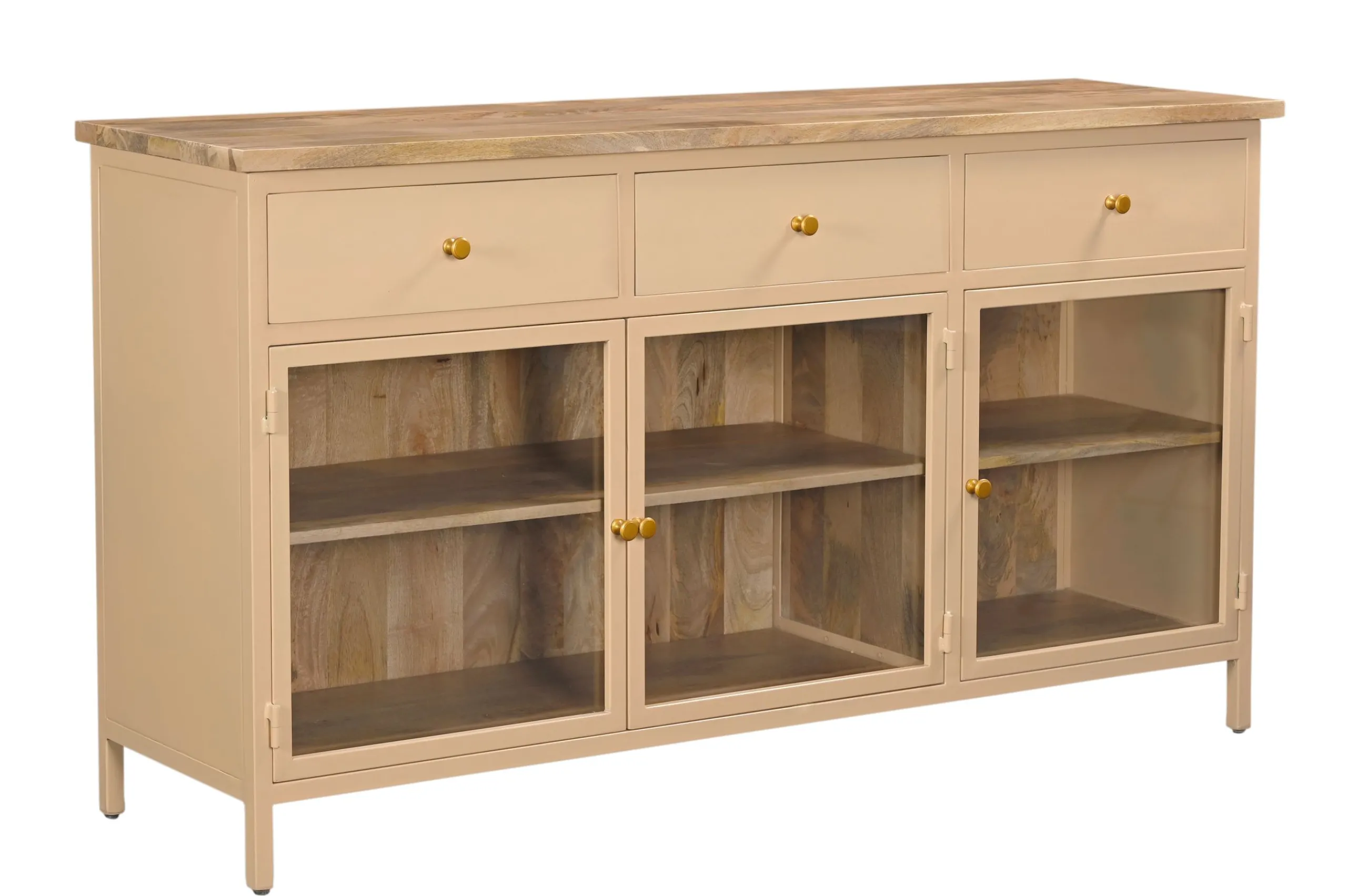 Das Sideboard Provence ist ein wahr gewordener Retro-Traum aus Metall, Holz und Glas! Es entfaltet seine besondere Raumwirkung durch das gekonnte Zusammenspiel von Farben und Materialien. Der Korpus ist komplett aus Metall, das Innenleben aus wunderschön gemasertem Mangoholz. Die zahlreichen Glaselemente verleihen eine außergewöhnliche Transparenz. Neben der großzügigen Ablagefläche begeistert der Vitrinenschrank als Showbühne für Ihre Bücher, Weingläser, Porzellan oder Wohnaccessoires. Zusätzlichen Stauraum bieten die drei Schubladen. Abgerundet wird das Ganze mit goldenen Griffen. Und der ganz große Auftritt ist dank der Farbgebung garantiert sicher!