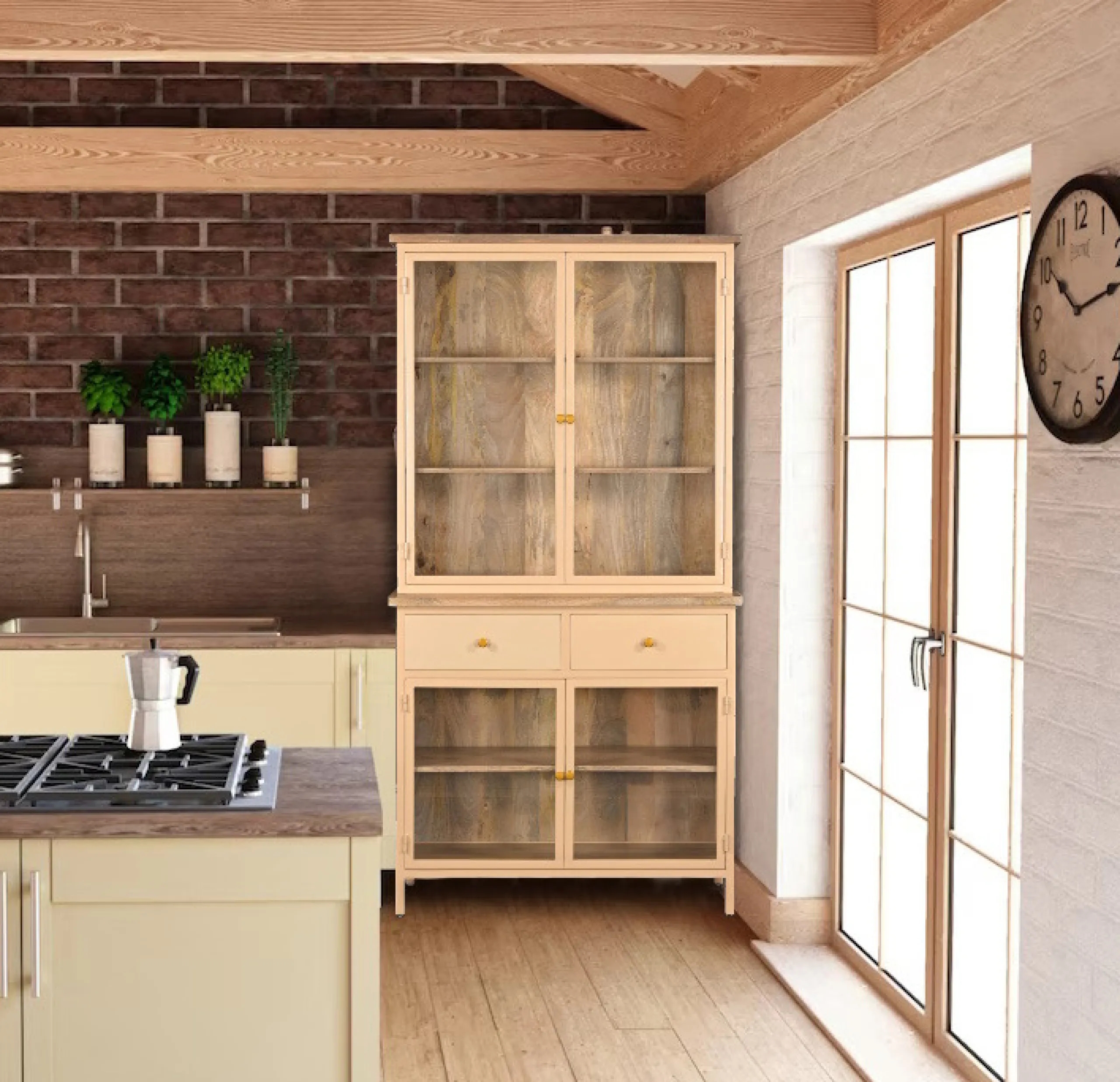 Die Vitrine Provence ist ein wahr gewordener Retro-Traum aus Metall, Holz und Glas! Sie entfaltet ihre besondere Raumwirkung durch das gekonnte Zusammenspiel von Farben und Materialien. Der Korpus ist komplett aus Metall, das Innenleben aus wunderschön gemasertem Mangoholz. Die zahlreichen Glaselemente verleihen eine außergewöhnliche Transparenz. Der Schrank bringt im Wohnzimmer wertvolle Bücher und Kunstobjekte, kostbare Sammler- und geliebte Erinnerungsstücke stilvoll zur Geltung, im Speisezimmer oder der Küche präsentiert er edles Porzellan und Kristallglas. Zusätzlichen Stauraum bieten die beiden Schubladen. Abgerundet wird das Ganze mit goldenen Griffen. Und der ganz große Auftritt ist dank der Farbgebung garantiert sicher! Die Vitrine wird für den leichteren Transport zweiteilig geliefert.