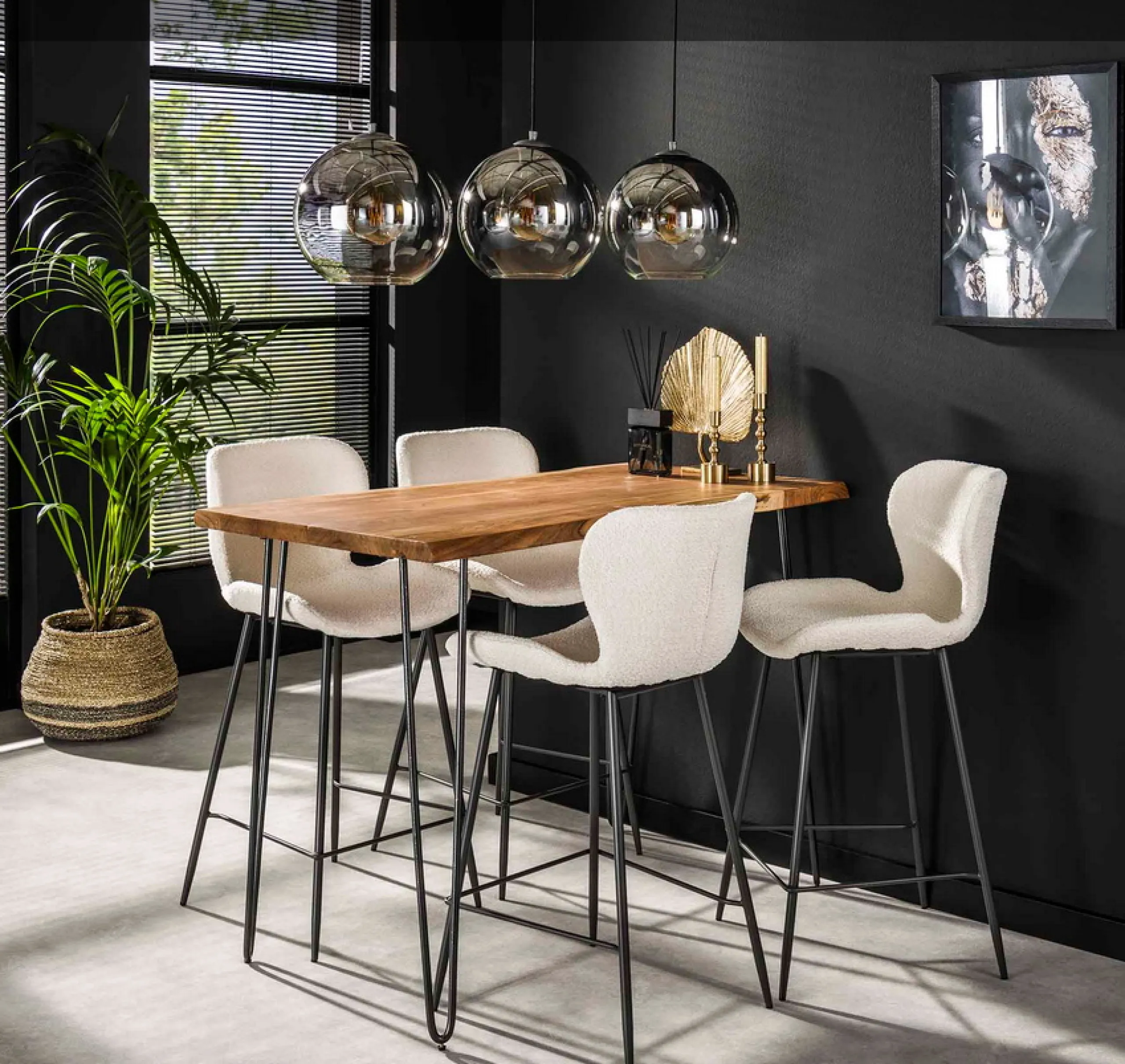 Der Bartisch Palu ist der ideale Begleiter für Ihre Küche oder das Esszimmer. Durch seine kompakte Größe findet er leicht seinen Platz und verbreitet den Flair eines Cafes. Das Material und Design kommt im Industrial Look daher. Die wunderbar typische Akazienholzmaserung, sowie die Baumkantenform, machen diesen Tisch zu einem individuellen Industrial Stück. Die Tischplatte ist offenporig klar lackiert, was sie unempfindlich gegen Feuchtigkeit und Schmutz macht. Die schwarzen pulverbeschichteten Haarnadelbeine sorgen durch ihr Design dafür, dass die schwere massive Platte eine gewisse Leichtigkeit erhält.