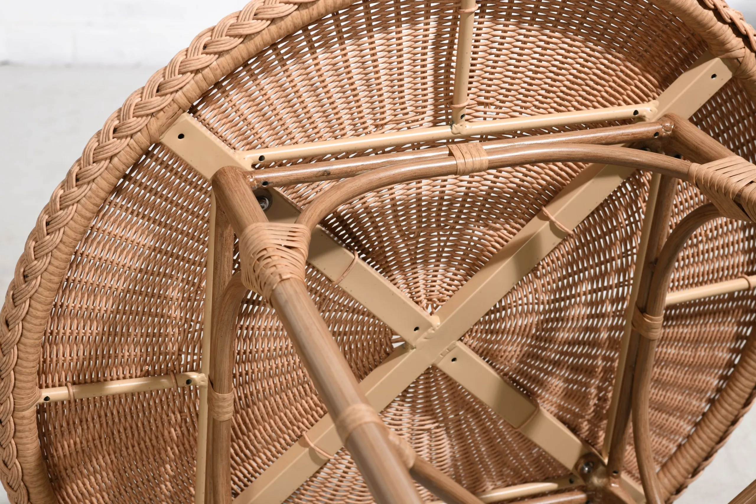 Runder Esstisch mit toller geflochtener Tischplatte, der sowohl drinnen wie draußen ein Urlaubsgefühle aufkommen lässt! Die gekonnt geflochtenen Polyethylenseile in toller Rattanoptik formen den Tisch zu einem Hingucker der ideal zu unseren Cabana Stühlen und Sesseln passt. Die stabilen lackierten Metalleine geben dem Tisch den Stand. Die engmaschige Flechtung ist eine aufwendige Handarbeit die viel Zeit benötigt. Das Ergebnis ist ein hochwertiges Möbel im angesagten Scandi Boho Stil.