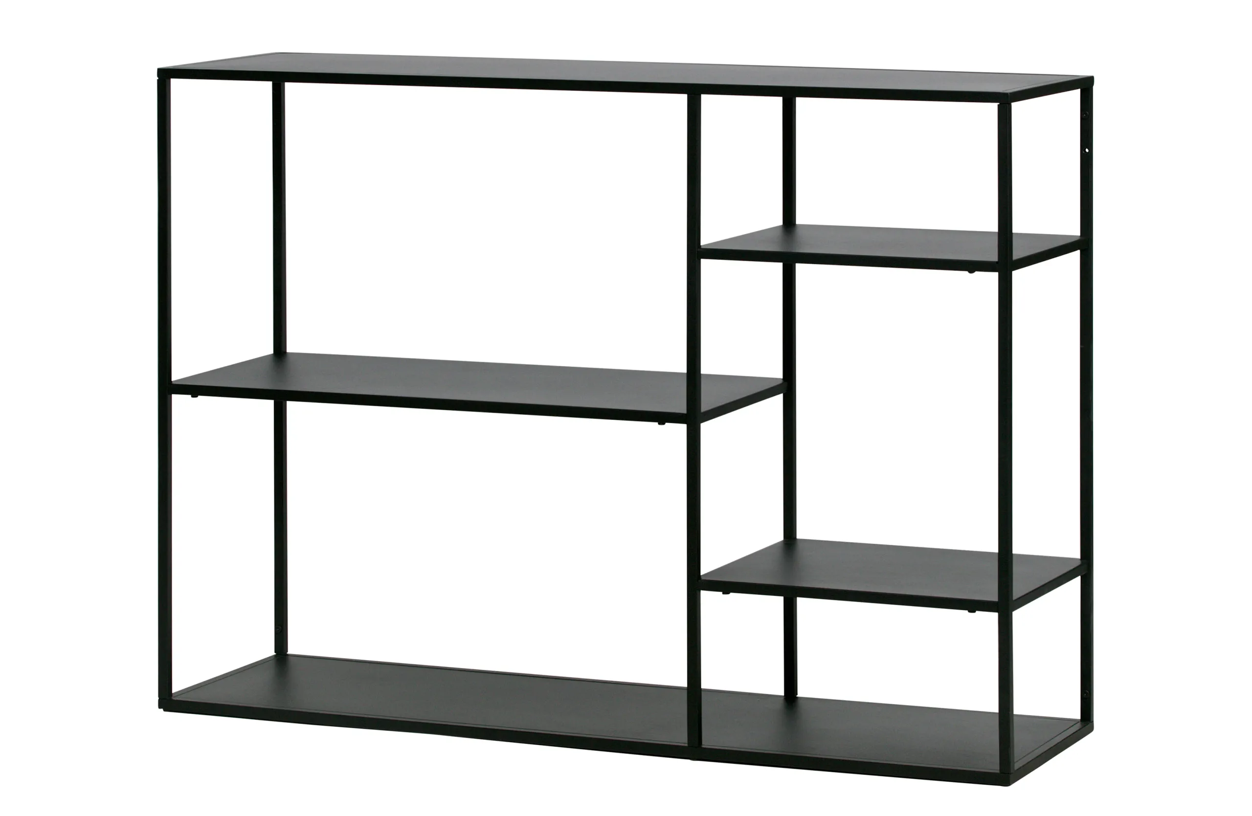 Das Regal Soho June besteht aus einem edlen schwarzen Metallrahmen und fünf Regalböden. Aufgrund der aufgelockerten Einteilung wird das Metallregal zum Blickfang. Durch den beidseitig offenen Aufbau lässt es sich ebenso hervorragend als Raumteiler verwenden. Optisch und funtkionell überzeugt die Soho June Regalreihe auf ganzer Linie.
