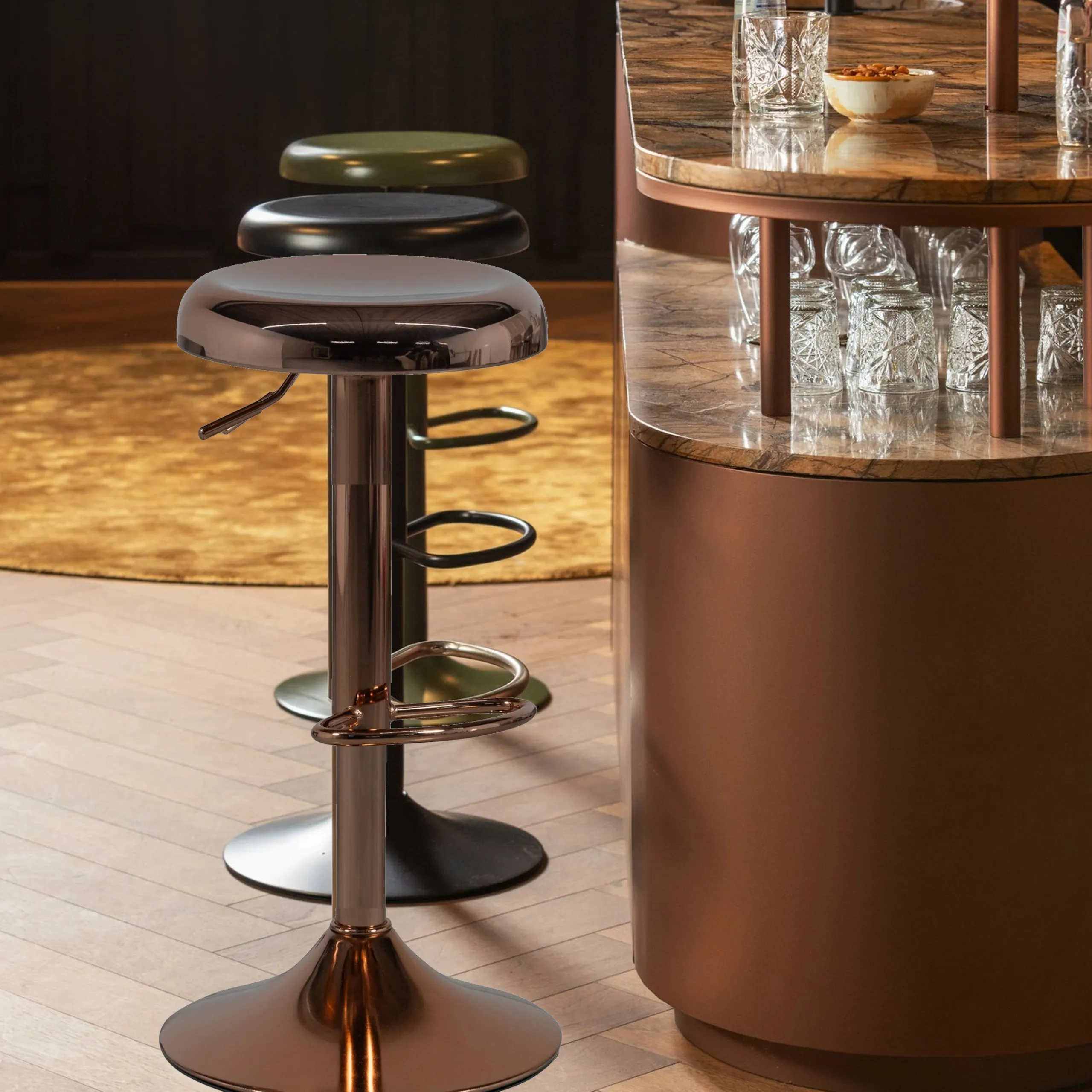 Dank der zeitlosen Farbgestaltung passt dieser Barhocker perfekt in moderne Küchen, Bars oder Loungebereiche. Die Kombination aus glänzendem Metall und matten Elementen verleiht dem Hocker einen edlen, industriellen Look, ideal zum Mischen und Kombinieren!