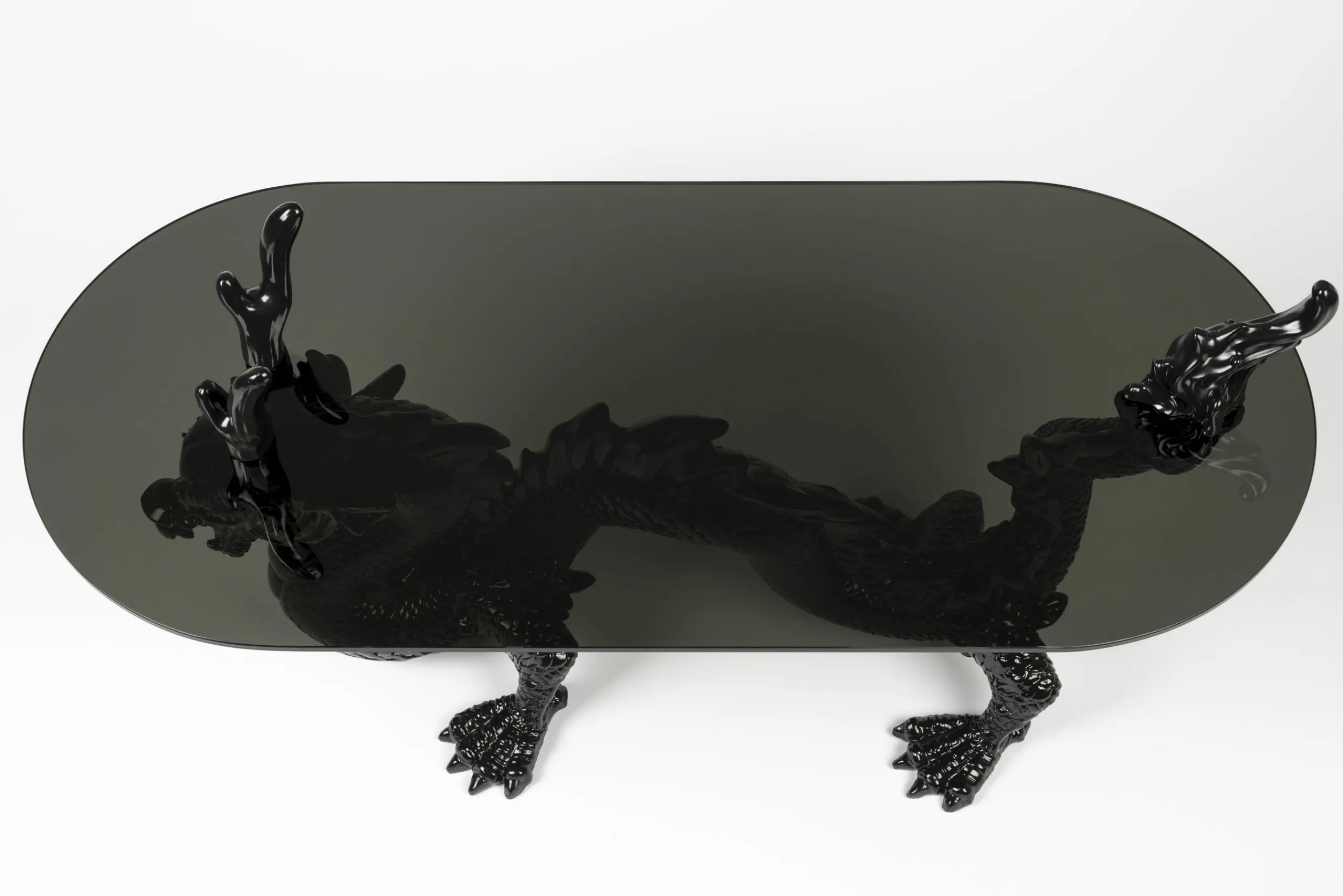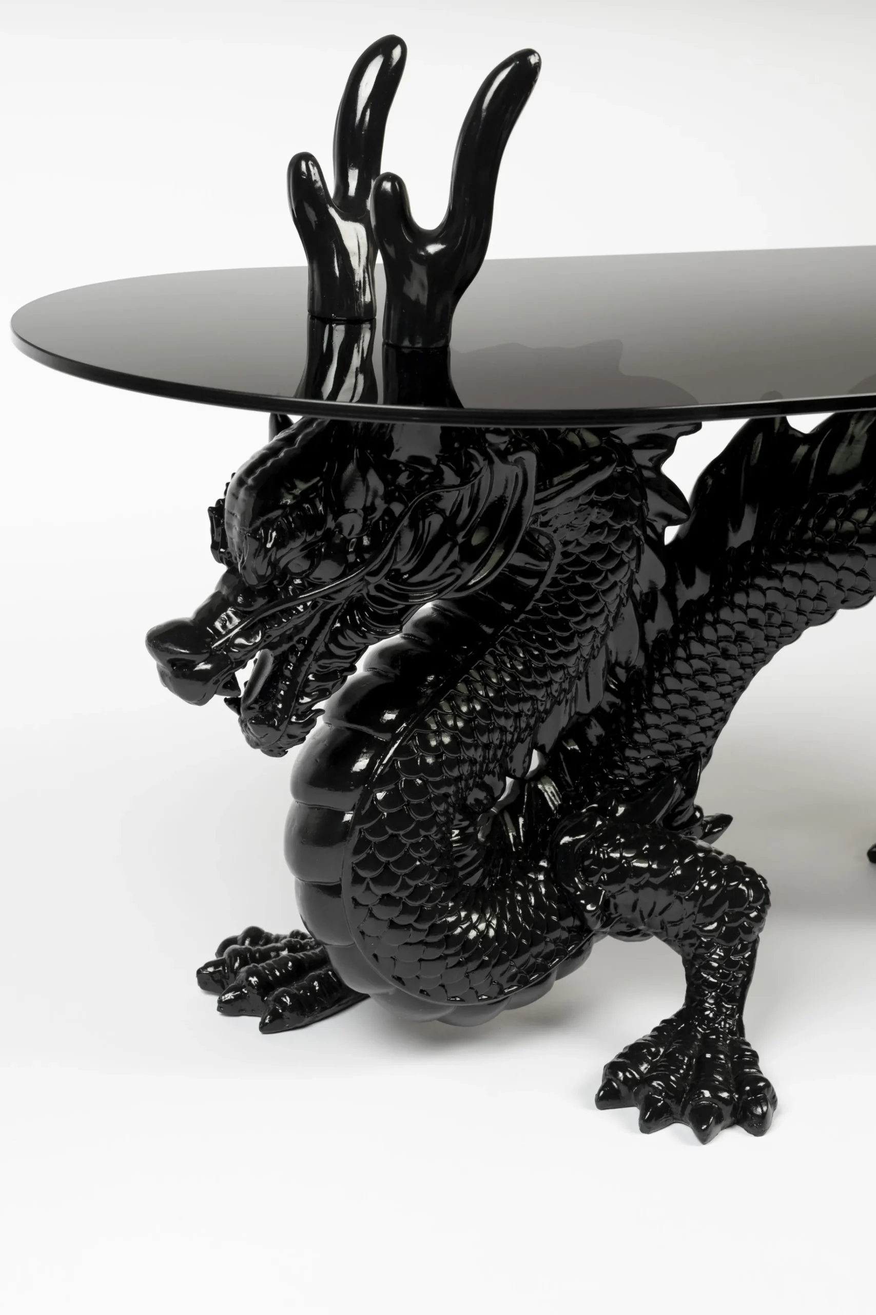 Inspiriert von einem der legendärsten Geschöpfe der chinesischen Mythologie, steht der Drache für Glück, Stärke und Gesundheit. Und jetzt können Sie dies alles in Ihrem Zuhause willkommen heißen, dank des gewagten Tisches von Bold Monkey. Rauchschwarzes Glas trifft auf ausgearbeitete Details, während die Basis des Tisches – unser schwarzer Drache – aus glänzendem Harz besteht. Der Dragonized Couchtisch verleiht einem bereits eklektisch eingerichteten Raum einen Hauch von Spaß oder wird zu einem einzigartigen Blickpunkt in einer ansonsten minimalistisch eingerichteten Wohnung. Dieser glamouröse Beistelltisch ist ein kultiges Sammlerstück für jeden Designliebhaber und der Inbegriff des Bold Monkey Stils: extravagantes Design zu einem erschwinglichen Preis.