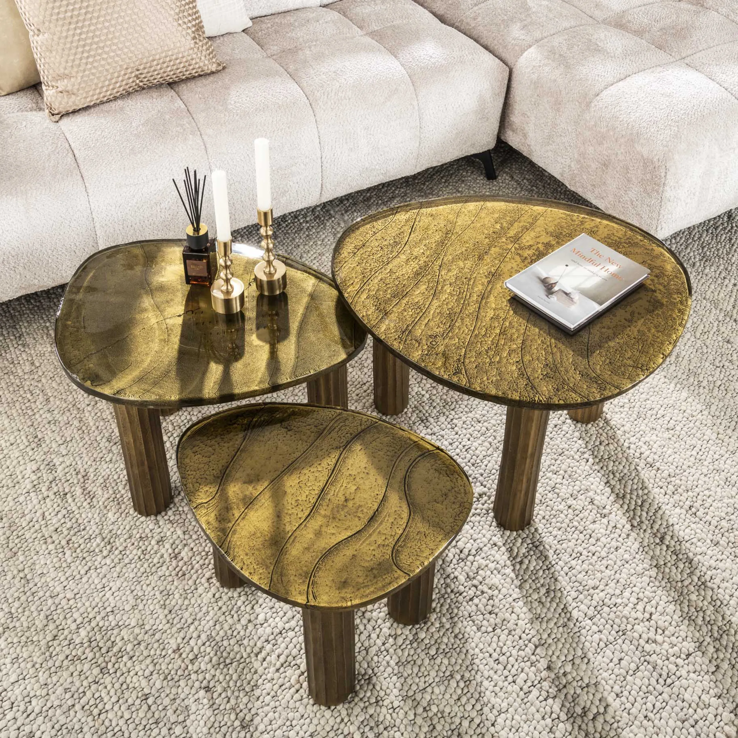 Die unregelmäßigen, organisch geformten Glasplatten ruhen auf soliden Metallfüßen und sind in zwei edlen Farbvarianten erhältlich: Antik-Gold und Antik-Kupfer. Diese warmen, metallischen Töne setzen luxuriöse Akzente und harmonieren perfekt mit verschiedensten Einrichtungsstilen – von modern bis klassisch.