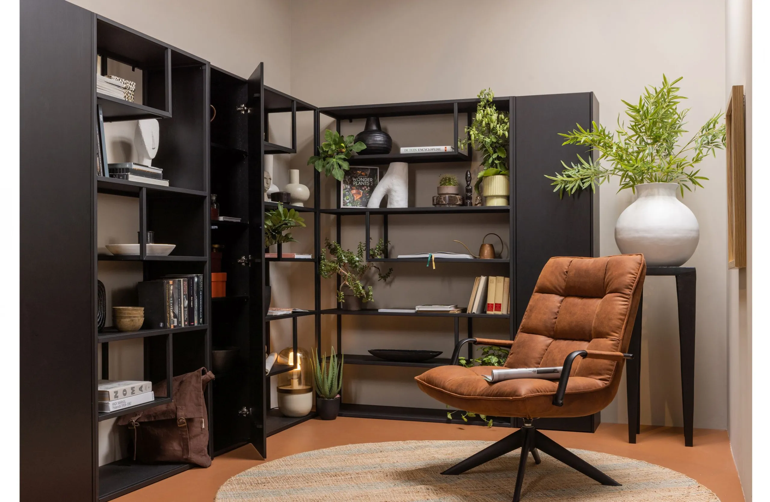 Der Drehstuhl Jouke aus der Kollektion der niederländischen Marke WOOOD hat einen robusten Look und zeichnet sich durch weiche organische Formen und großzügige Armlehnen aus. Jouke lädt Sie zum Entspannen ein! Die Sitzfläche des Drehsessels ist mit einem PU-Ledergewebe gepolstert. Der schlanke Sockel ist aus Metall mit einer schwarzen Pulverbeschichtung. PU-Leder hat ein großzügiges, raues Aussehen. Das Material besteht aus 100% Polyester und fühlt sich sehr weich an und ist sehr farbecht. Im Laufe des Gebrauchs werden Aussehen und Struktur des Gewebes ihre natürlichen Eigenschaften stärker zeigen, was die Haltbarkeit und Qualität nicht beeinträchtigt.