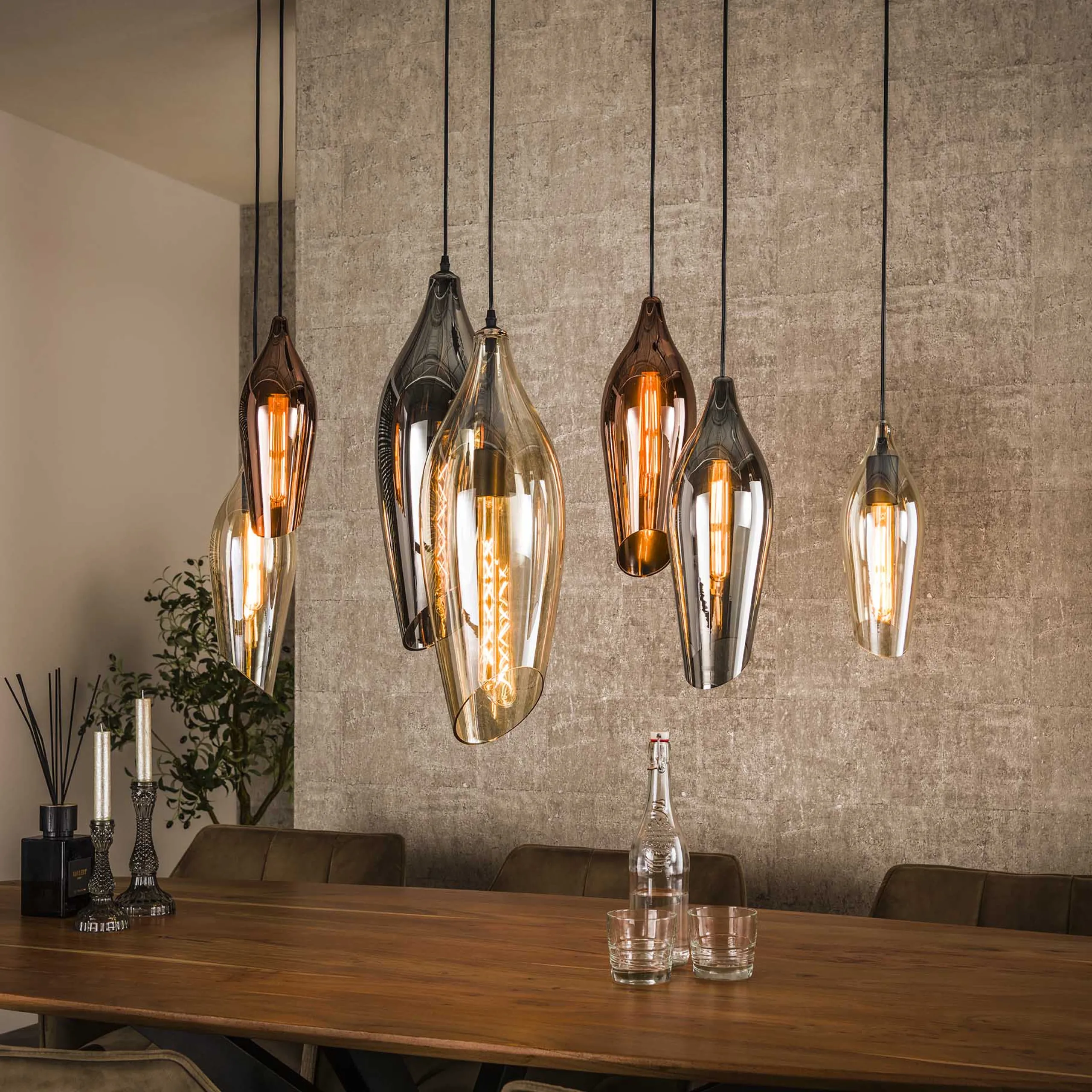 Diese exklusive Hängelampe mit 7 kokonförmigen Glasschirmen verleiht jedem Raum eine stilvolle und moderne Atmosphäre. Die Schirme sind in drei edlen Farben gehalten: Bernstein, Kupfer und Chrom, die ein harmonisches und zugleich dynamisches Farbspiel erzeugen.